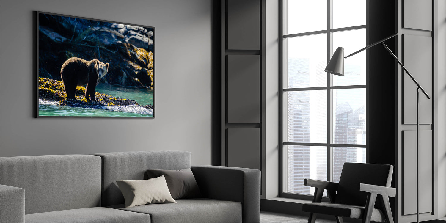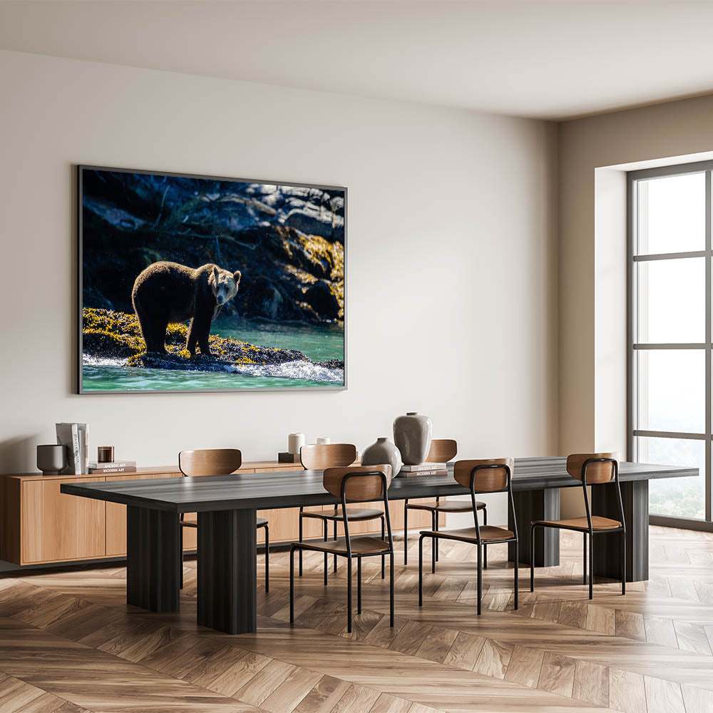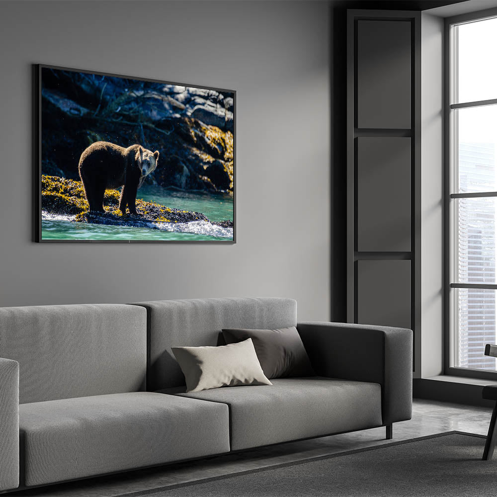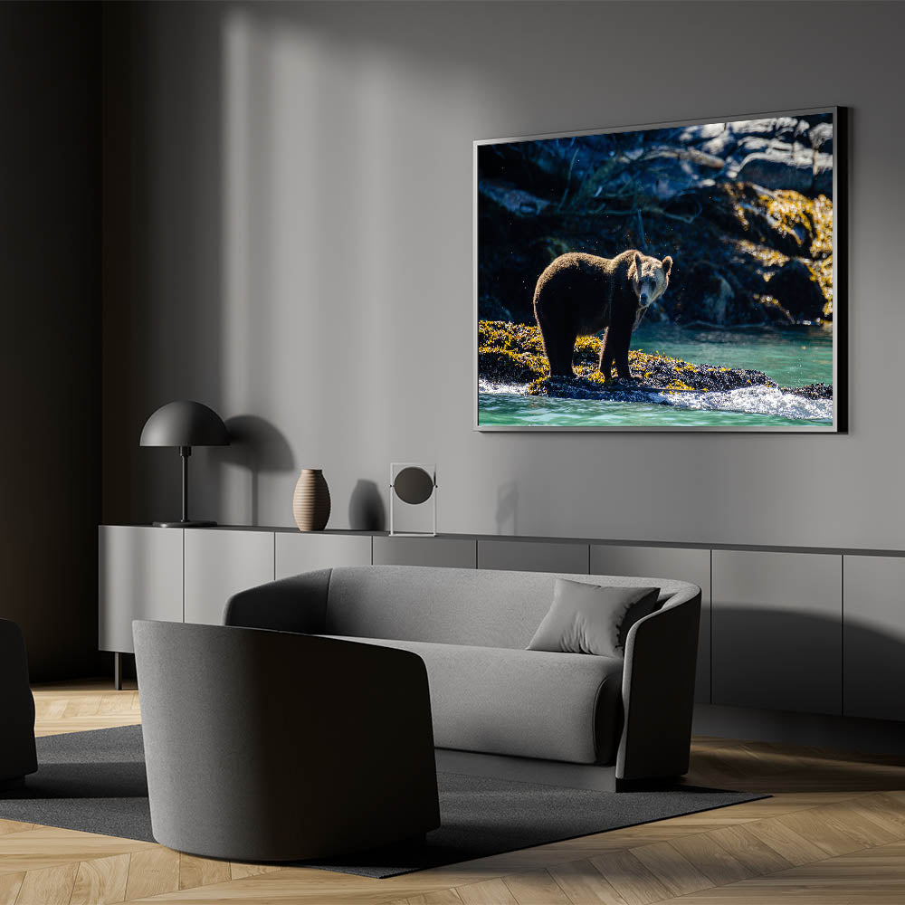 Capture the raw beauty of British Columbia’s wildlife with this stunning bear photography wall art. The majestic bear is seen standing on a rugged, moss-covered coastal rock, with sunlight highlighting its powerful presence. The shimmering water and natural surroundings perfectly reflect the untamed wilderness of the Pacific Northwest, offering a glimpse into the untouched beauty of Canada’s natural world. This artwork is perfect for wildlife enthusiasts and nature lovers, adding a sense of adventure and wildness to any space.