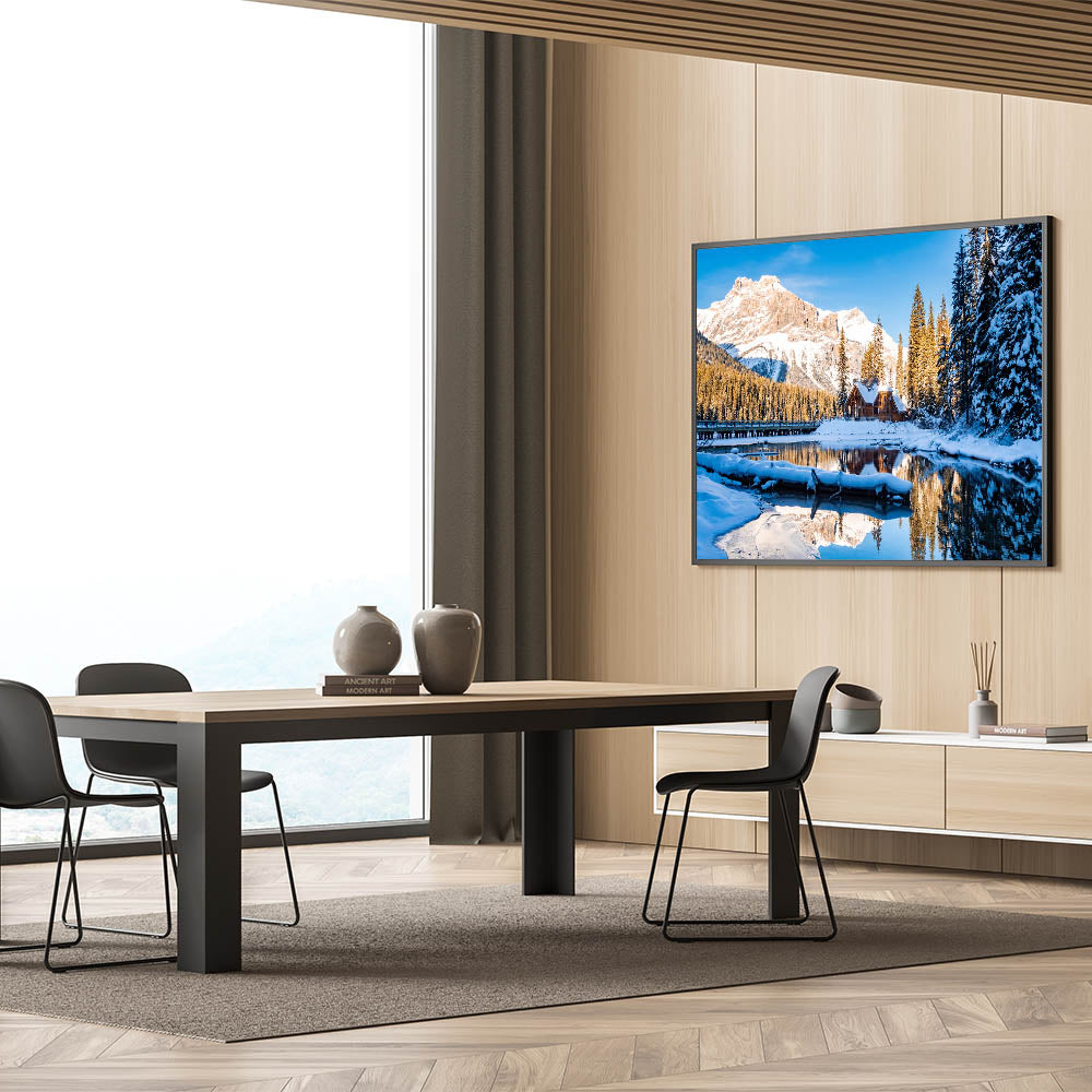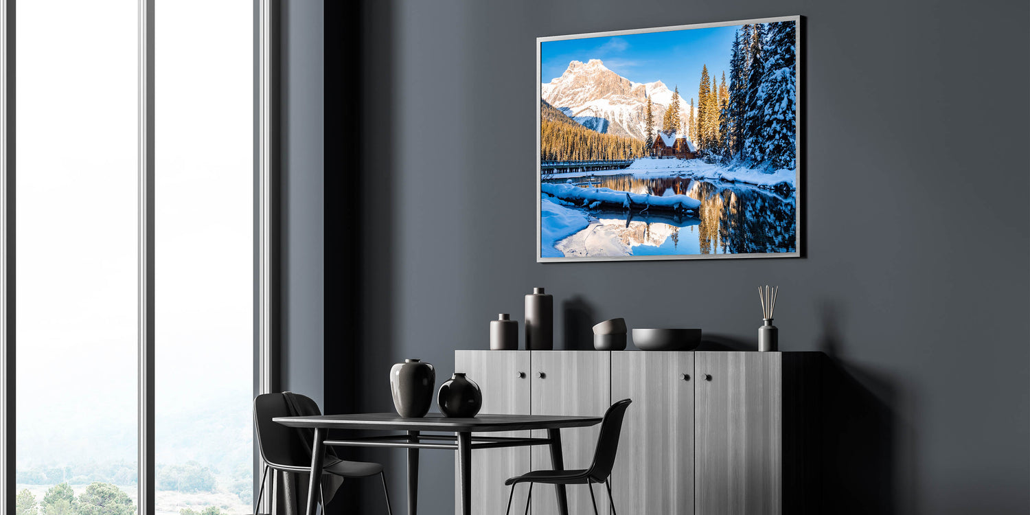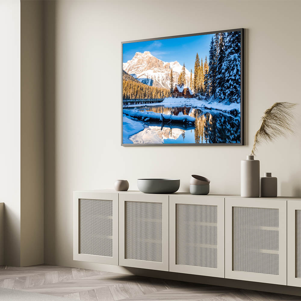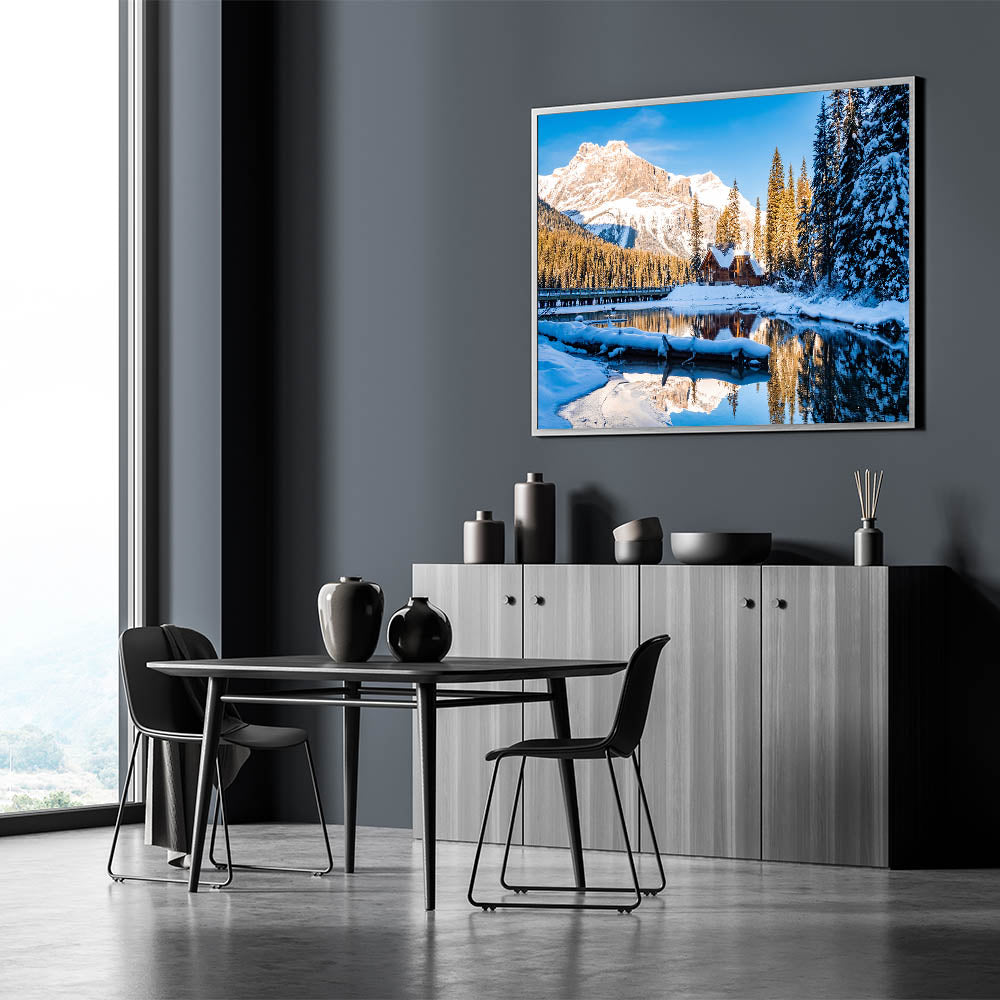 Experience the serene beauty of British Columbia with this captivating winter scene. Featuring a cozy cabin surrounded by snow-covered trees and reflecting in a calm, icy lake, this wall art captures the peaceful essence of a winter wonderland. The snow-capped Rocky Mountains stand proudly in the background, adding depth and grandeur to the scene. This stunning artwork is a perfect addition for anyone looking to bring the magic of the Canadian wilderness into their home.