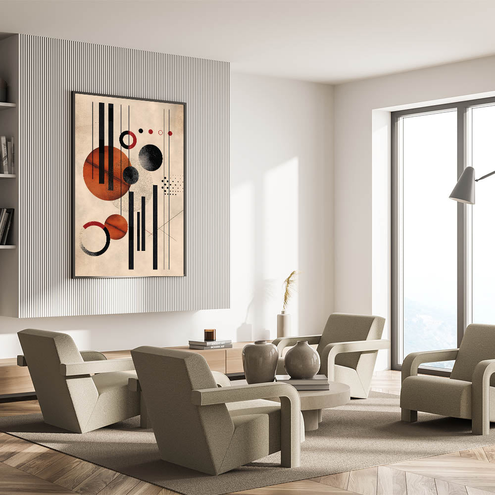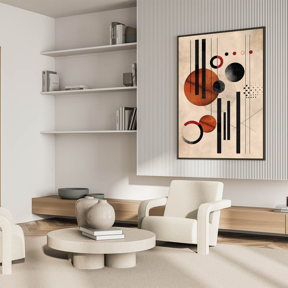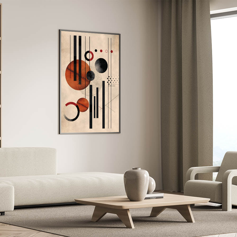 This bohemian wall art piece combines geometric precision with rich earthy tones, making it a perfect statement piece for modern, eclectic interiors. The interplay of bold black lines, rust orange circles, and textured details create a visually striking design that adds depth and complexity to any room. With its abstract composition, this boho decor canvas is ideal for those looking to introduce an artistic touch with a modern, bohemian vibe.