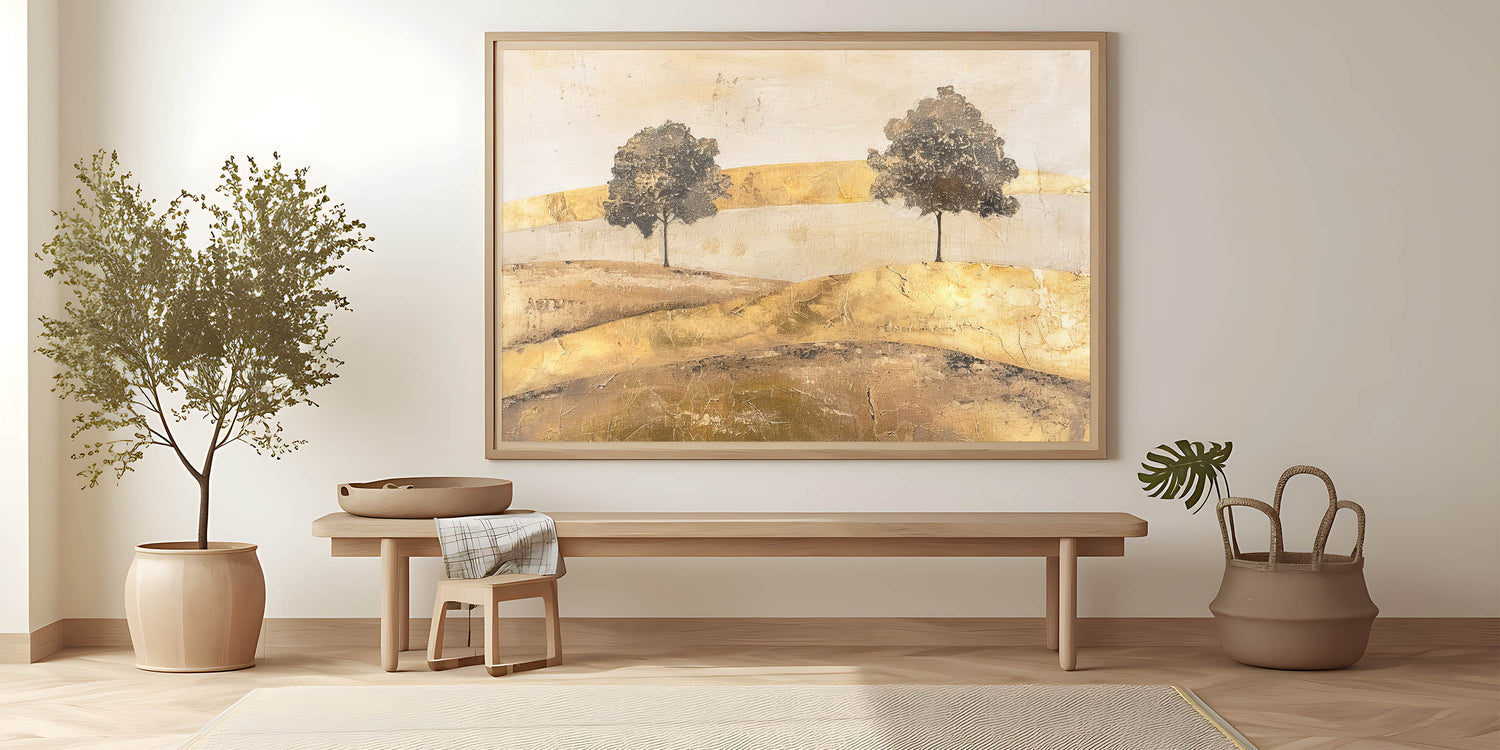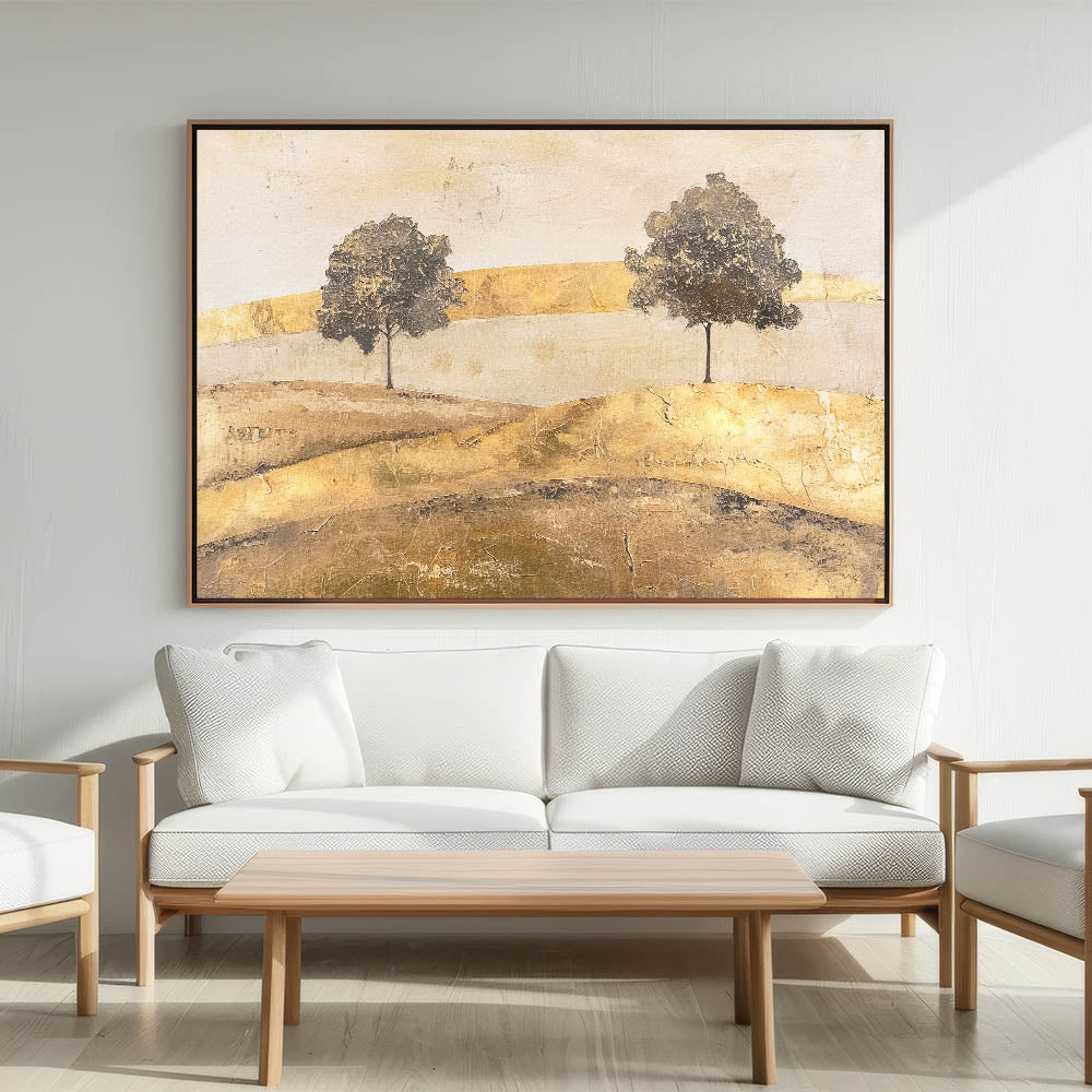 This contemporary landscape print is ideal for living rooms, dining rooms, or offices. The blend of gold and natural tones captures the beauty of nature in an abstract style, creating a serene yet elegant vibe that complements both modern and classic decor.