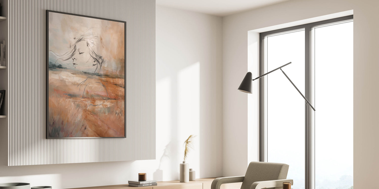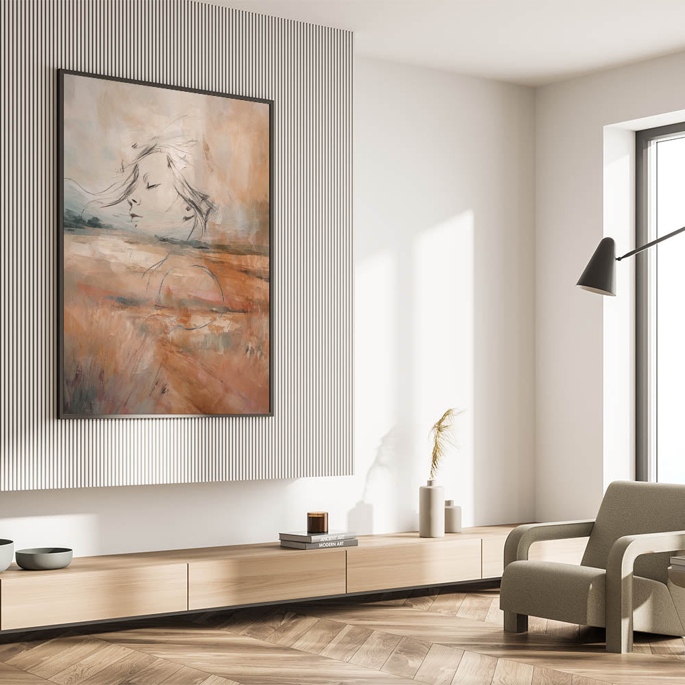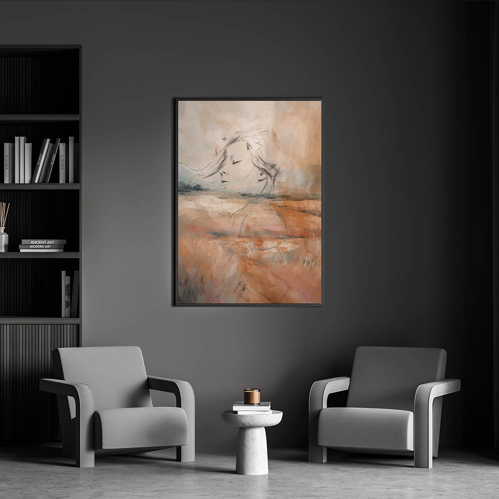 Add a touch of ethereal beauty to your home with this abstract minimalist portrait. Featuring a serene female face delicately sketched into a dreamy landscape, this artwork combines nature and human form in a uniquely harmonious composition. The soft blend of earthy tones and pastel colors creates a calm and reflective mood, making it a perfect addition to modern interiors.