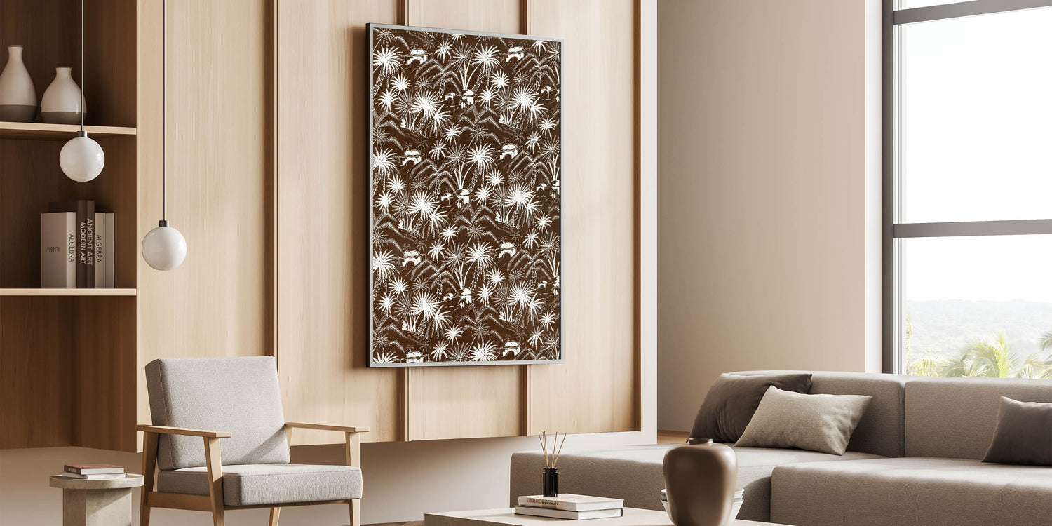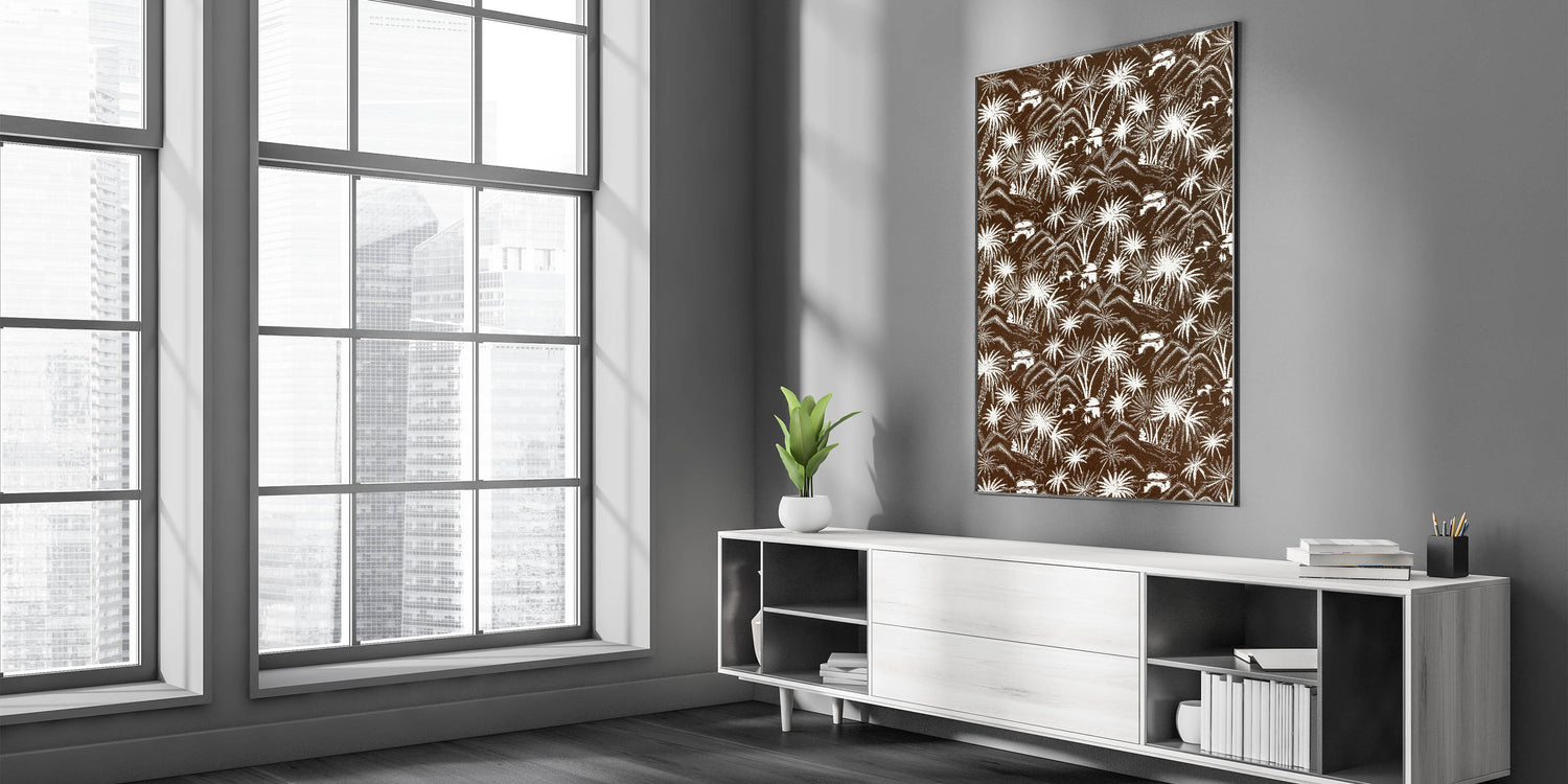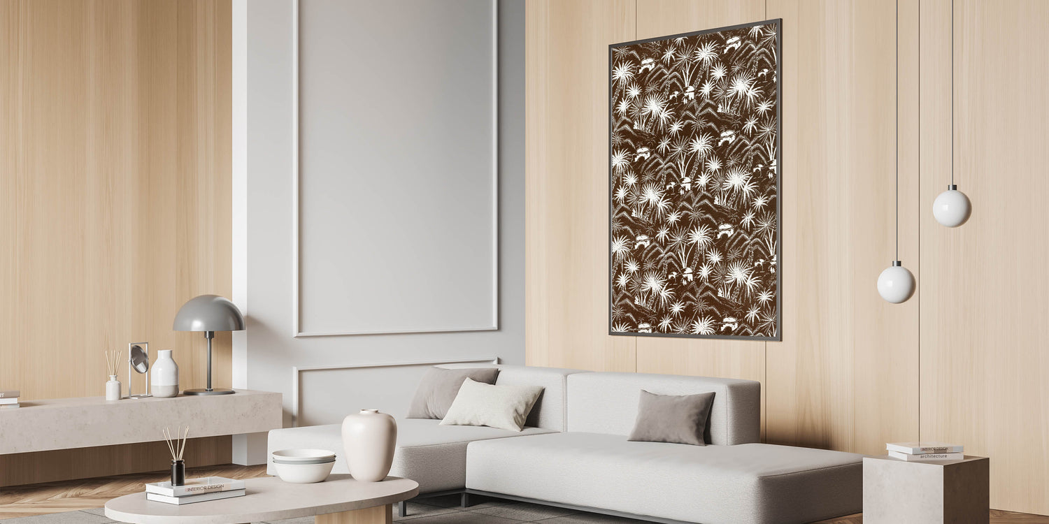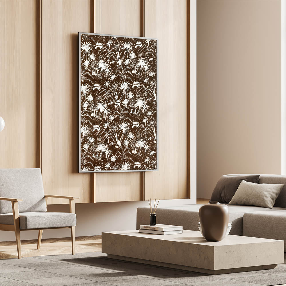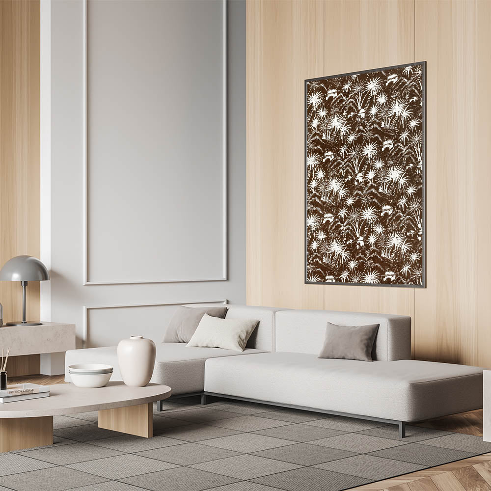 Transform your space with this stunning Art Deco wall art, featuring an elegant palm grove pattern in earthy brown and white tones. This unique design captures the timeless allure of 1920s Art Deco style, making it the perfect choice for vintage and modern interiors alike.