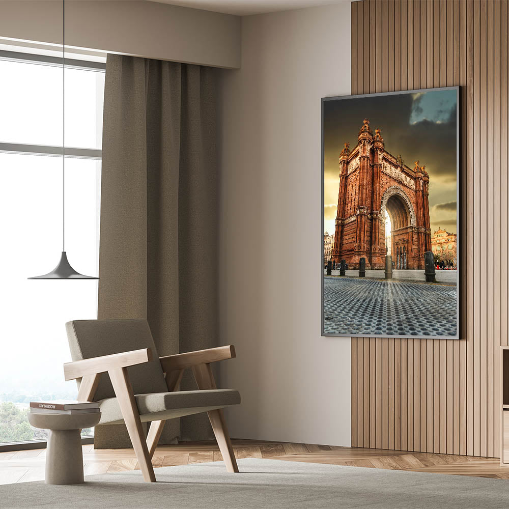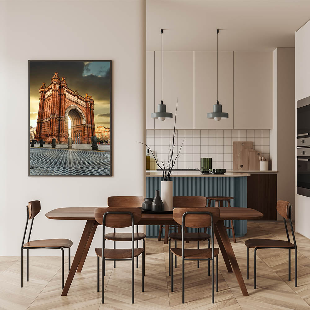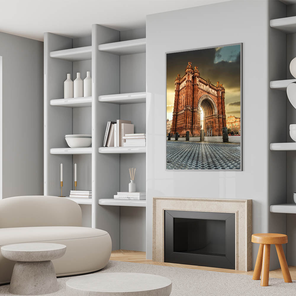 Capture the grandeur of Barcelona’s iconic Arc de Triomf with this stunning Barcelona photography print, showcasing the monumental arch bathed in the warm hues of sunset. The intricate architectural details and deep red brickwork contrast beautifully against the glowing sky, making this piece of Barcelona wall decor a striking focal point for any space.