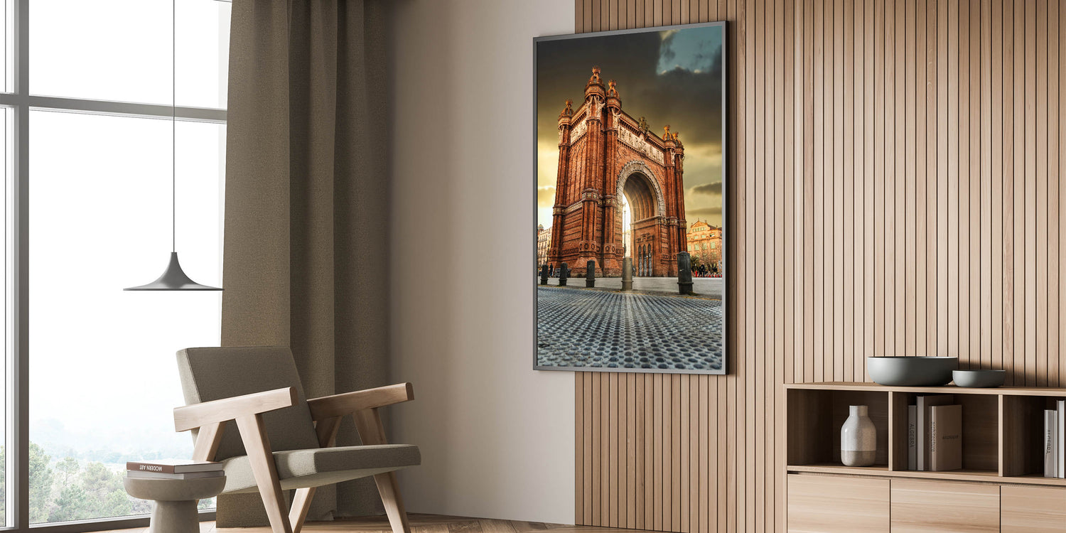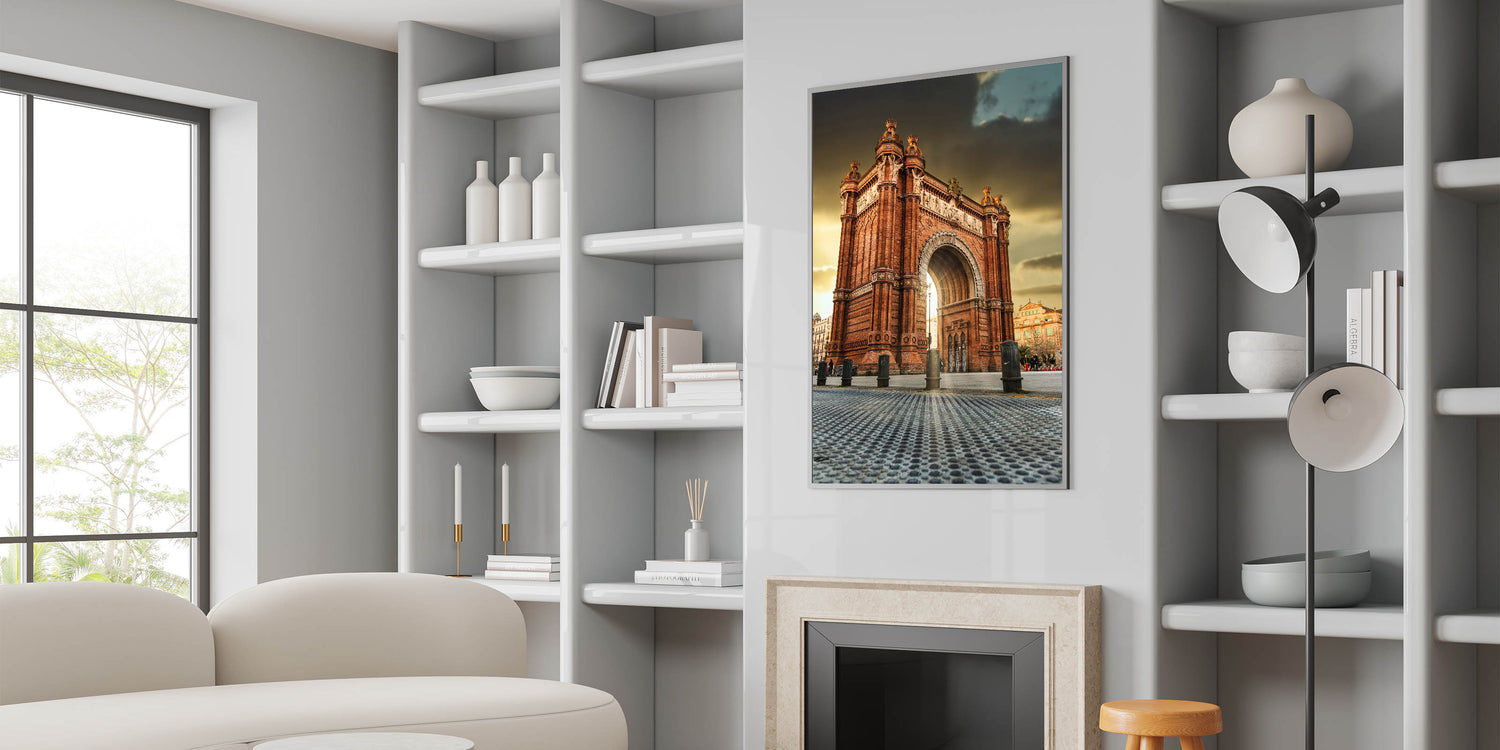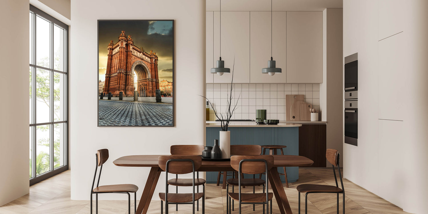 Capture the grandeur of Barcelona’s iconic Arc de Triomf with this stunning Barcelona photography print, showcasing the monumental arch bathed in the warm hues of sunset. The intricate architectural details and deep red brickwork contrast beautifully against the glowing sky, making this piece of Barcelona wall decor a striking focal point for any space.
