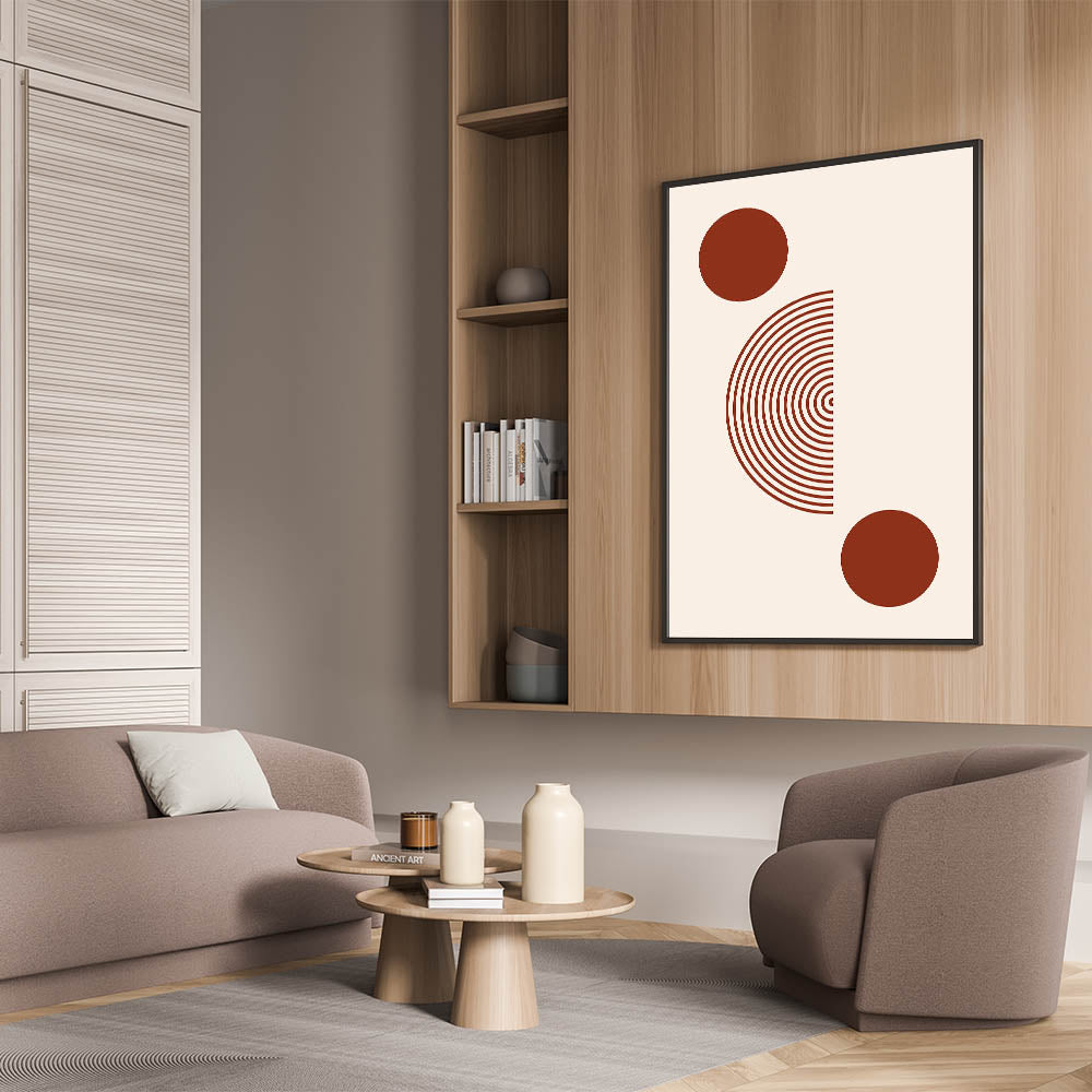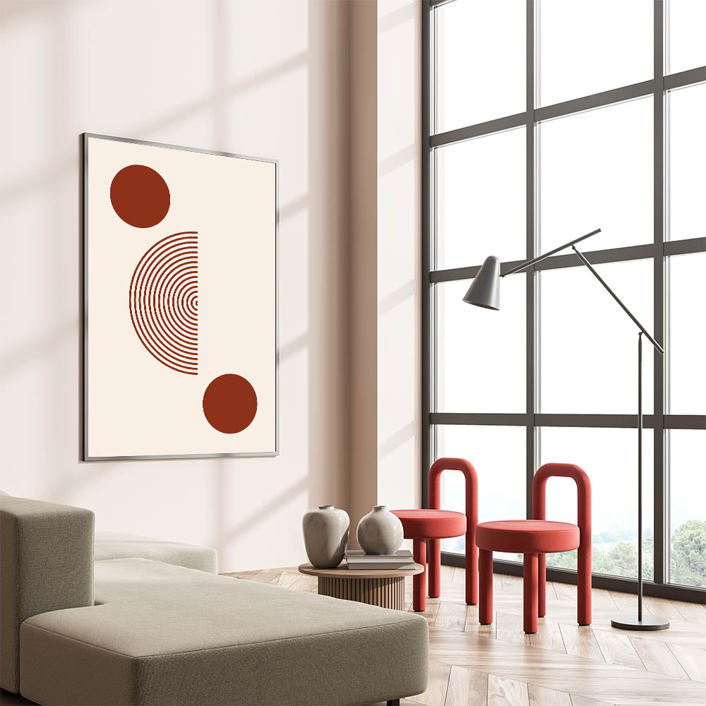 Enhance your living space with this bold bohemian wall art featuring a striking rust color and geometric patterns. The combination of concentric circles and solid shapes creates a captivating design, perfect for adding a modern boho chic vibe to your home decor. This handcrafted bohemian canvas is ideal for those who appreciate minimalist yet artistic pieces that make a statement in any room.