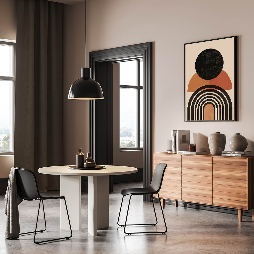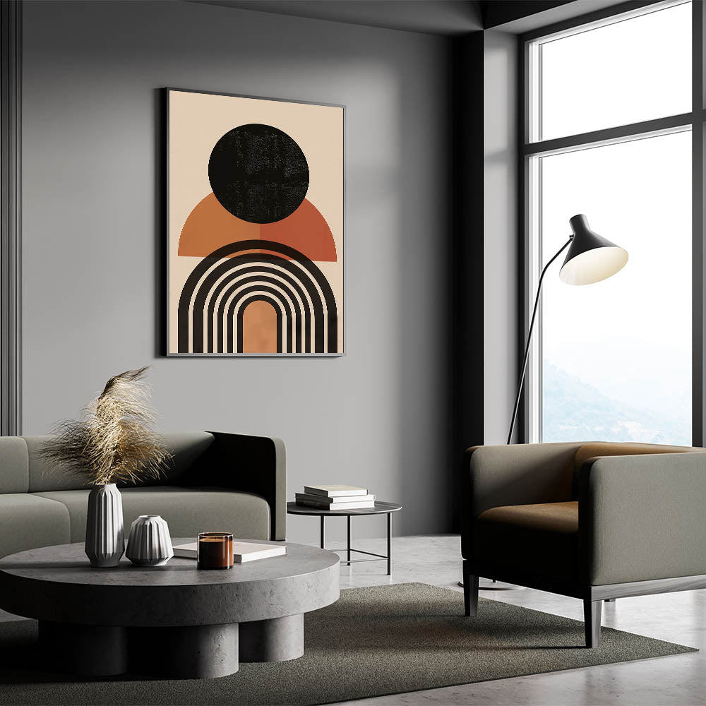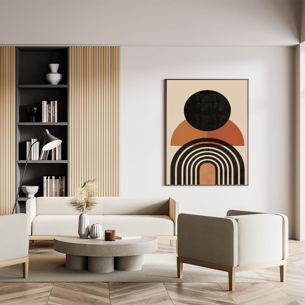 This captivating Bohemian wall art features an abstract geometric design with bold circles and arches in warm, earthy tones, creating a stunning focal point for any space. The minimalist structure of this artwork blends seamlessly into modern and eclectic home interiors, making it the perfect addition for those looking to enhance their decor with a unique boho chic aesthetic.
