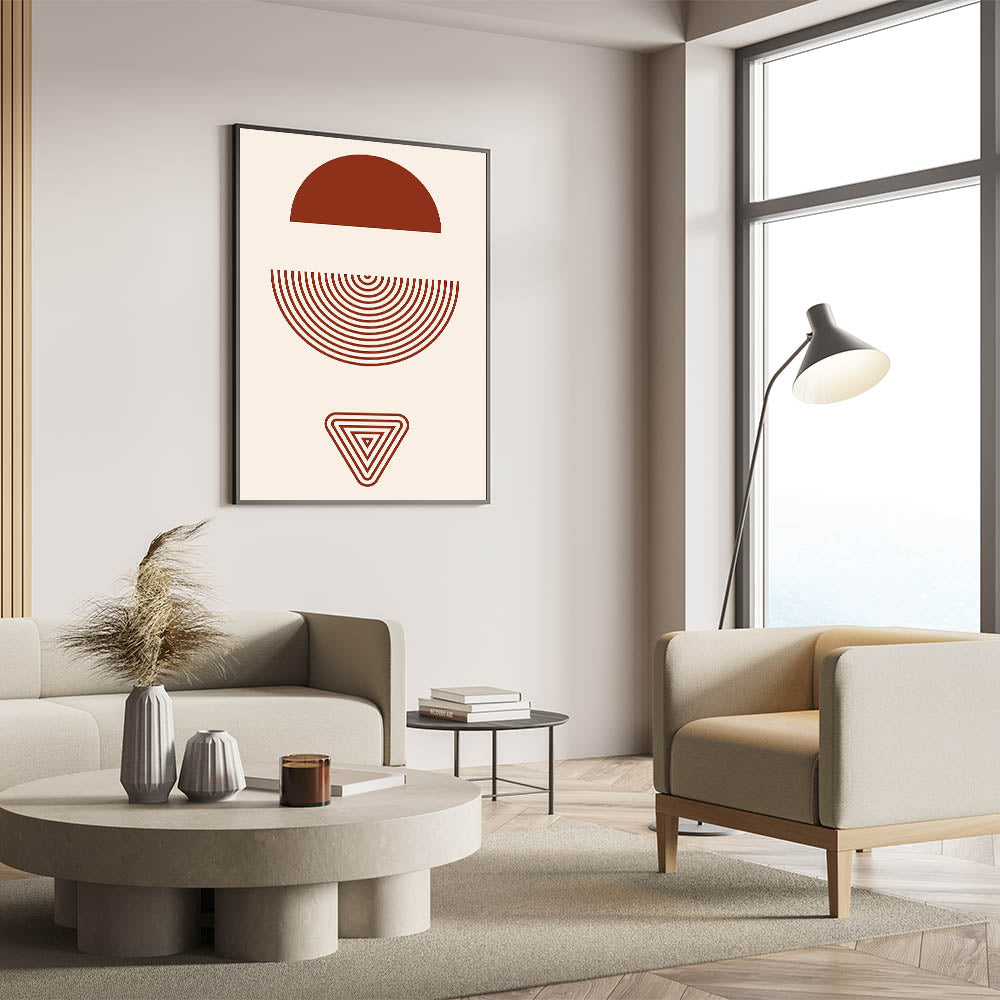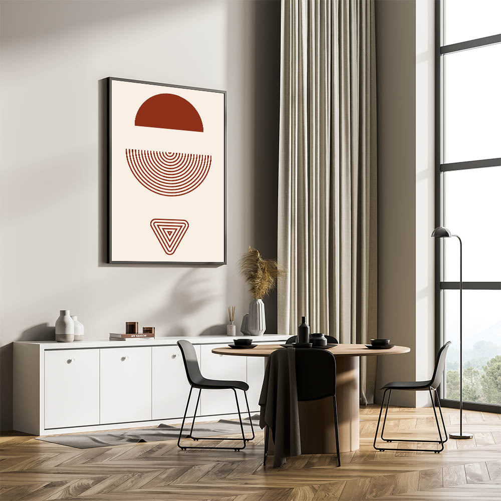 Bring a unique bohemian vibe into your home with this eclectic geometric wall art, featuring a bold rust color that blends perfectly with modern boho chic decor. The combination of circular and triangular patterns creates a harmonious design, adding both artistic flair and symmetry to your space. This bohemian canvas print is perfect for creating a warm and inviting atmosphere, while maintaining a sophisticated and contemporary look.