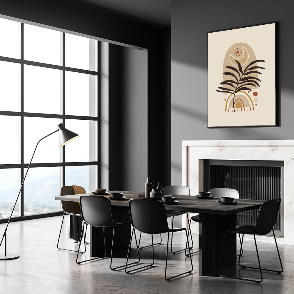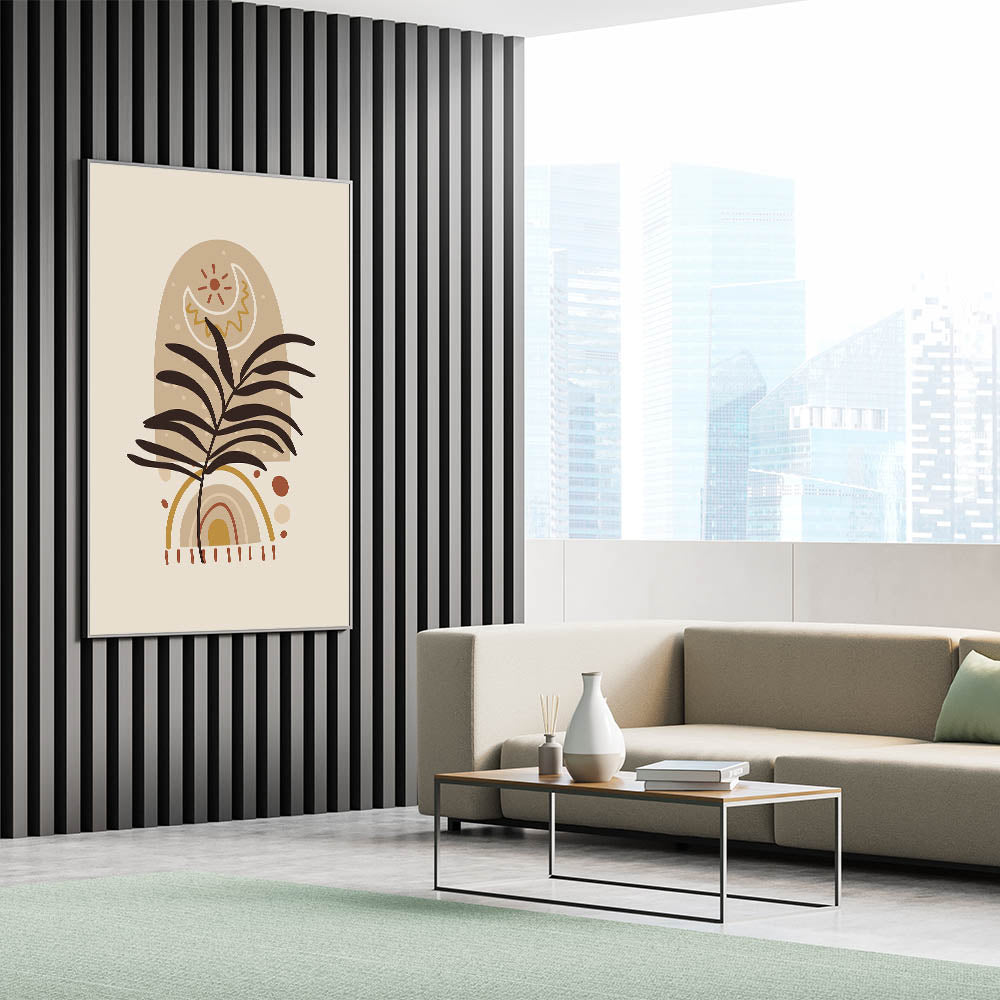 Brighten your home with this captivating Bohemian wall art featuring an abstract sun, moon, and plant design. The combination of earthy tones, including beige, mustard, and rust, creates a warm, inviting aesthetic, perfect for boho chic interiors. This eclectic print adds a playful, yet sophisticated, element to any living room, bedroom, or office, effortlessly enhancing your space with its unique artistic flair.
