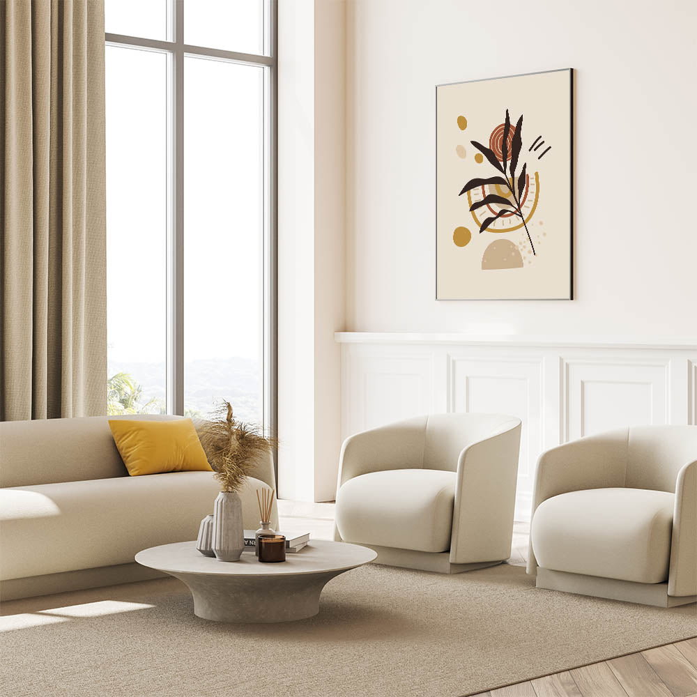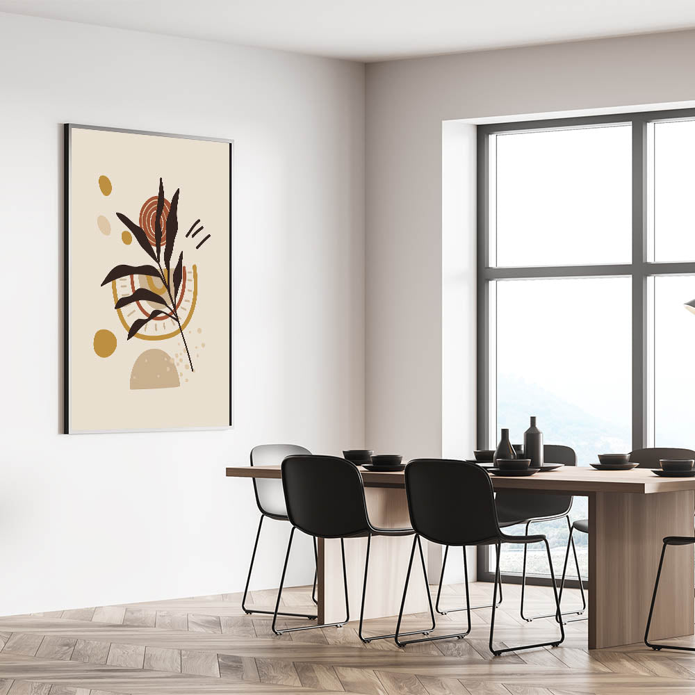 Bring a bold statement to your walls with this eclectic Bohemian wall art. The abstract design features a modern combination of geometric shapes and natural elements, harmoniously blending warm hues of mustard, beige, and rust with dark accents. This piece exudes artistic bohemian style, making it an ideal decor choice for those seeking to add personality and charm to their home.