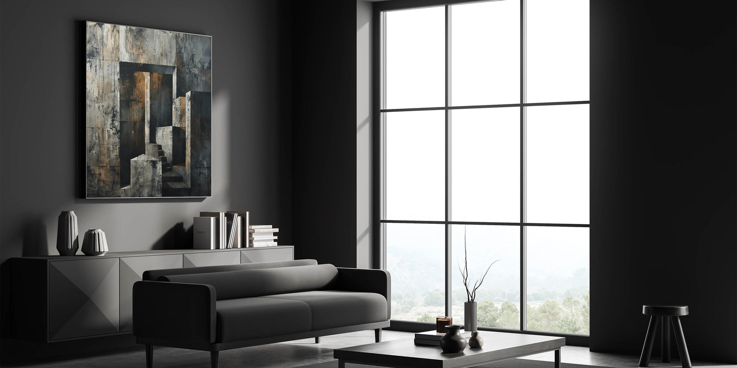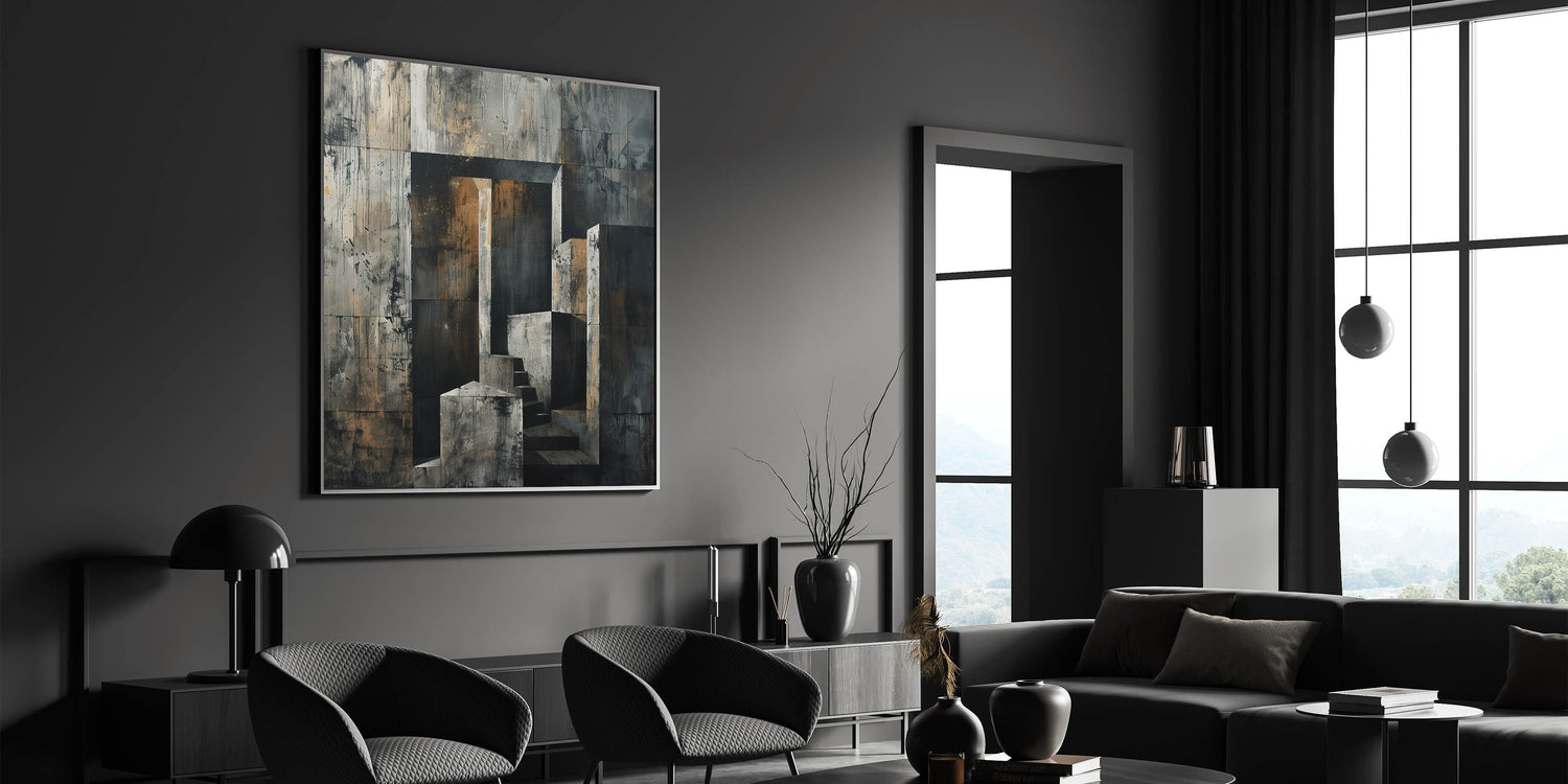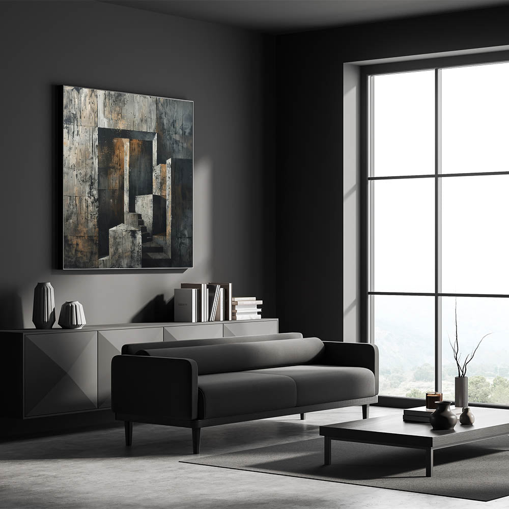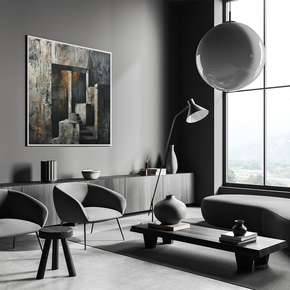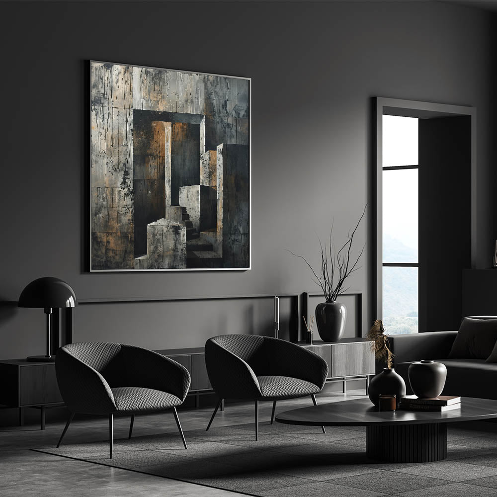 This captivating Brutalist wall art features an abstract depiction of a concrete staircase set against a raw, textured backdrop. The combination of geometric shapes and industrial tones creates a powerful aesthetic that reflects the essence of Brutalism. The neutral shades of gray, accented by touches of earthy brown, make this piece a perfect fit for minimalist and industrial interiors.