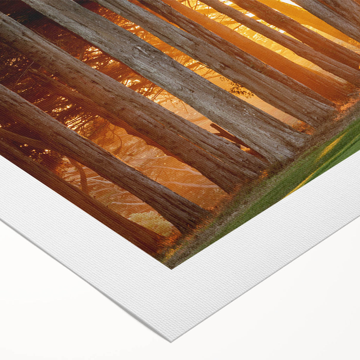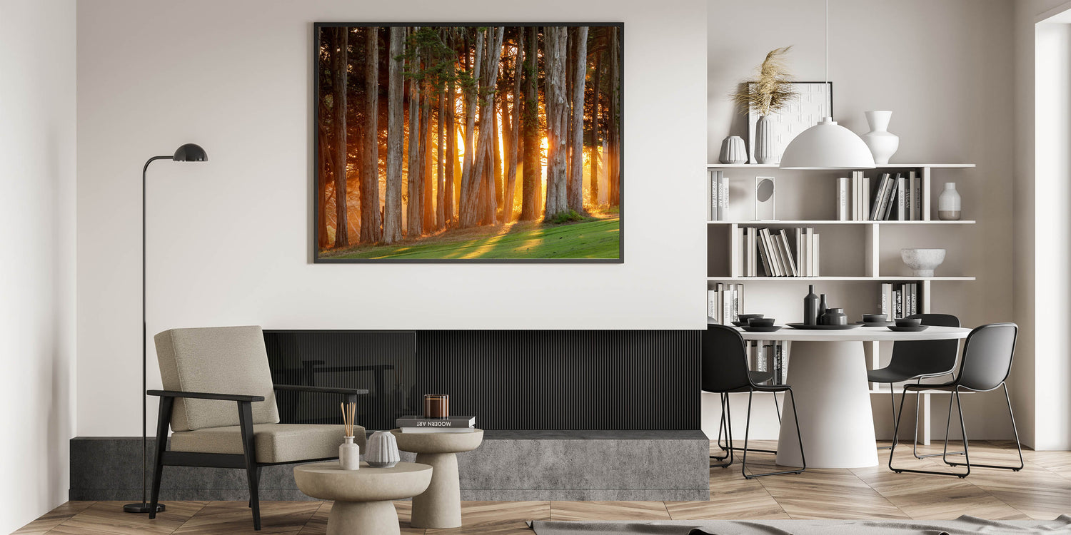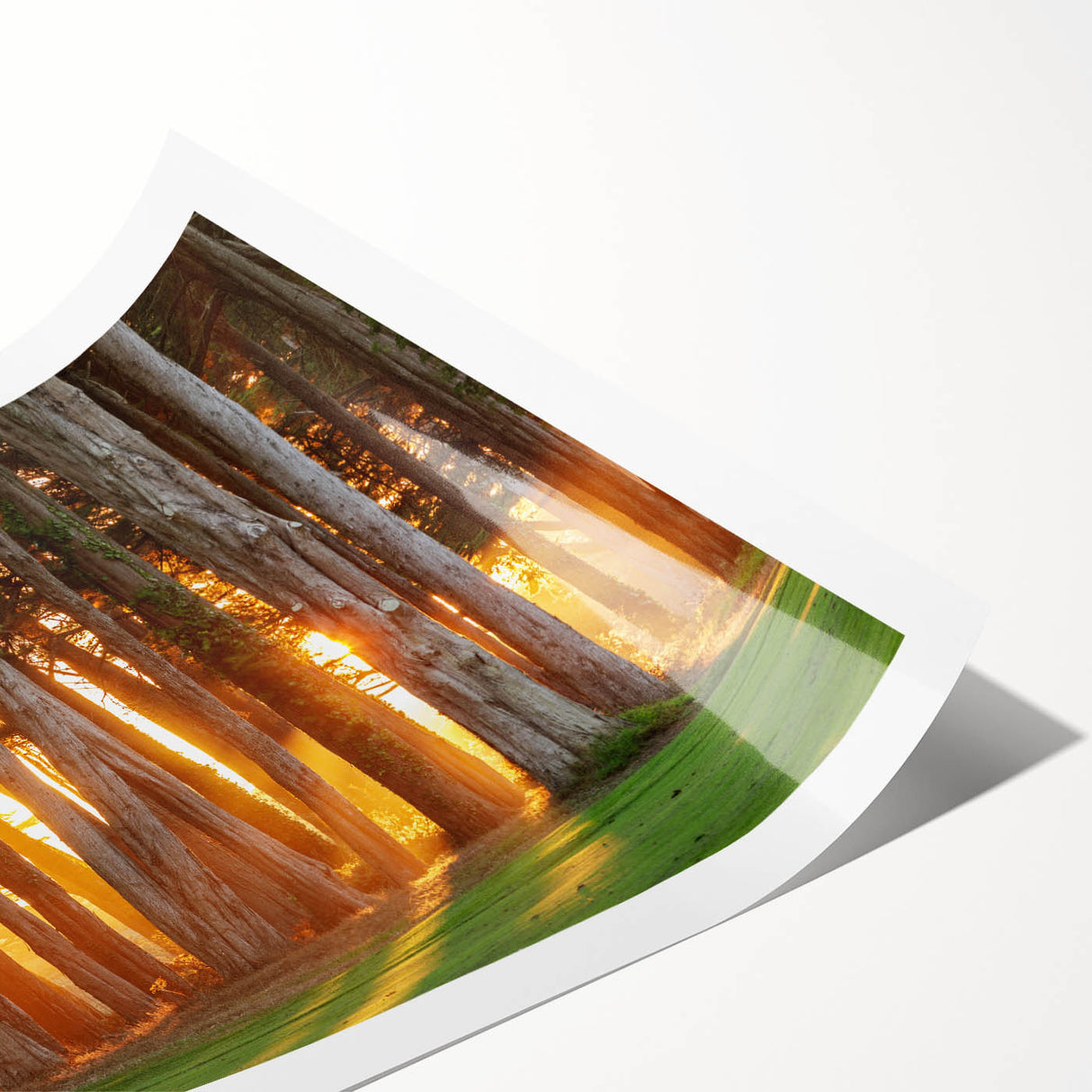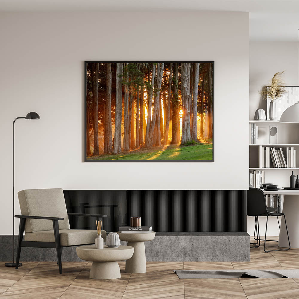 Embrace the beauty of nature with this stunning San Francisco wall art, featuring a forest scene illuminated by the warm glow of the setting sun. The light streaming through the trees creates a captivating ambiance, making it the perfect addition for anyone who loves nature-inspired decor and stunning San Francisco landscapes. Ideal for adding a touch of tranquility to any room, this piece captures the peaceful charm of California's natural scenery.