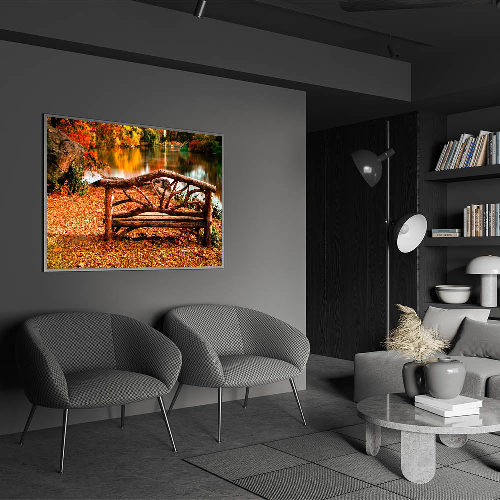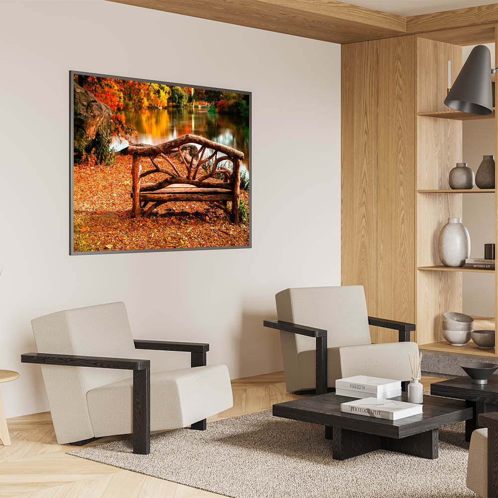 Embrace the warmth and beauty of autumn in Central Park with this stunning wall art. Featuring a rustic wooden bench set against vibrant fall foliage, this high-quality Central Park photography captures the peaceful atmosphere of the park as the leaves turn golden and red. Perfect for lovers of Central Park framed art and those who enjoy the colors of the fall season, this piece adds a cozy and inviting touch to any room.