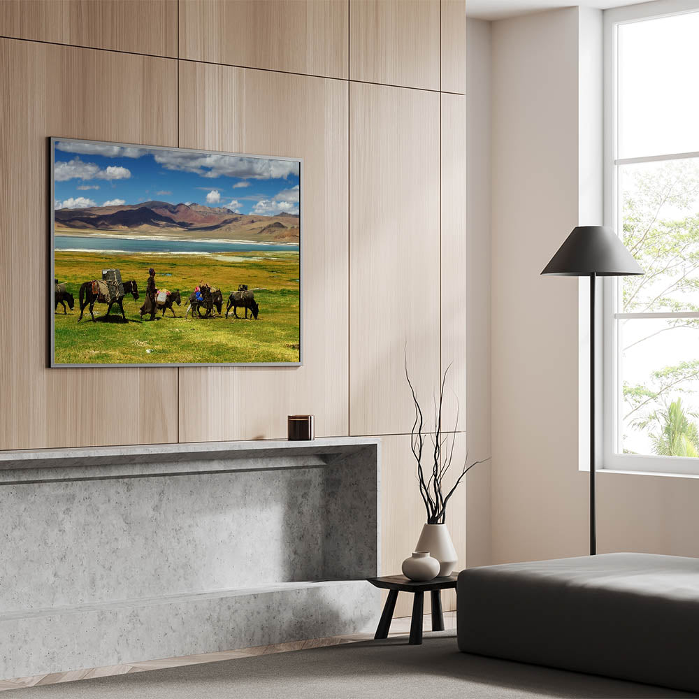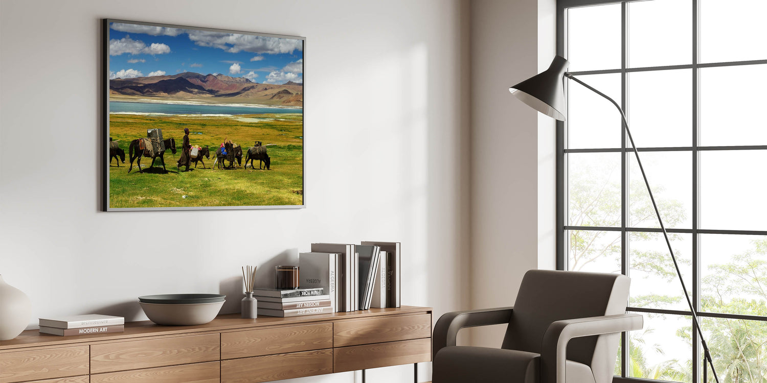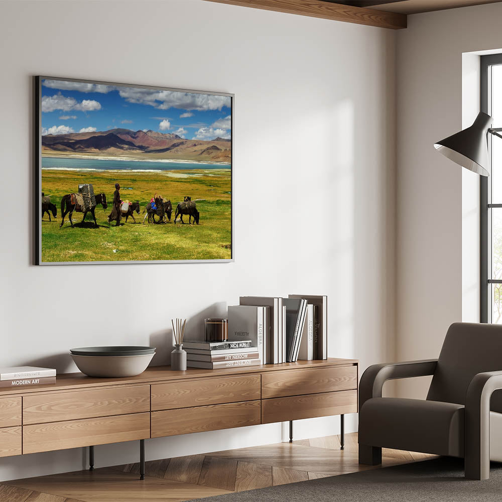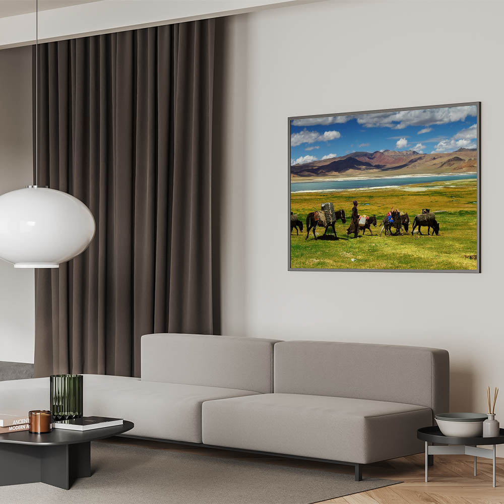 Experience the traditional beauty of Tibetan nomadic life with this stunning wall art, capturing the essence of everyday life in the remote landscapes of Tibet. Featuring a caravan of Tibetan herders alongside a serene lake with a mountainous backdrop, this artwork showcases the rich cultural heritage and scenic beauty of the region. It’s a perfect piece for those who appreciate cultural landscapes and wish to bring a unique regional touch to their decor.