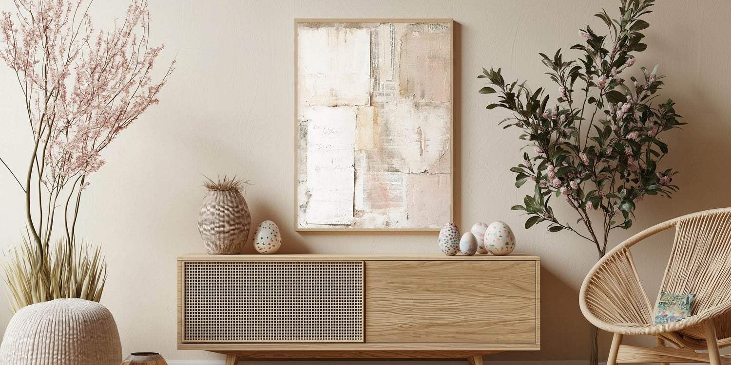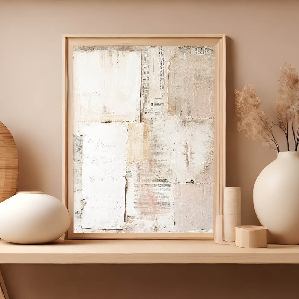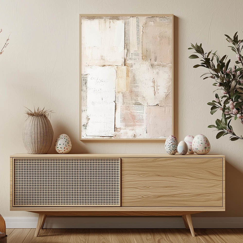 Enhance your home decor with this elegant Easter wall art featuring a vintage-inspired collage. The design showcases a harmonious blend of textured paper layers, faded script, and muted tones of beige, cream, and blush pink. The subtle distressed look and minimalist composition create a timeless piece, perfect for those who appreciate refined, understated decor.