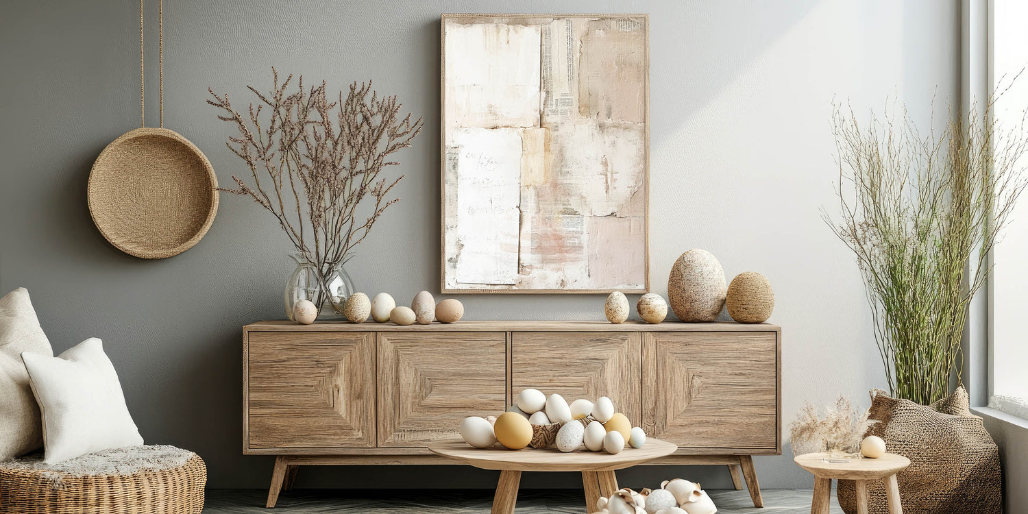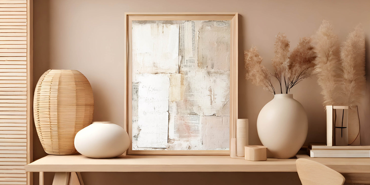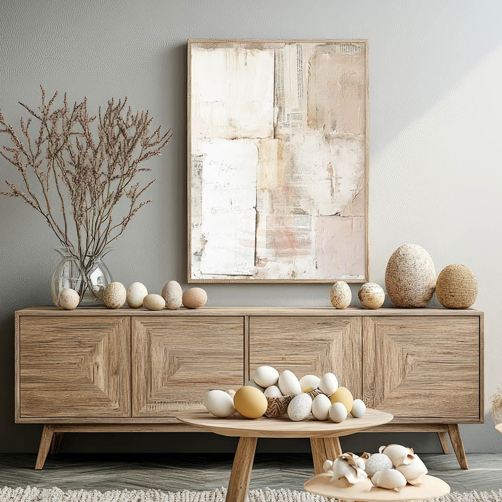 Enhance your home decor with this elegant Easter wall art featuring a vintage-inspired collage. The design showcases a harmonious blend of textured paper layers, faded script, and muted tones of beige, cream, and blush pink. The subtle distressed look and minimalist composition create a timeless piece, perfect for those who appreciate refined, understated decor.