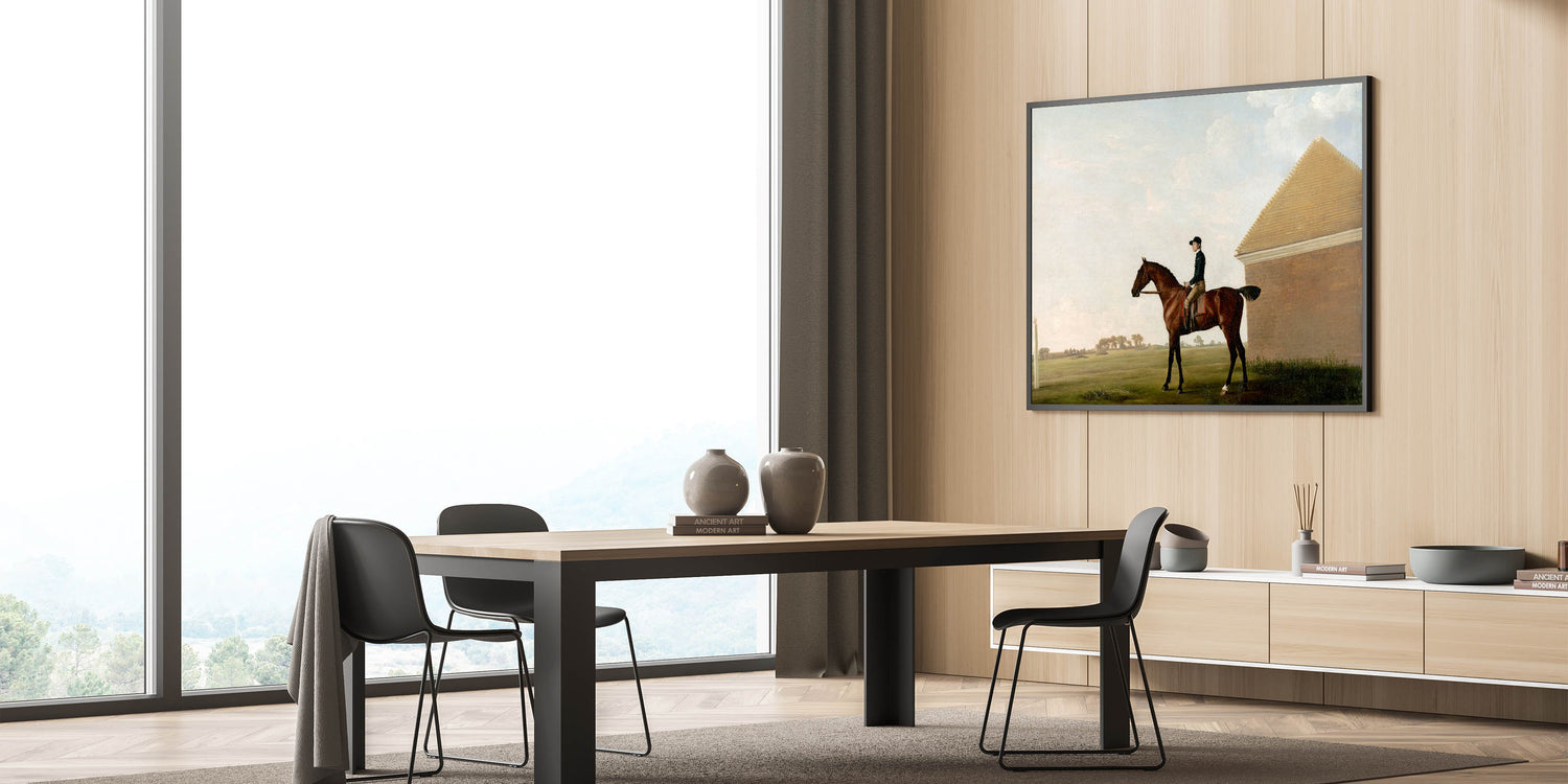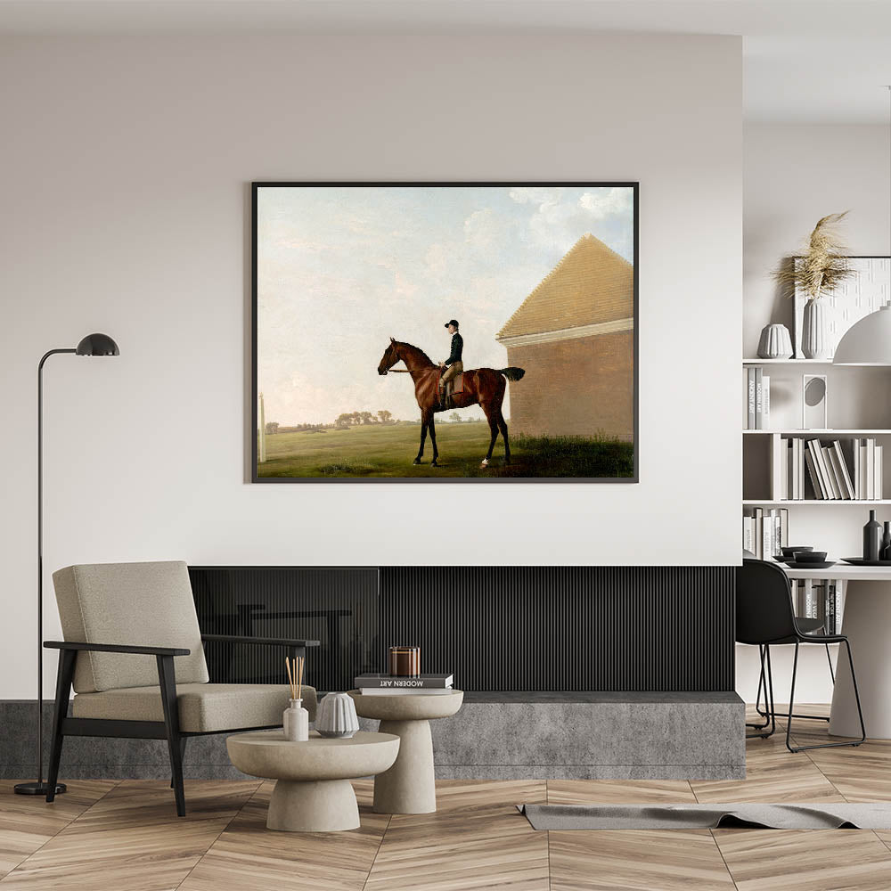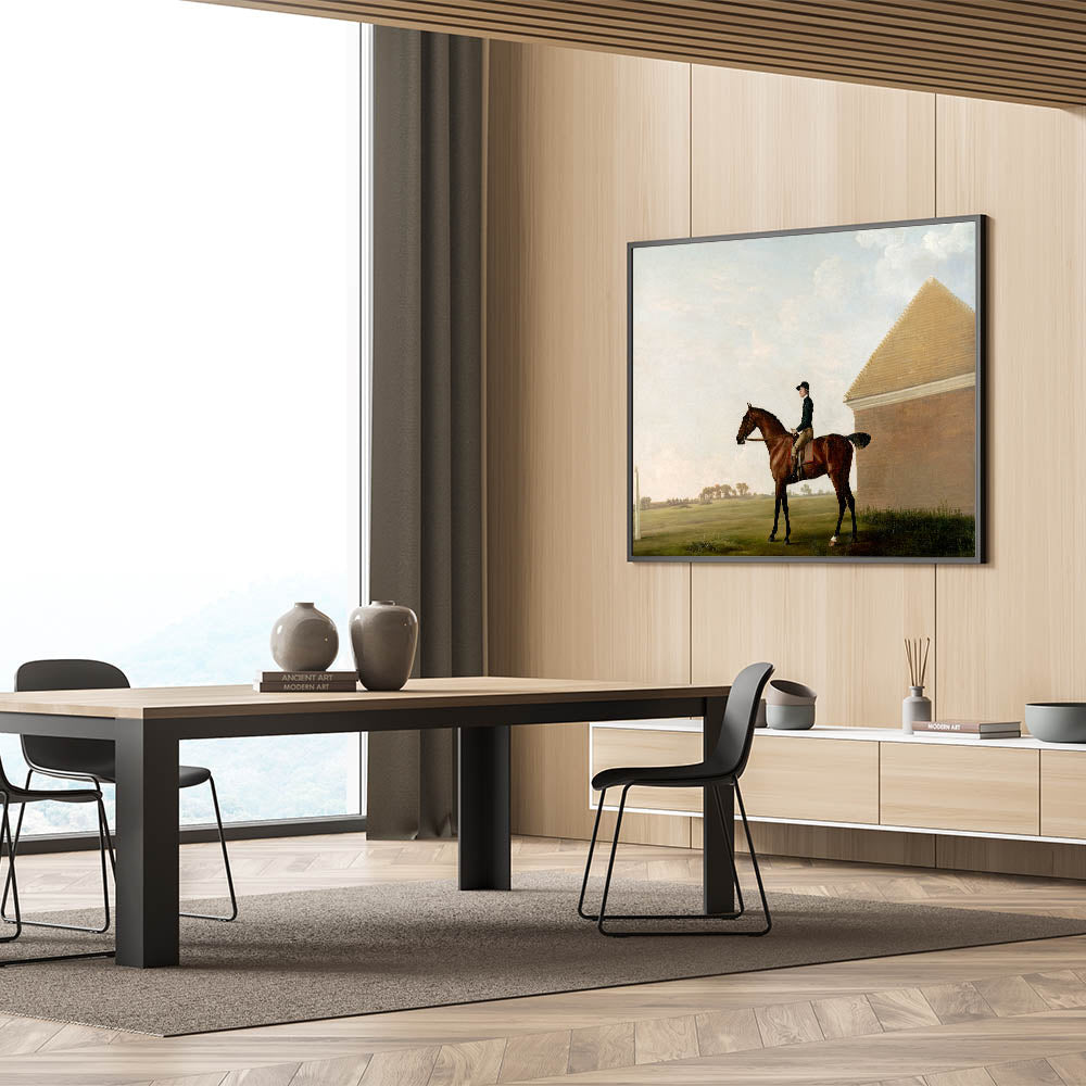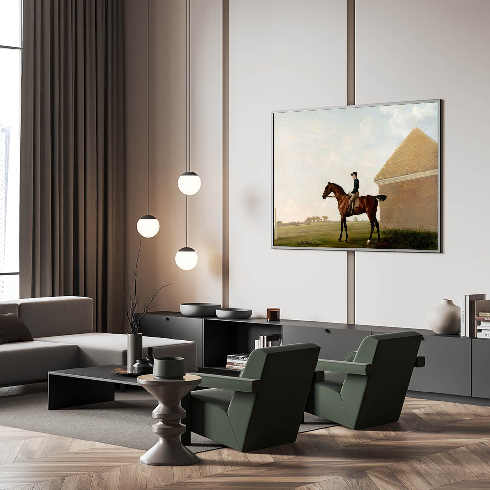 This painting of a jockey and horse captures a piece of British equestrian history, offering viewers a glimpse into a serene yet powerful moment. It’s a sophisticated addition to any art collection or interior, blending historical art with natural beauty.