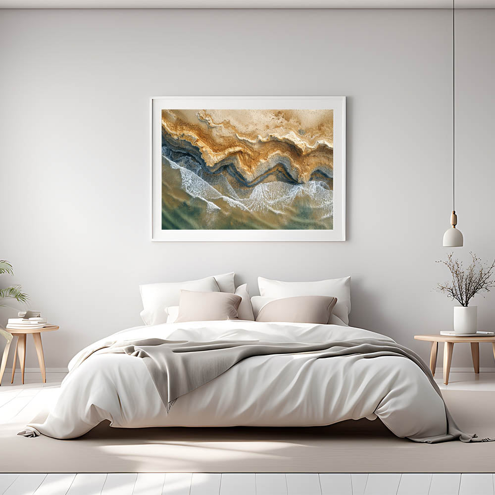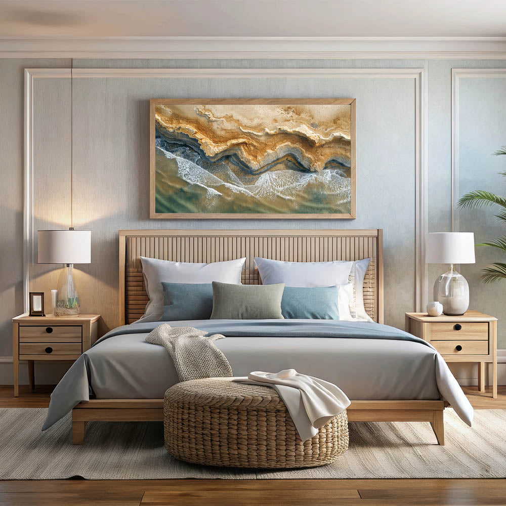 Capture the natural beauty of the coastline with this stunning aerial view coastal wall art. Perfect for beach-themed decor, this unique piece highlights the rugged textures of the shoreline as it meets the calming waves of the ocean. The earthy browns and soft blues blend effortlessly, bringing a sense of harmony and serenity into your living space. Ideal for coastal-inspired wall art, this piece brings a touch of nature’s finest scenery right into your home.
