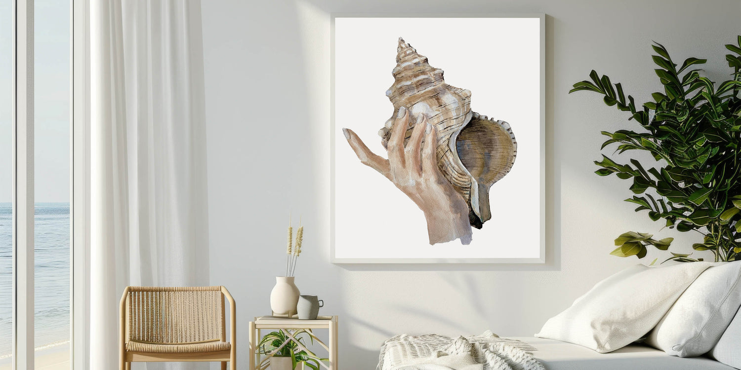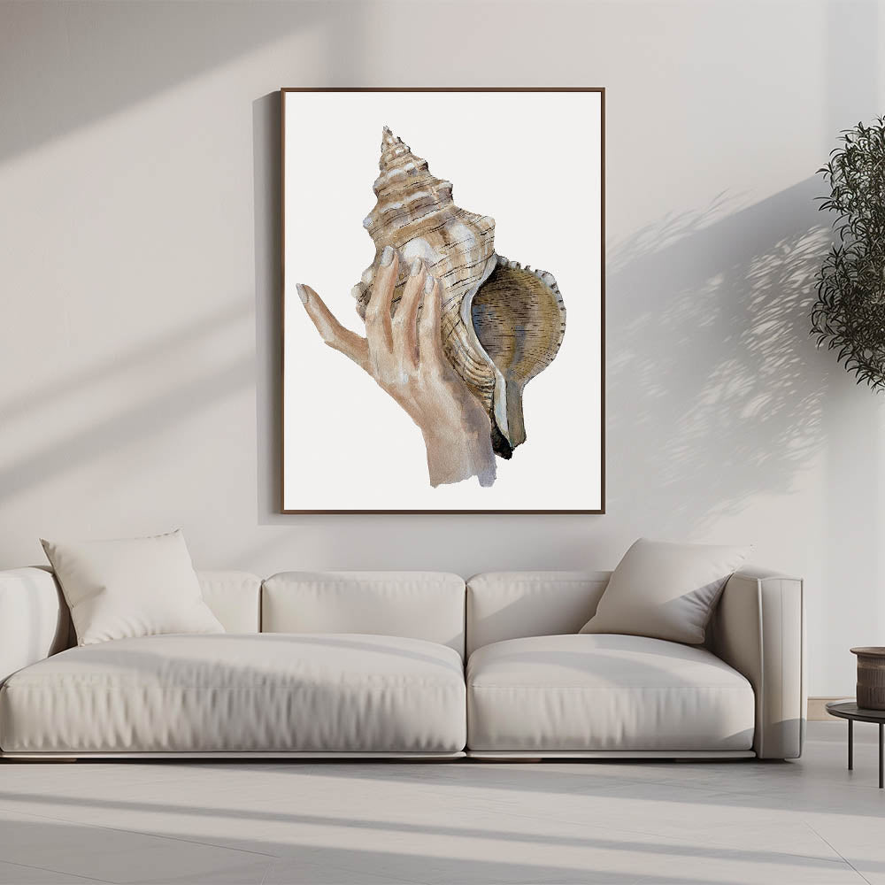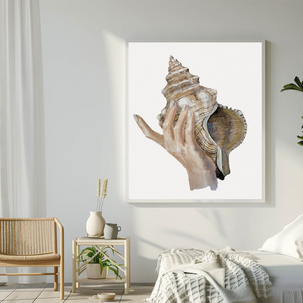 Immerse yourself in the calming beauty of the ocean with this detailed conch shell artwork. This coastal-inspired piece showcases a delicate hand holding a large conch shell, perfectly capturing the essence of seaside living. The natural, earthy tones bring an organic and serene feel to your decor, making it an excellent addition to any beach-themed room.