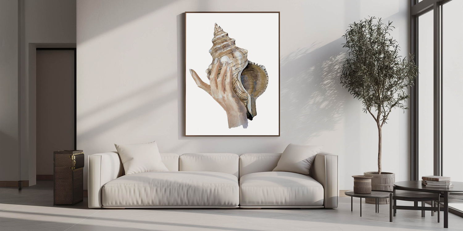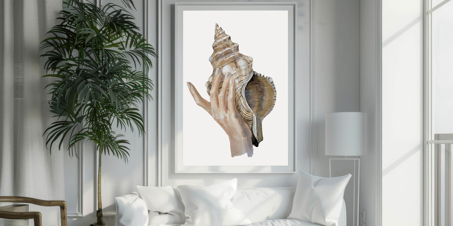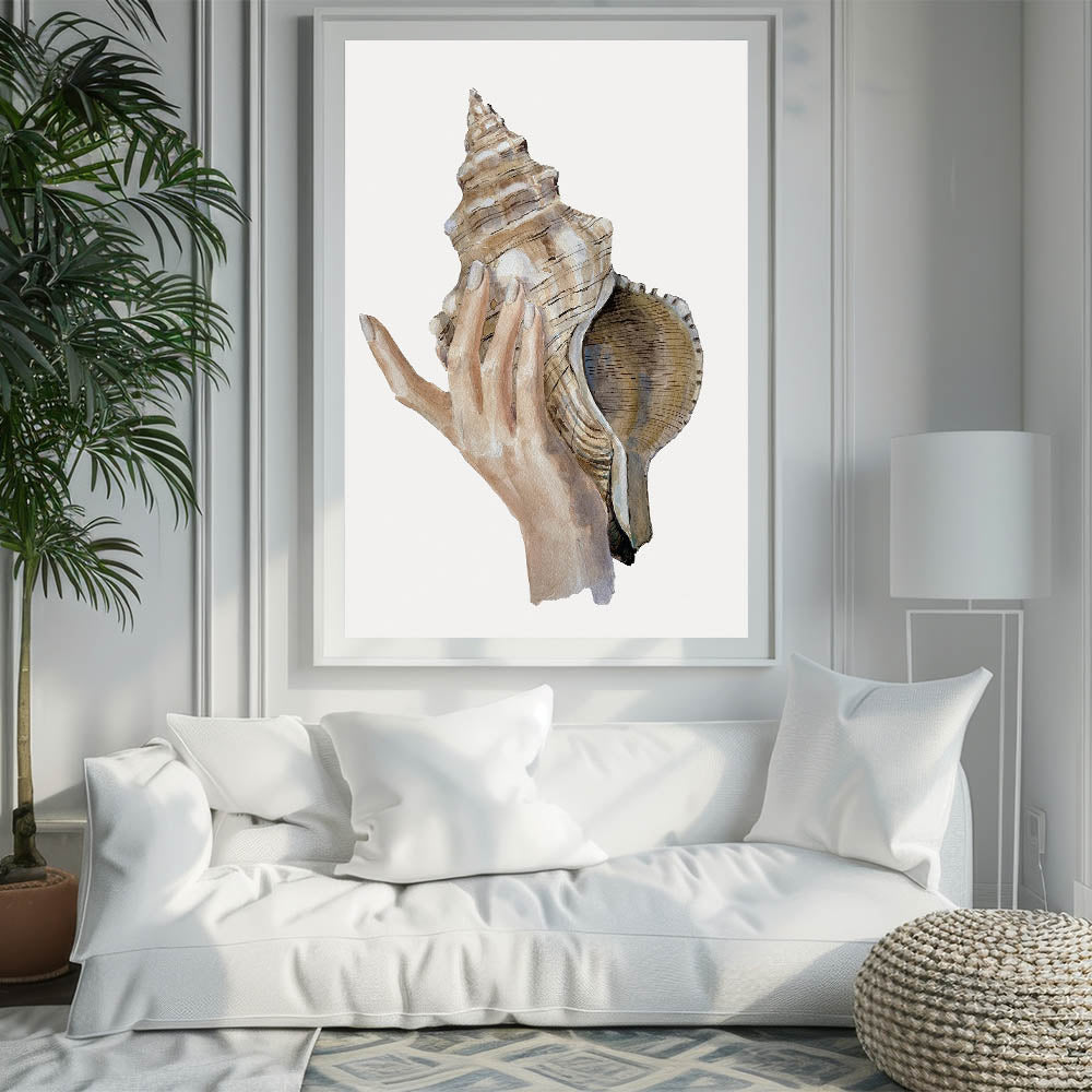 Immerse yourself in the calming beauty of the ocean with this detailed conch shell artwork. This coastal-inspired piece showcases a delicate hand holding a large conch shell, perfectly capturing the essence of seaside living. The natural, earthy tones bring an organic and serene feel to your decor, making it an excellent addition to any beach-themed room.