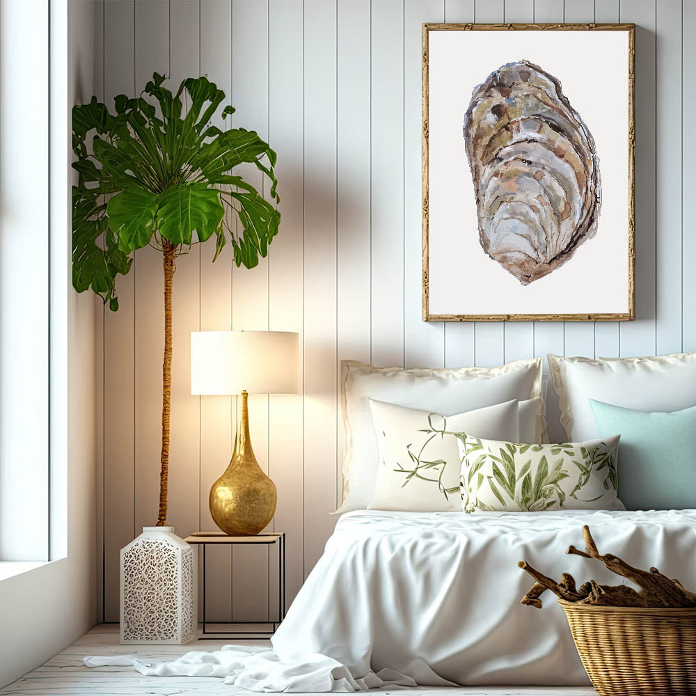 Bring the serenity of the coast into your home with this stunning coastal oyster shell artwork. This unique piece of coastal scenery artwork perfectly captures the essence of the ocean’s natural beauty, making it an ideal addition to any nautical-themed decor. The detailed oyster shell illustration features earthy tones that effortlessly blend with modern or rustic interiors.