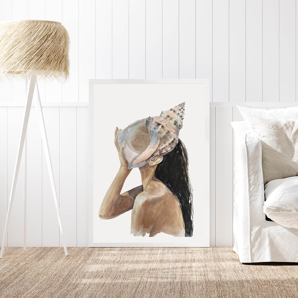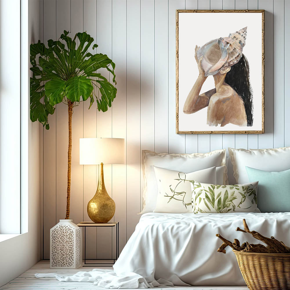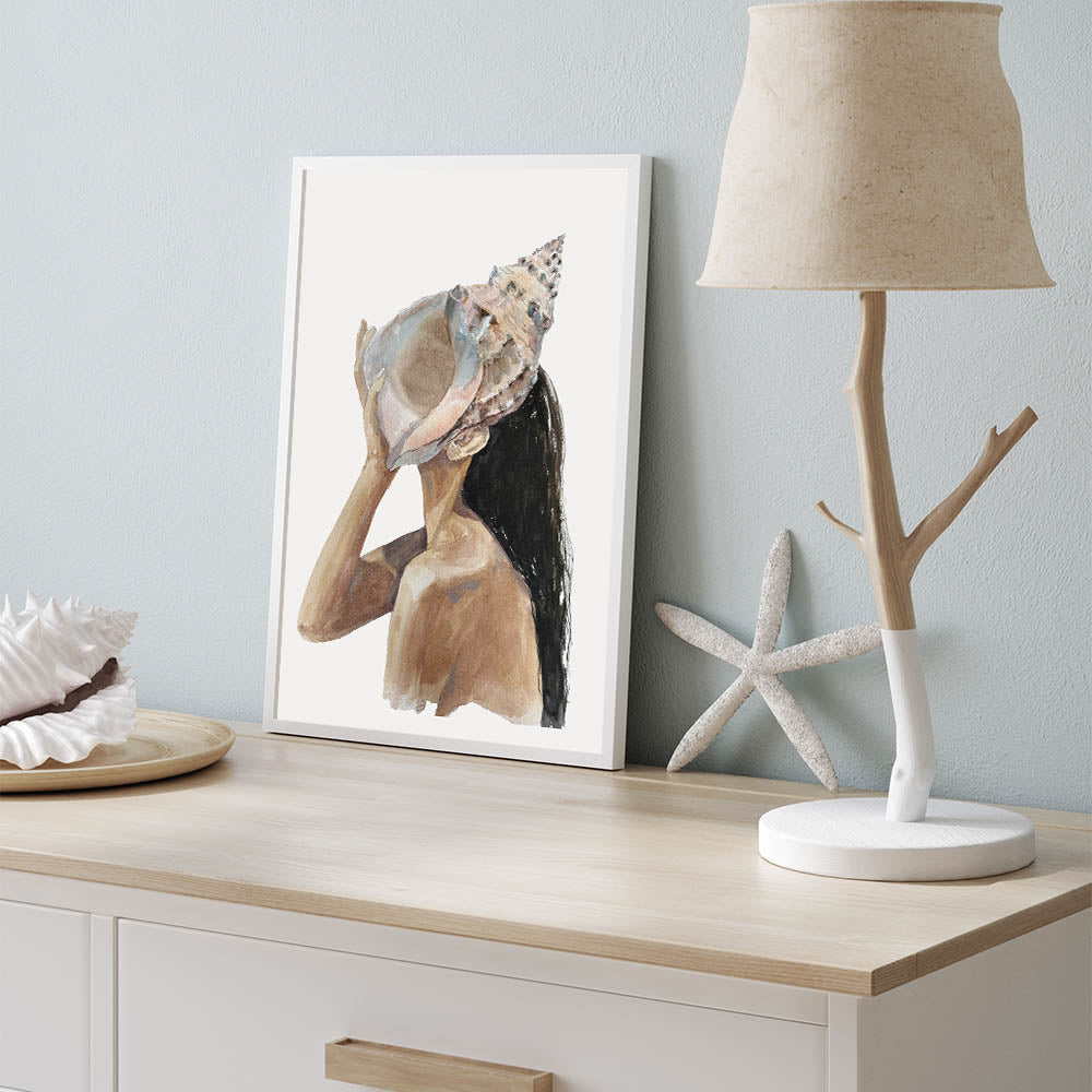 Coastal Wall Art - Woman with Conch Shell Beach-Themed Nautical Print