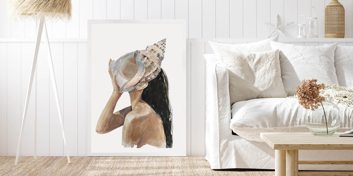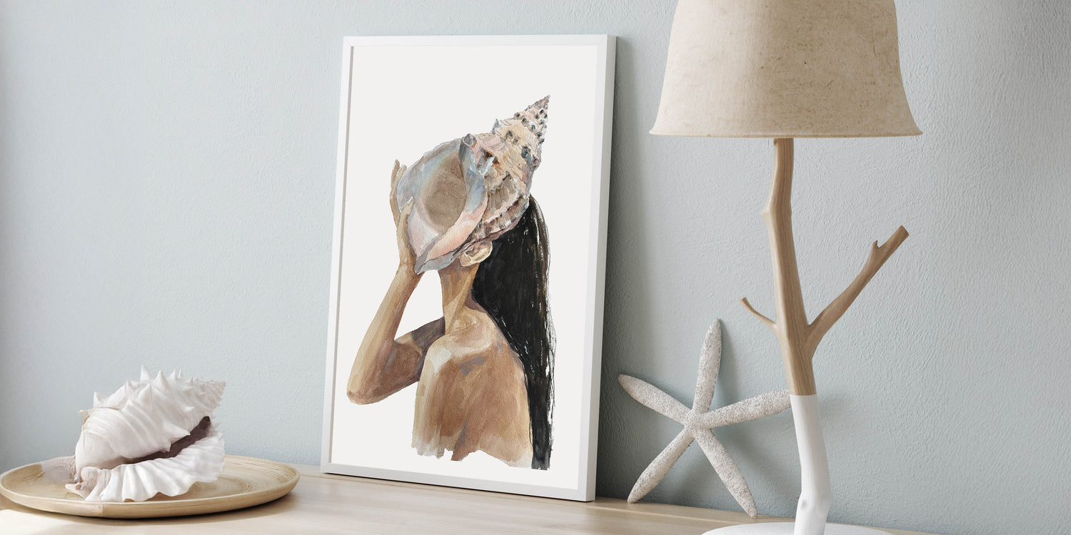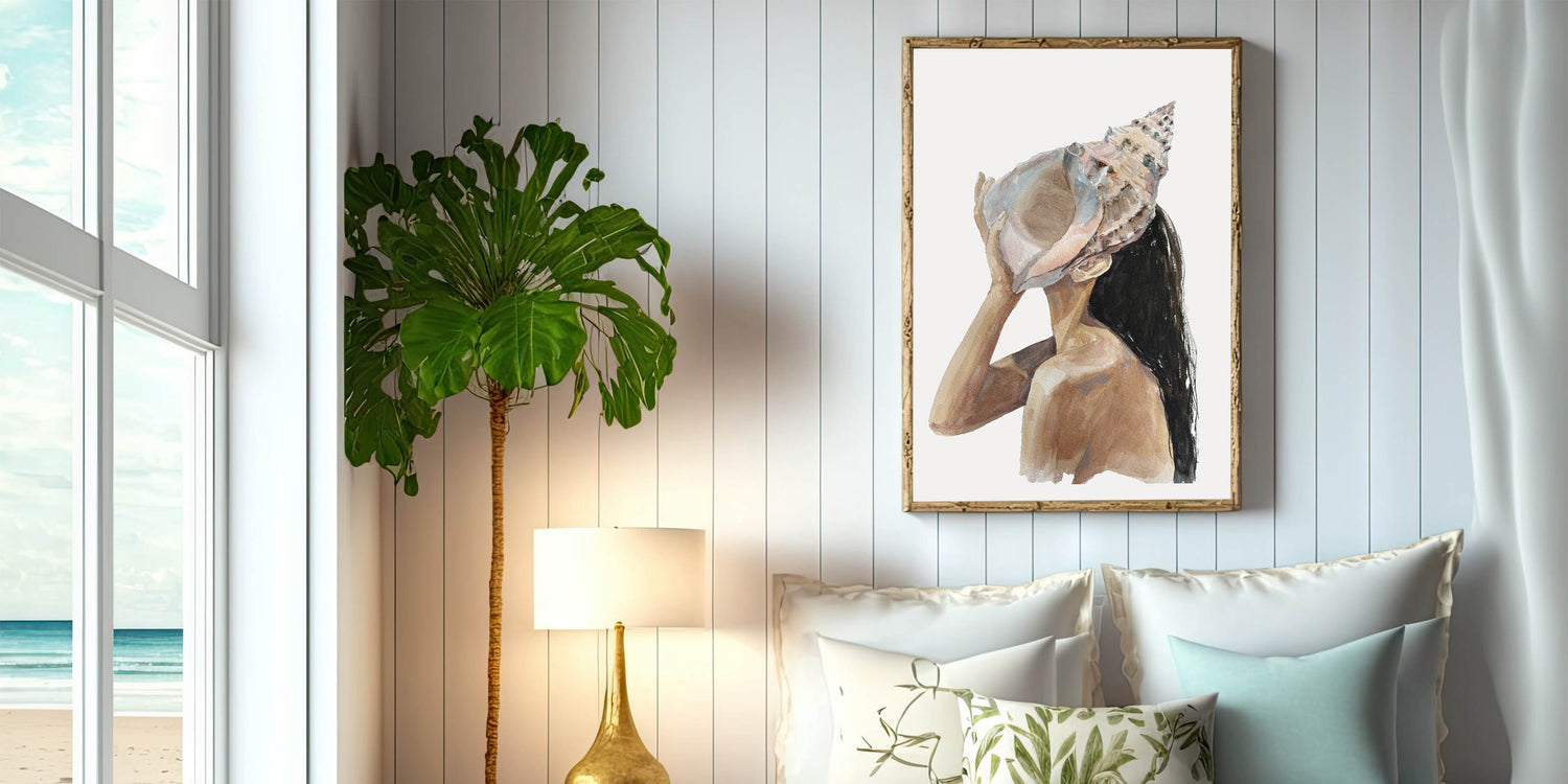 Coastal Wall Art - Woman with Conch Shell Beach-Themed Nautical Print
