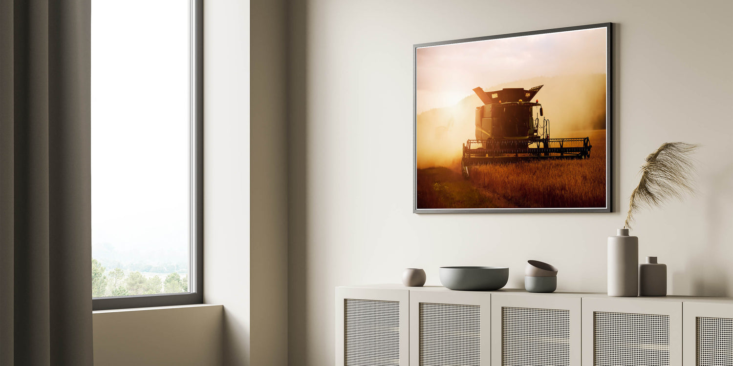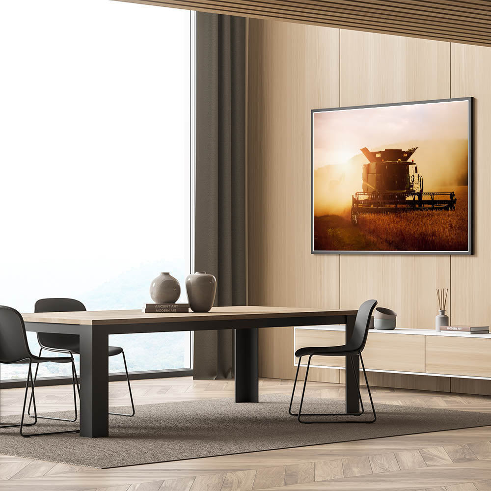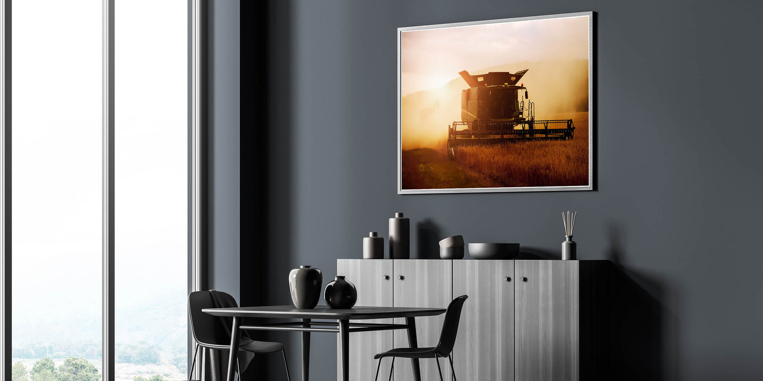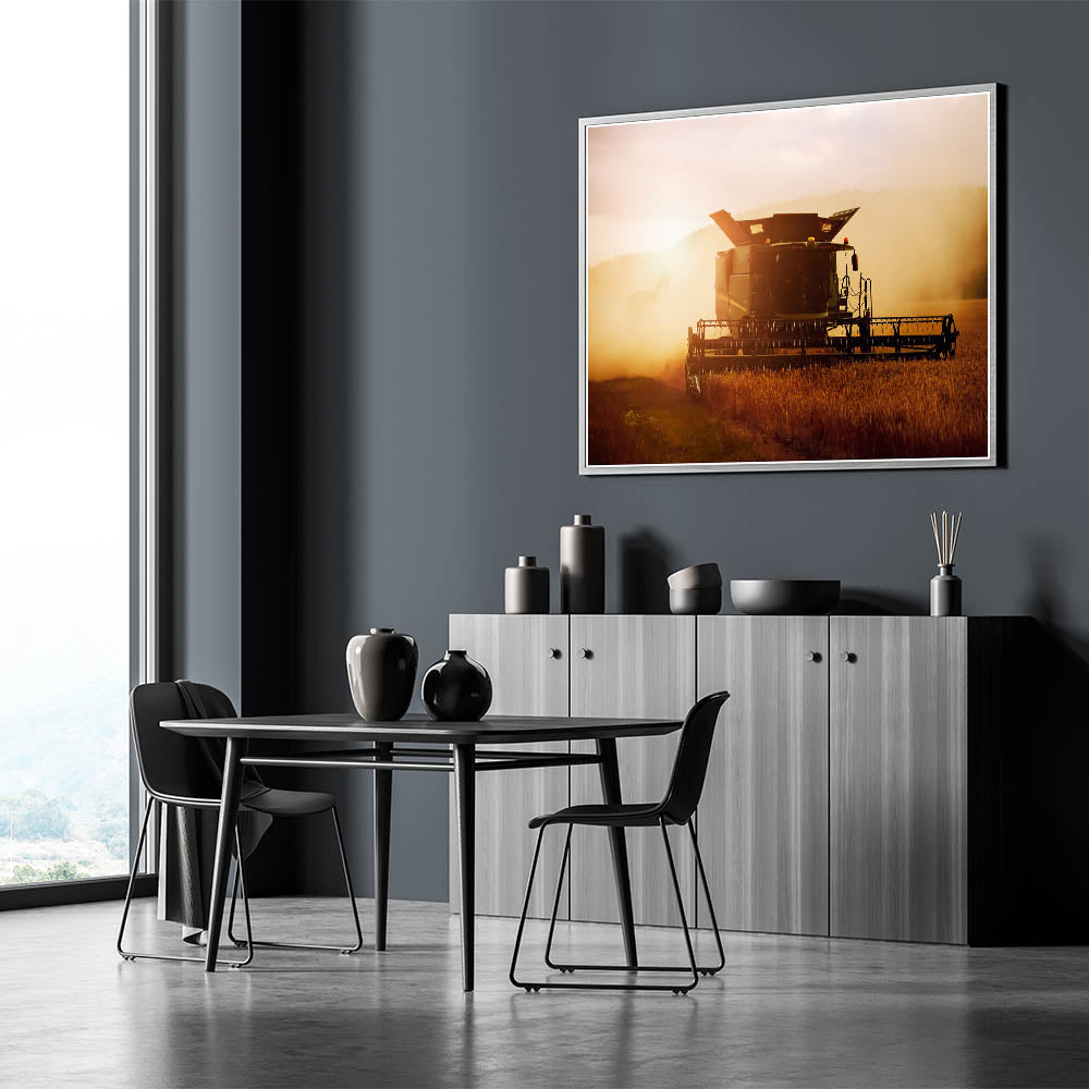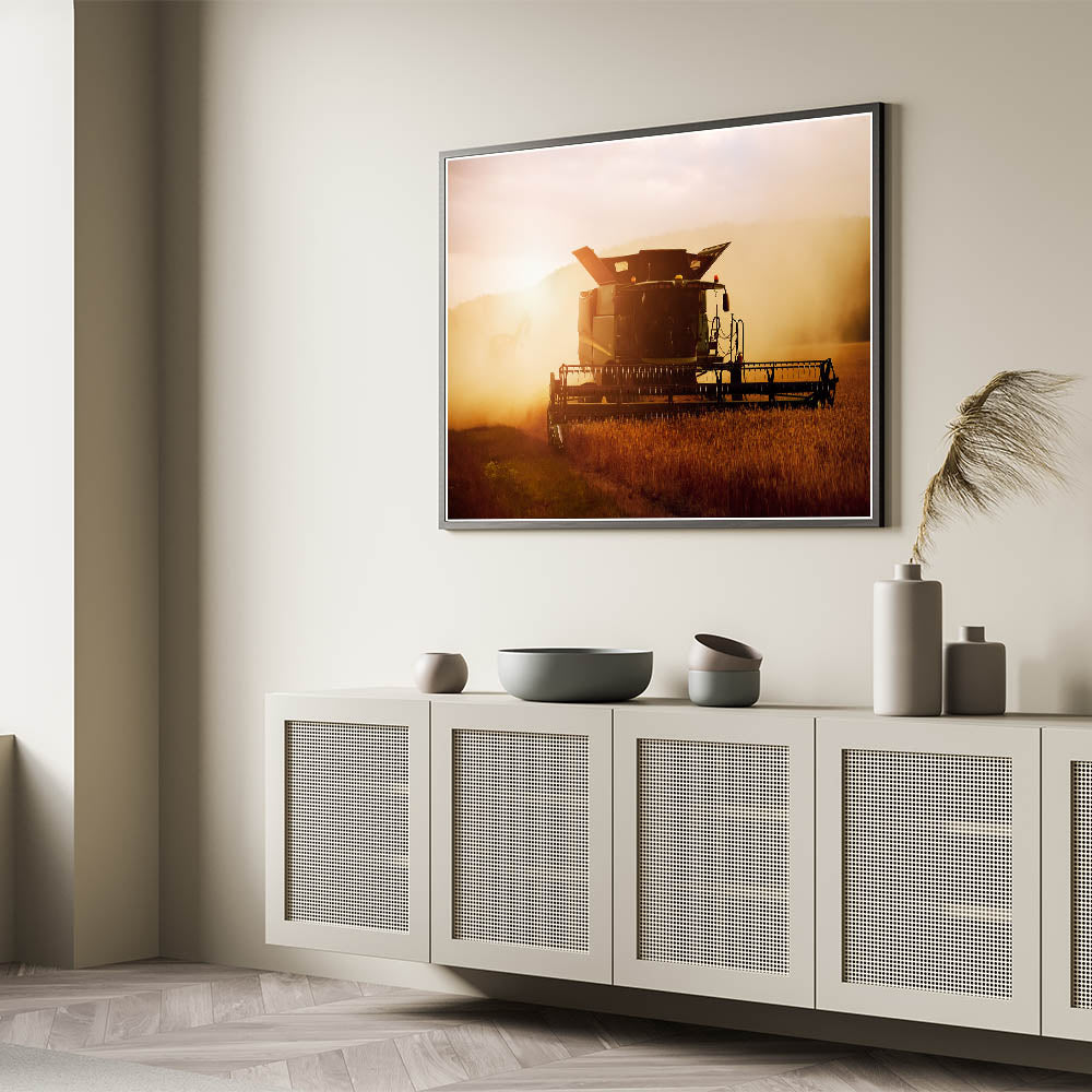 Celebrate the heart of country living with this stunning wall art featuring a combine harvester in action. The warm golden hues of the sun-drenched field blend beautifully with the silhouette of the machine, creating a sense of motion and purpose. This artwork is perfect for anyone looking to incorporate rustic or farmhouse-style decor into their space, capturing the essence of rural life. Whether displayed in a kitchen, living room, or office, this vintage-inspired piece adds warmth and character to any room.