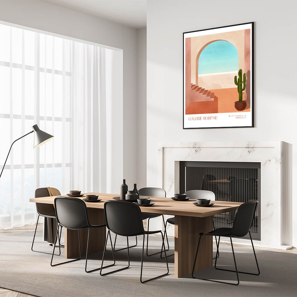 Enhance your interior with this contemporary art print, showcasing the beauty of Moroccan architecture. The artwork features a minimalist staircase leading to an arched opening with a bright blue sky, complemented by warm terracotta tones and a potted cactus. This design captures the charm of Mediterranean style while offering a serene and inviting atmosphere, perfect for modern living spaces, bedrooms, or offices.
