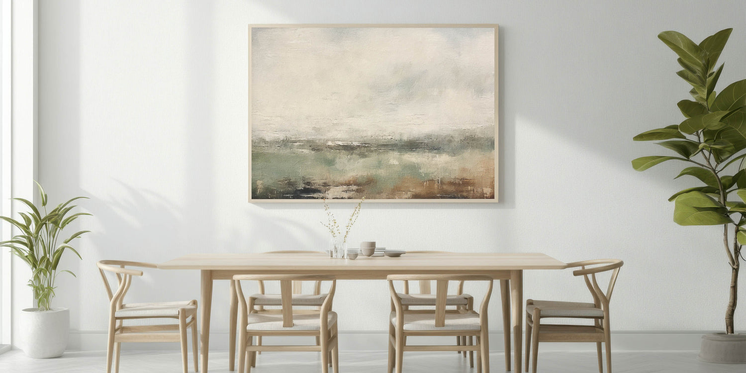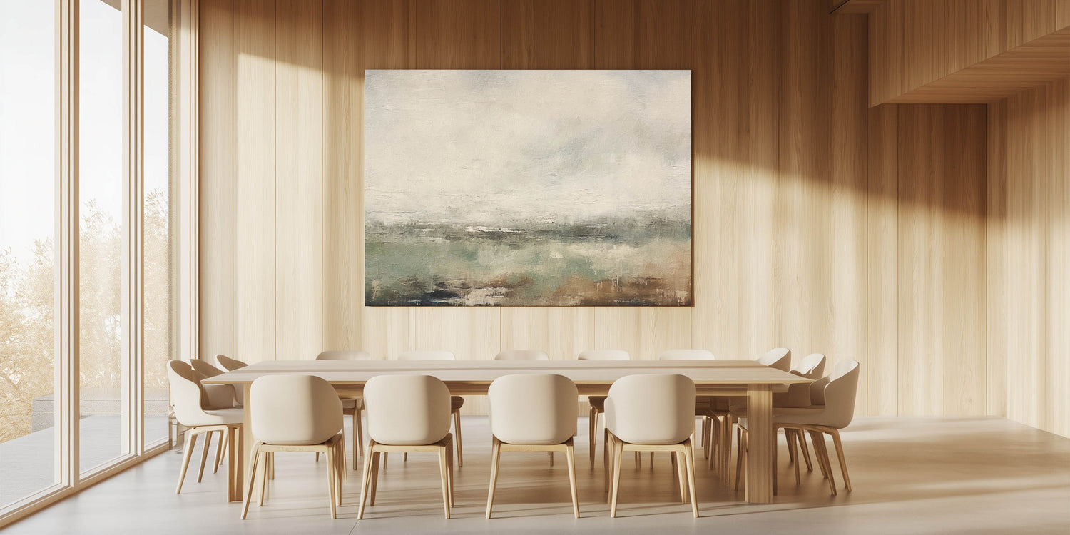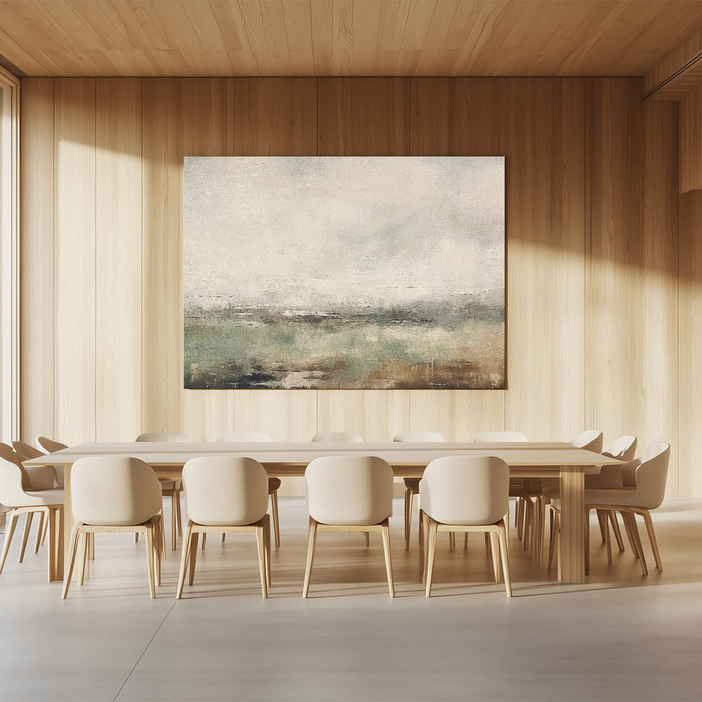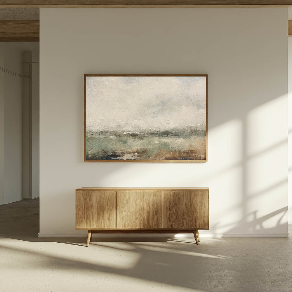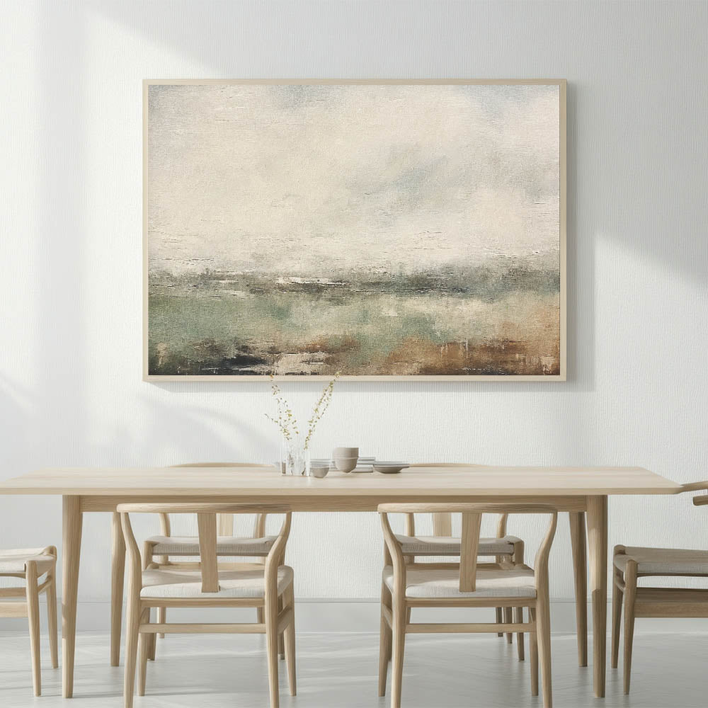 This contemporary landscape abstract art captures the tranquility of a misty horizon with soft, muted tones. Featuring shades of green, beige, and touches of brown, this artwork exudes a calm and sophisticated atmosphere, perfect for modern spaces. Its abstract style offers an impressionistic take on nature, with the foggy ambiance adding depth and serenity.