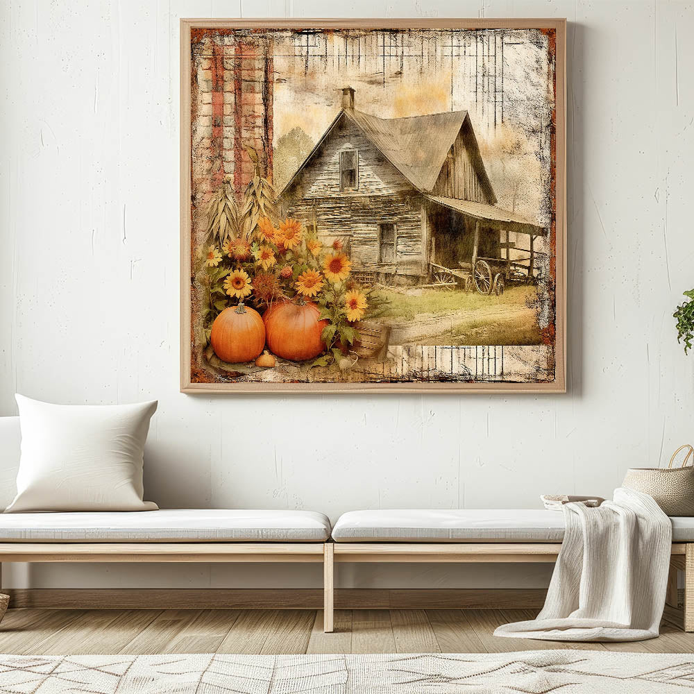 - Features a weathered barn, bright sunflowers, and autumn harvest pumpkins, adding a cozy country style to your home.