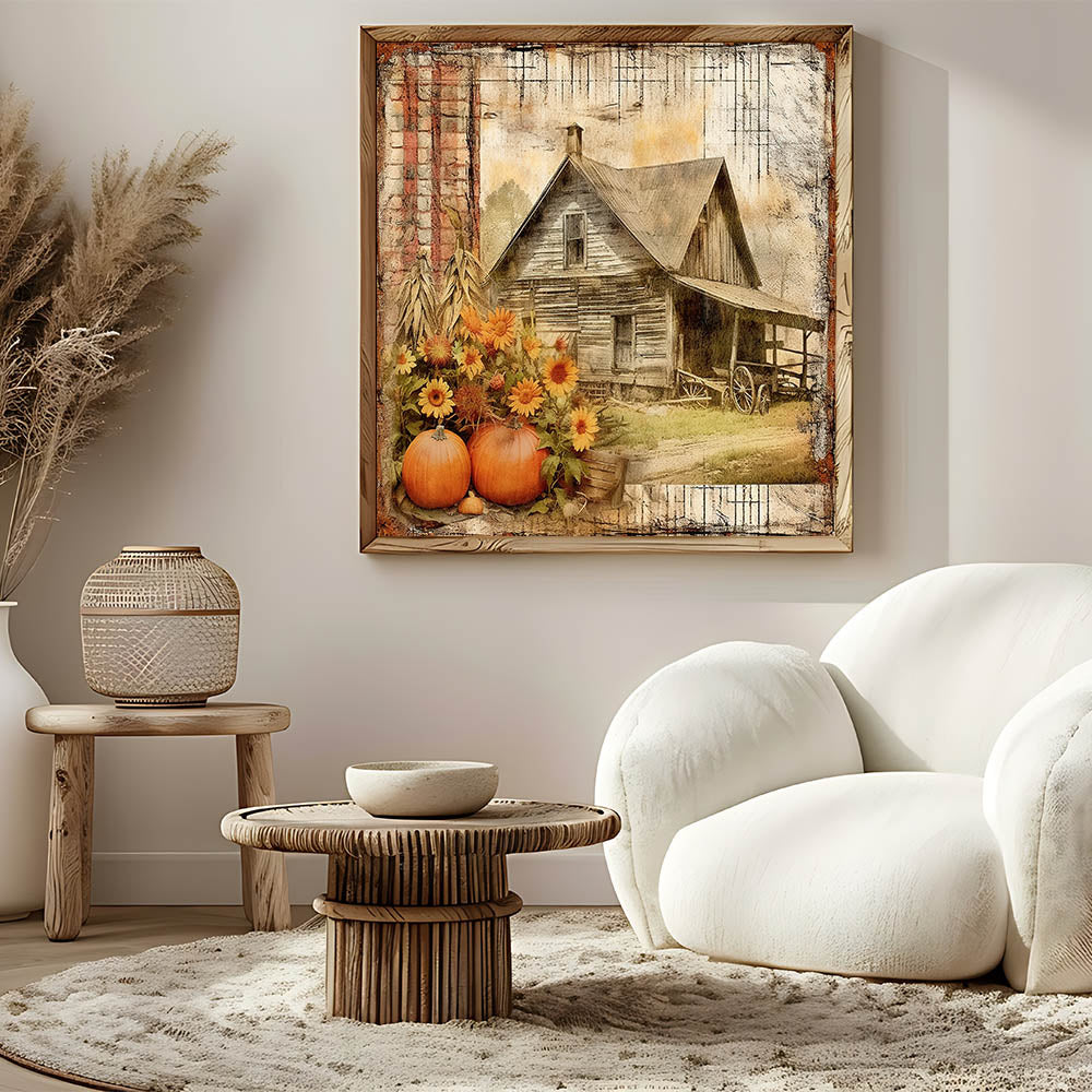 Bring the warmth and charm of the countryside into your home with this beautiful farmhouse wall art, featuring a rustic barn, pumpkins, and vibrant sunflowers. This vintage-inspired artwork captures the essence of country living, offering a welcoming and nostalgic feel to any space. Perfect for lovers of rustic farmhouse decor, this piece is designed to complement a variety of interior styles, from traditional to modern.