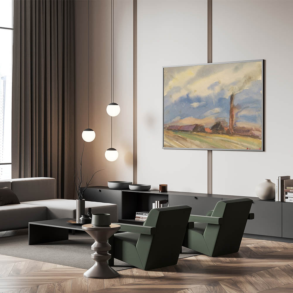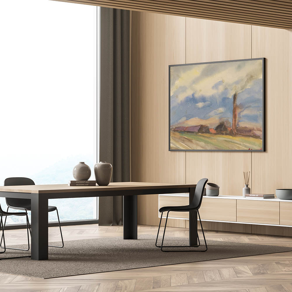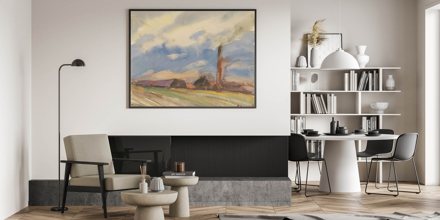 Capture the peaceful essence of rural life with this modern wall art piece, showcasing a tranquil view of a village from open fields. Painted in soft watercolor hues of blue, green, and earthy browns, this artwork evokes the calm of a quiet countryside day under a vast sky. Perfect for trendy home decor, this unique modern art piece brings the serenity of nature indoors, creating a relaxing atmosphere in any room.