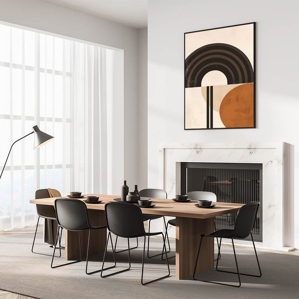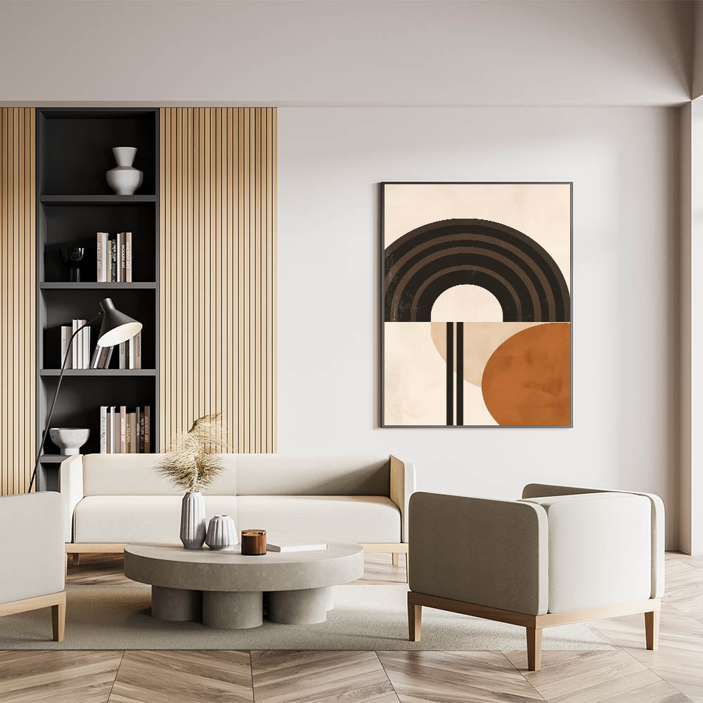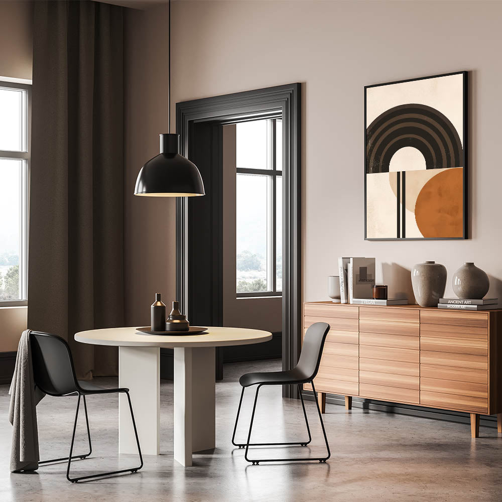Bring a modern, artistic touch to your space with this striking Bohemian wall art. Featuring bold geometric arches and circles in earthy tones, this piece creates a perfect balance of simplicity and style. Its clean lines and warm hues make it ideal for eclectic, boho-chic, and contemporary home decor.