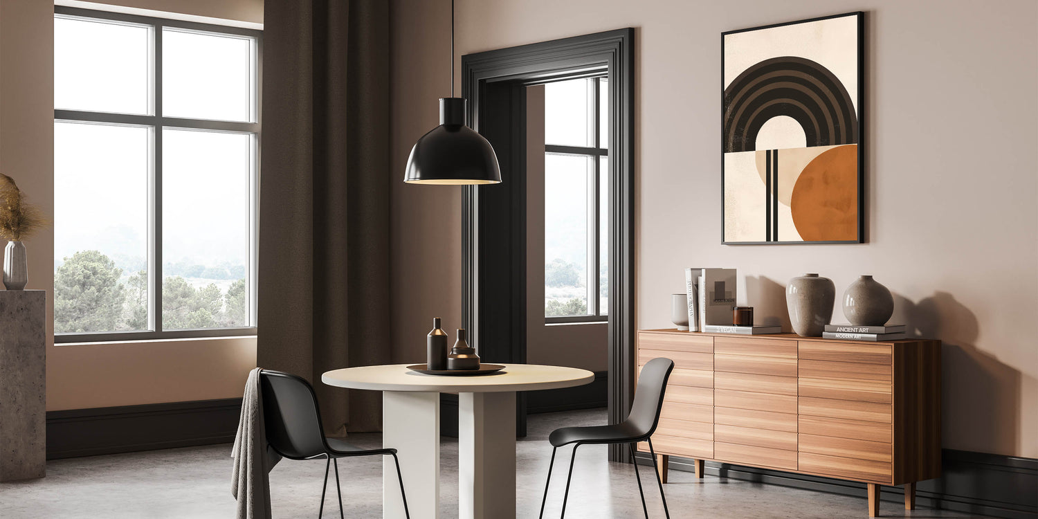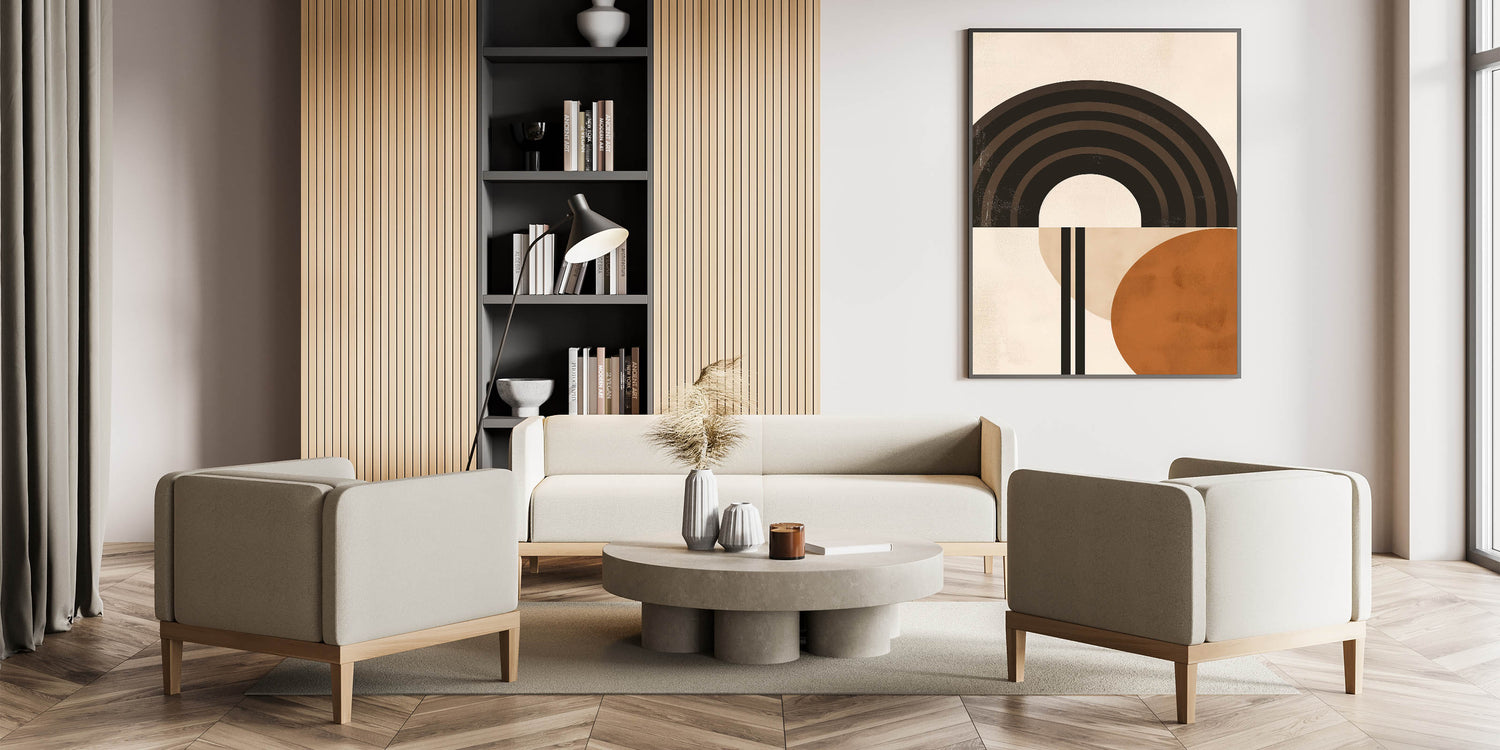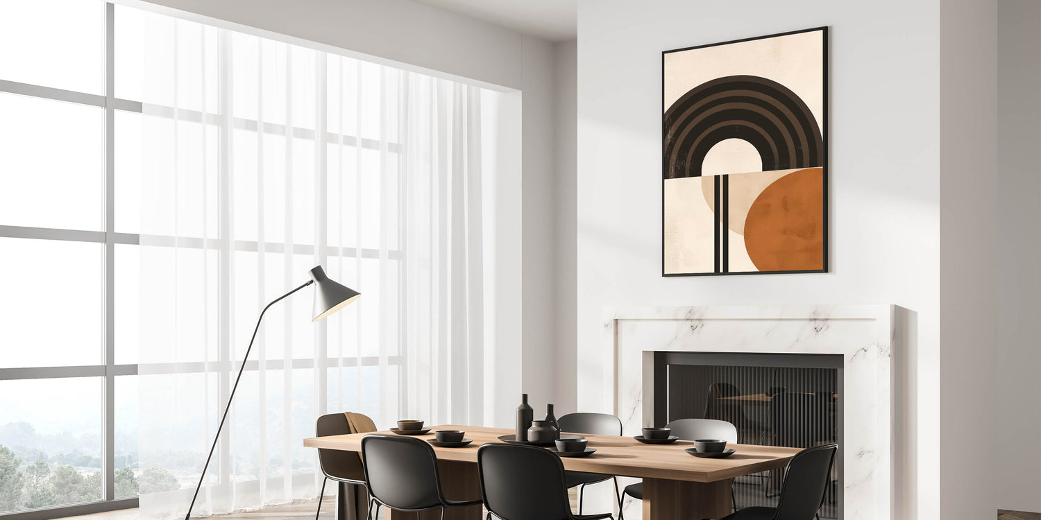 Bring a modern, artistic touch to your space with this striking Bohemian wall art. Featuring bold geometric arches and circles in earthy tones, this piece creates a perfect balance of simplicity and style. Its clean lines and warm hues make it ideal for eclectic, boho-chic, and contemporary home decor.