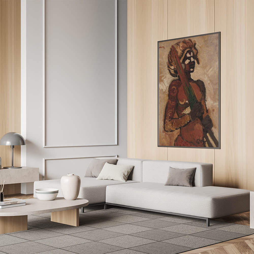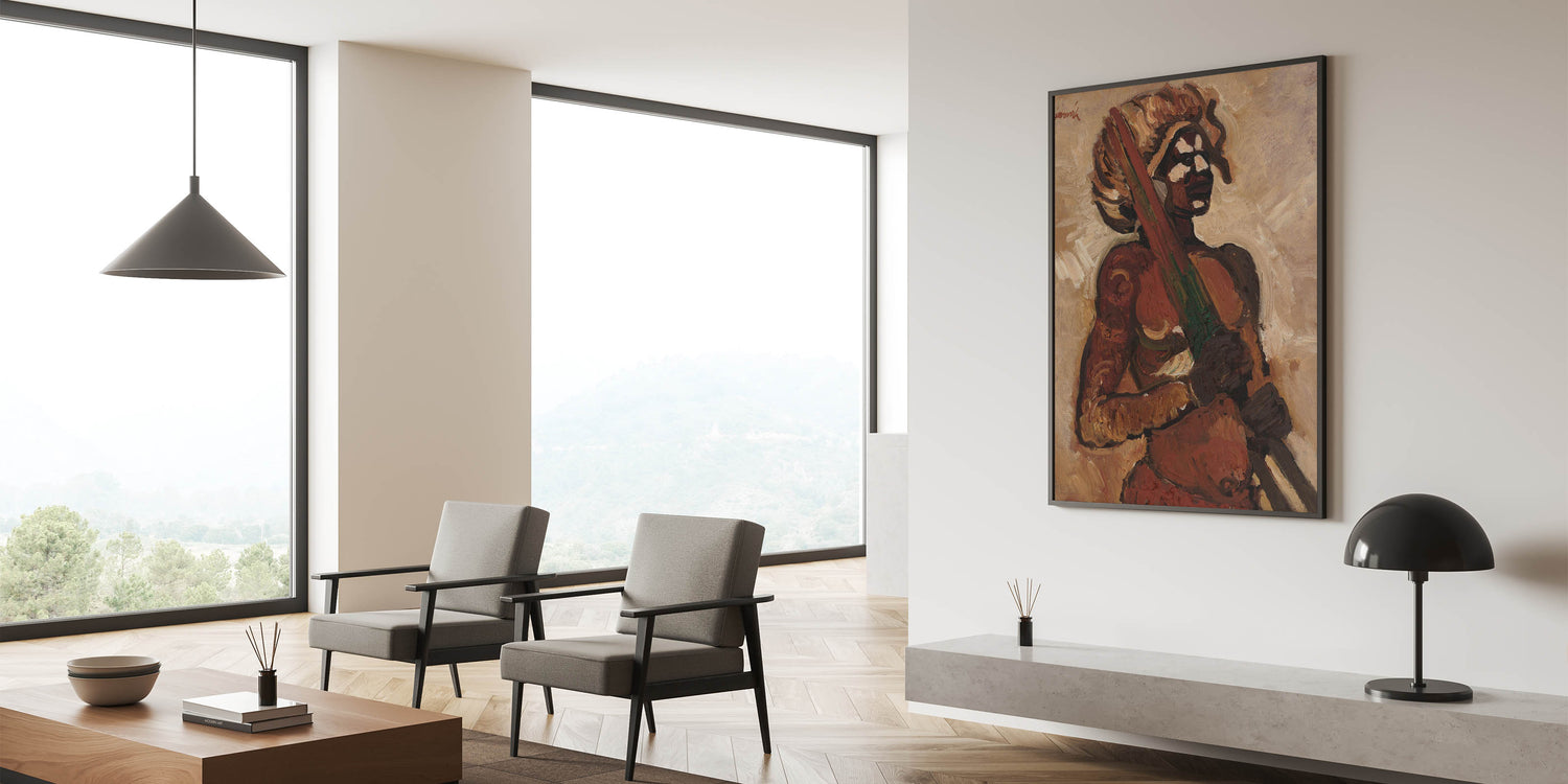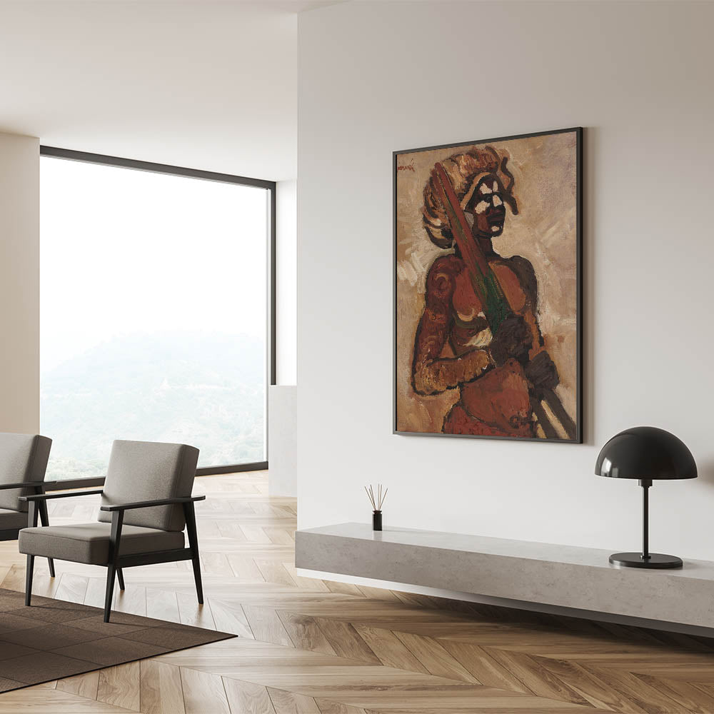 Bring intensity and expression to your space with "Black Warrior" by Cyprián Majerník. This powerful portrait captures the figure of a warrior, rendered in rich, earthy tones with dramatic brushstrokes. Majerník's use of thick, textured paint creates depth and emotion, making this piece a compelling addition to any modern or eclectic interior.
