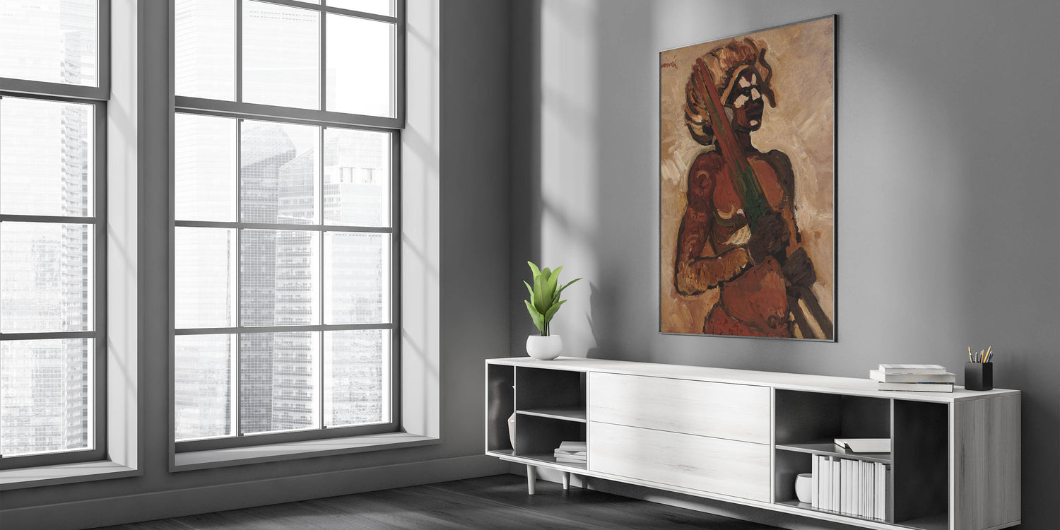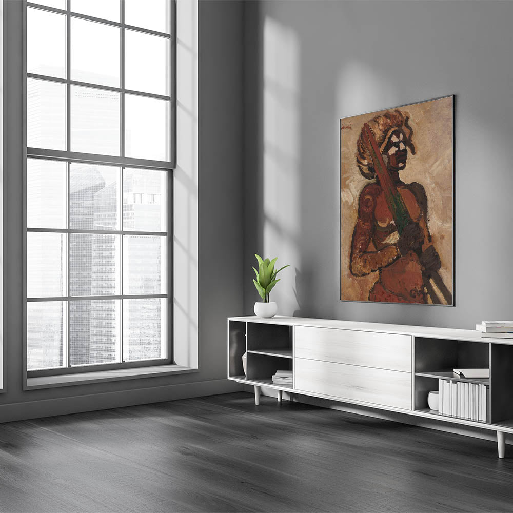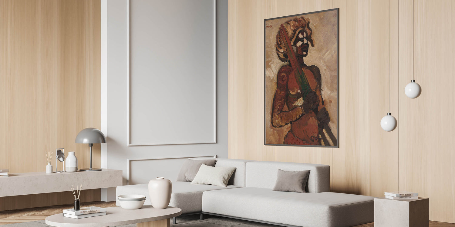 Bring intensity and expression to your space with "Black Warrior" by Cyprián Majerník. This powerful portrait captures the figure of a warrior, rendered in rich, earthy tones with dramatic brushstrokes. Majerník's use of thick, textured paint creates depth and emotion, making this piece a compelling addition to any modern or eclectic interior.