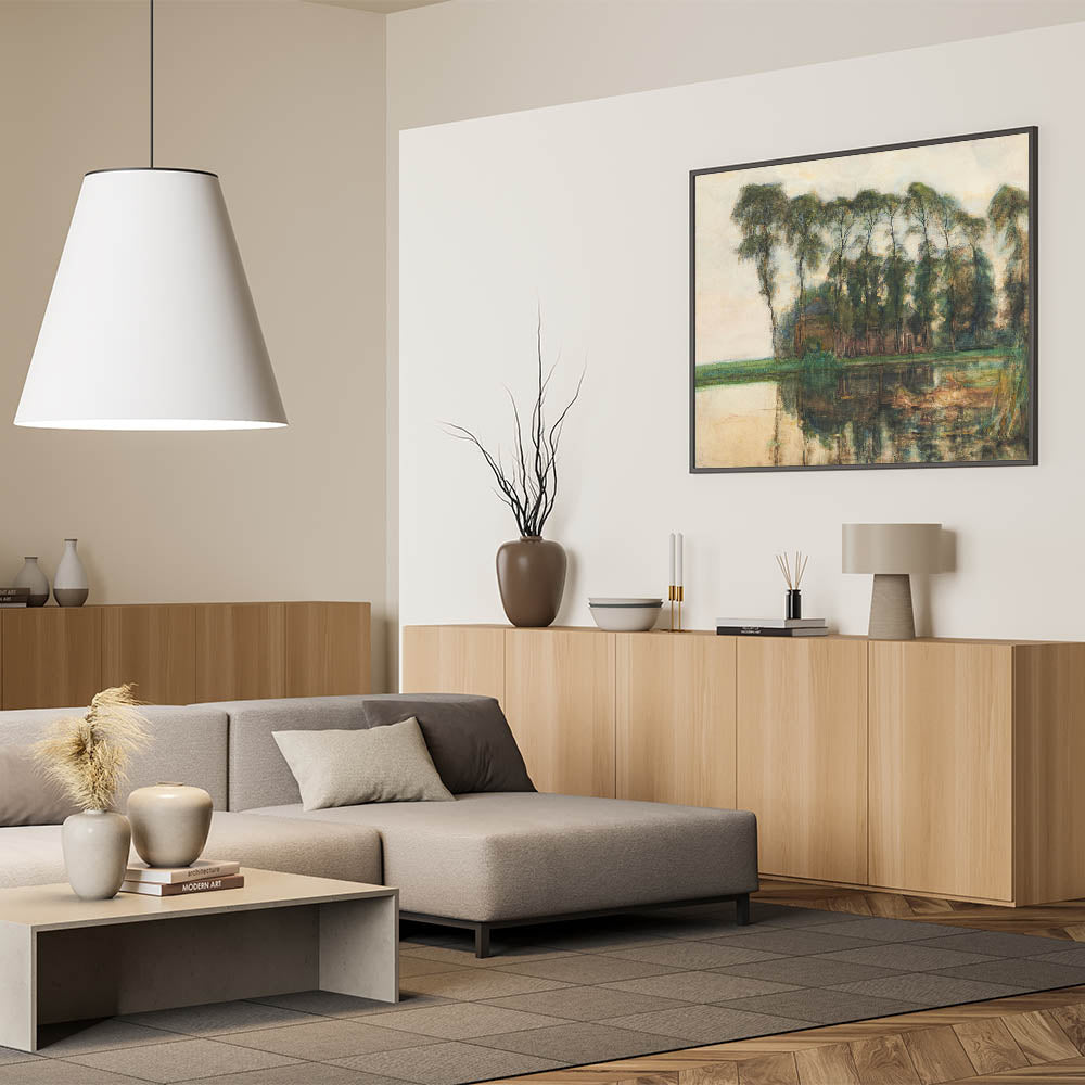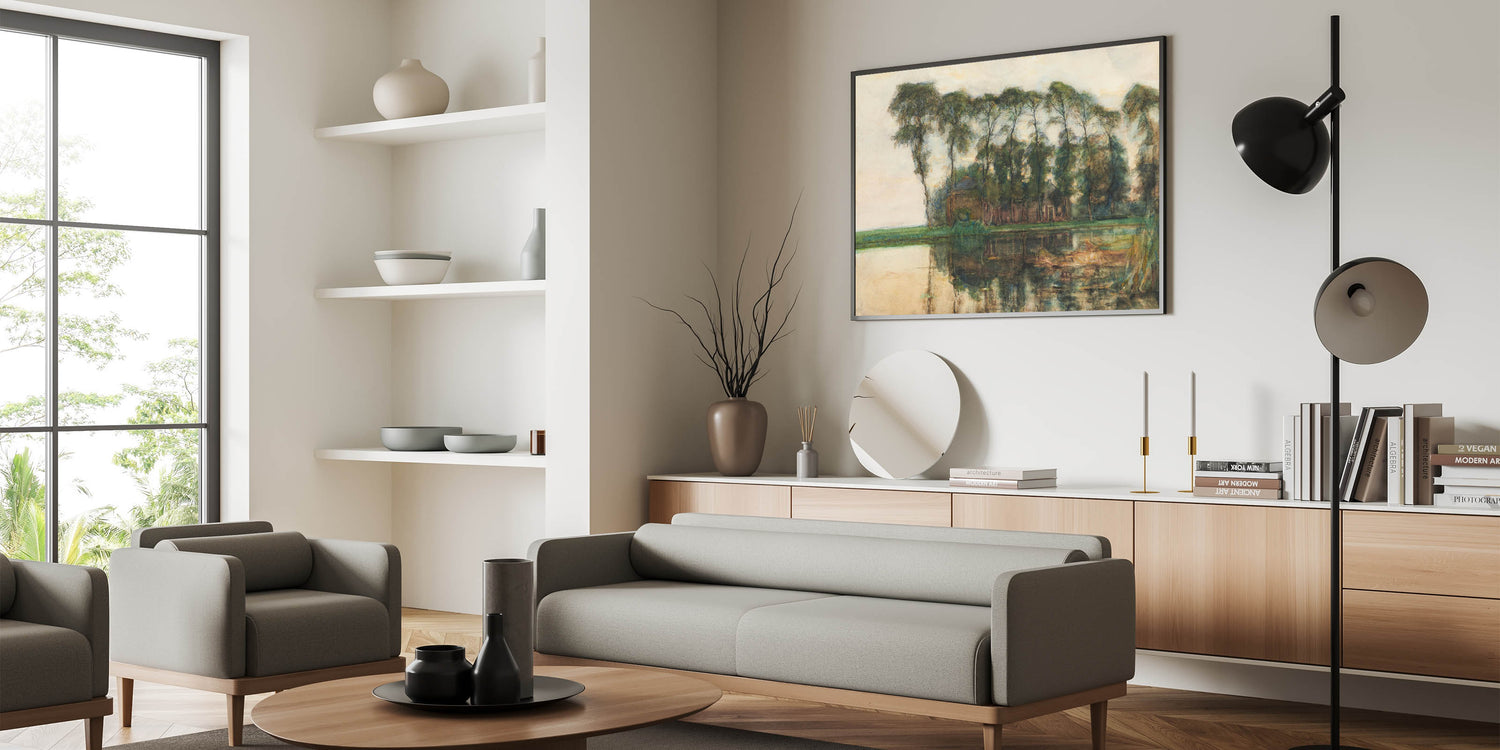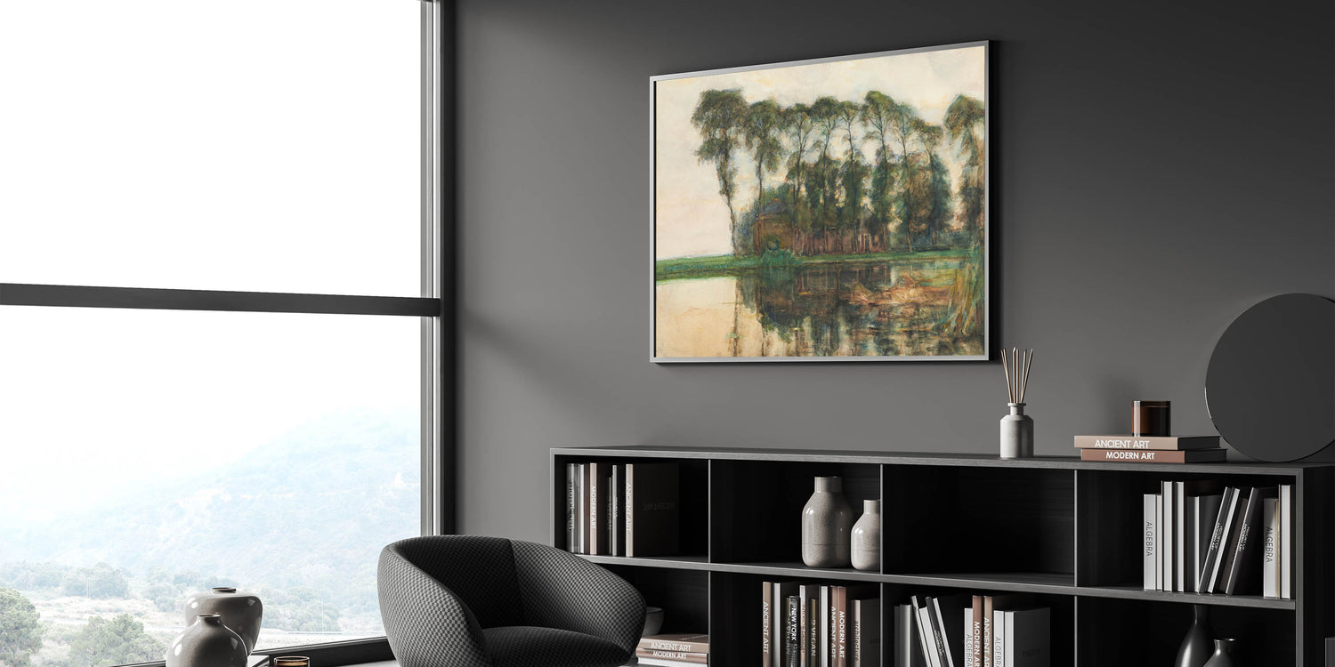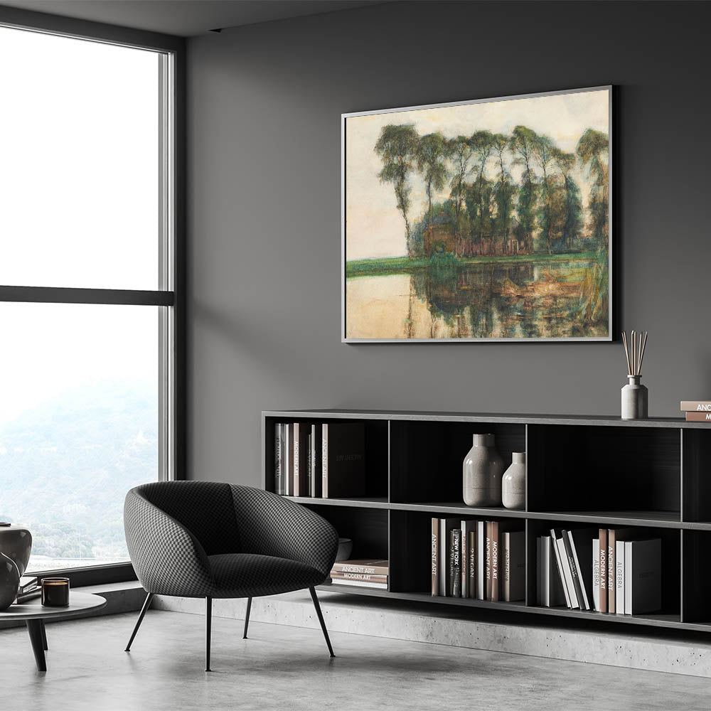 Transform your space with this serene depiction of nature, captured in a modern and minimalist style. "Farmstead Reflections" beautifully portrays a countryside scene, where a cluster of tall trees stand beside a calm, reflective body of water. This piece of modern wall art seamlessly blends earthy tones with soft greenery, making it a perfect addition to trendy home decor and contemporary art pieces.