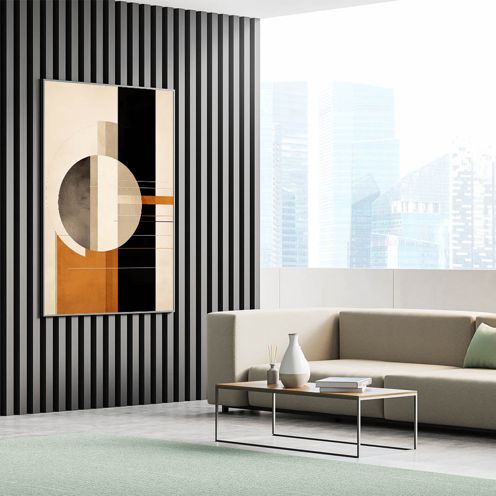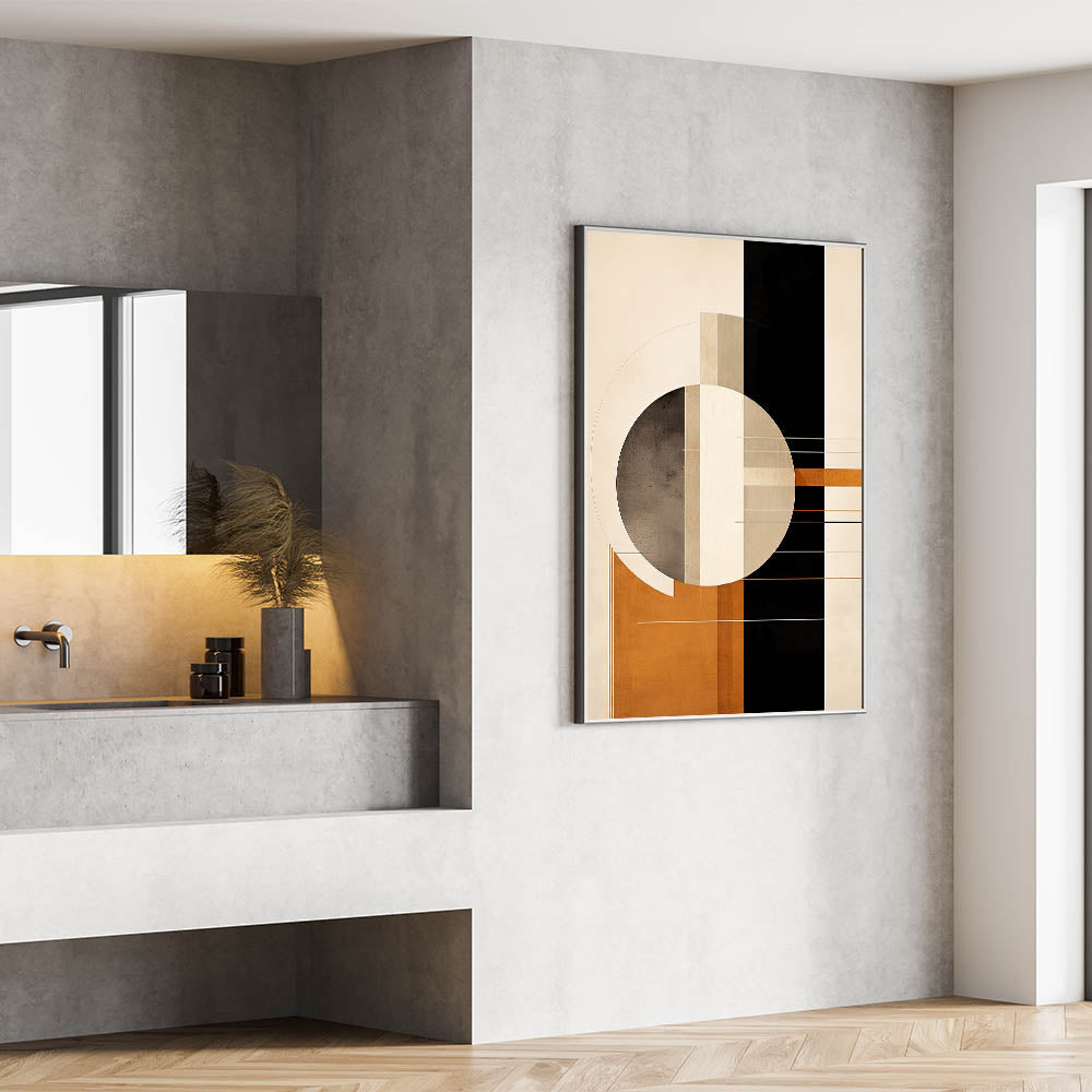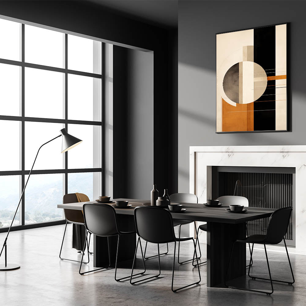 Elevate your decor with this stunning geometric minimalist wall art, featuring a bold circular and linear design in rich earth tones. The blend of warm oranges, beige, and dark accents creates a modern and sophisticated composition, perfect for contemporary interiors. This piece combines clean lines and geometric shapes, adding a sleek yet artistic touch to any space, from living rooms to offices.