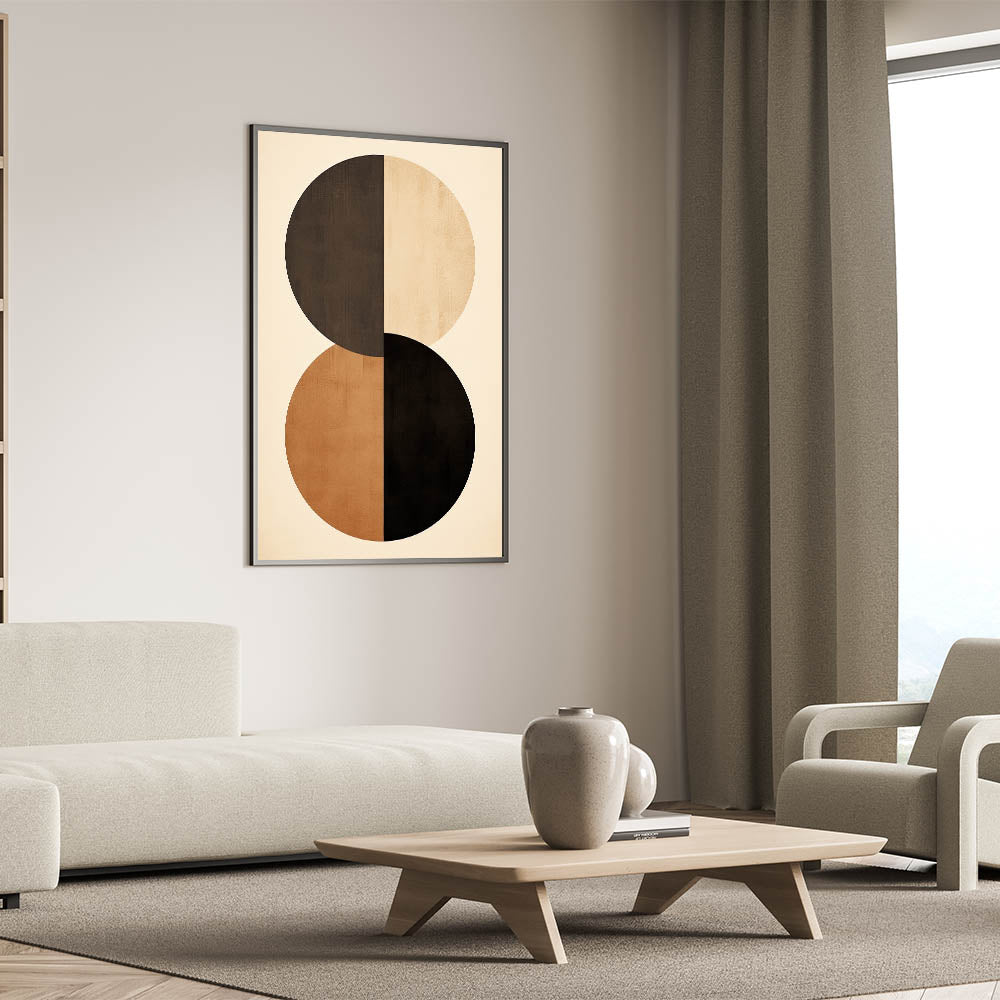 Bring a modern touch to your home with this stunning geometric minimalist wall art, featuring a dual circle design in warm earth tones. The clean, split-circle composition offers a sophisticated yet simple aesthetic, making it perfect for contemporary and minimalist interiors. This artwork combines warm browns and deep blacks, creating a balanced and harmonious visual experience, ideal for enhancing living rooms, bedrooms, or office spaces.