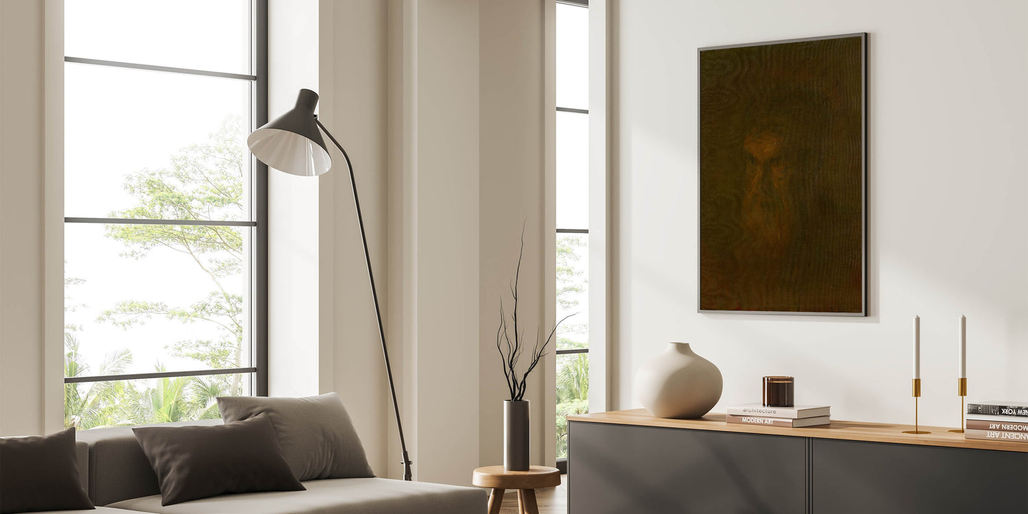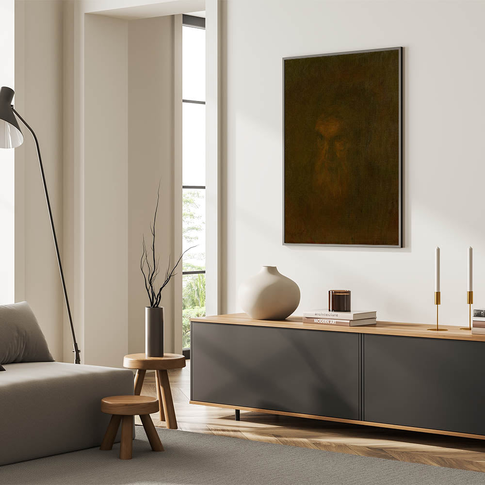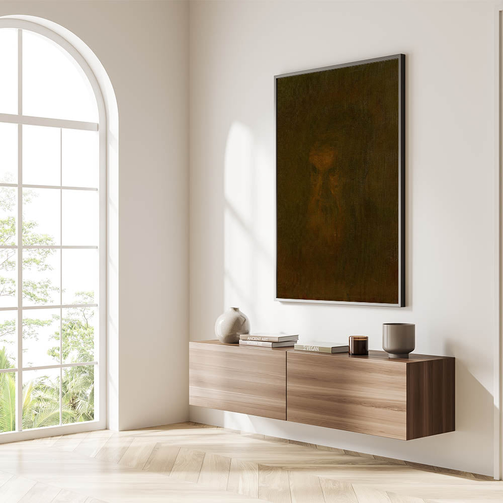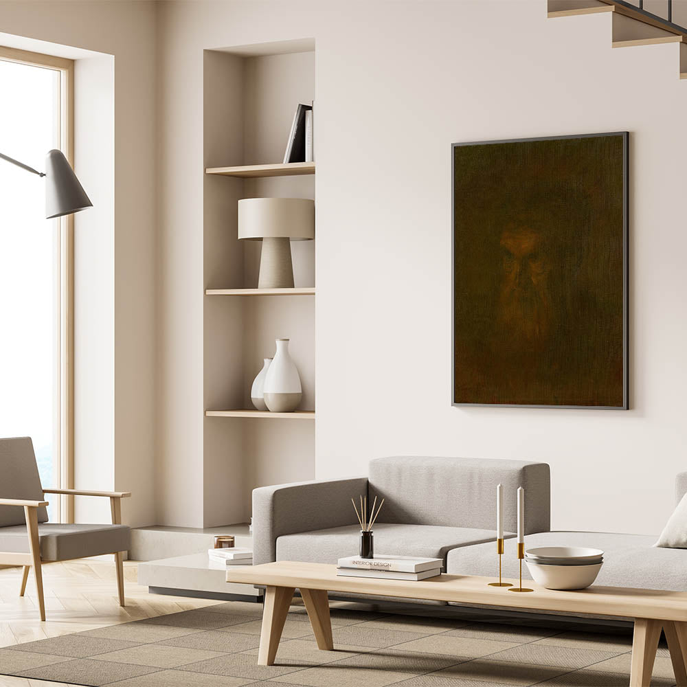 This portrait, with its enigmatic and meditative feel, adds a touch of intrigue and depth to any room. The dark tones and minimalist detail allow viewers to interpret the piece in a personal way, making it a compelling choice for those who appreciate the subtleties of Realism.