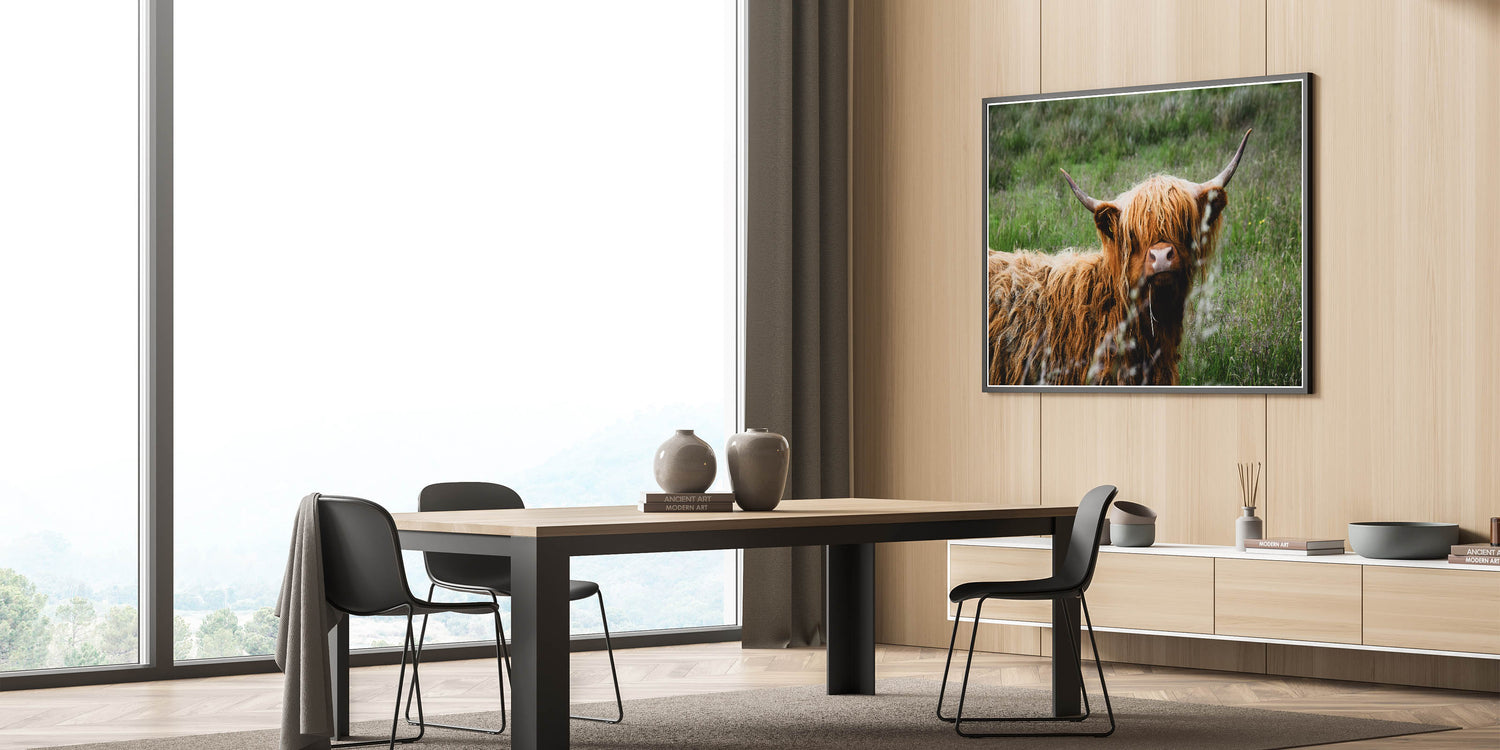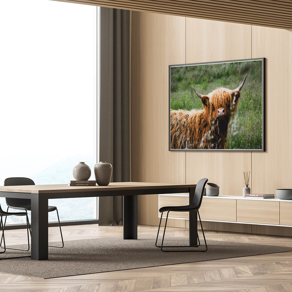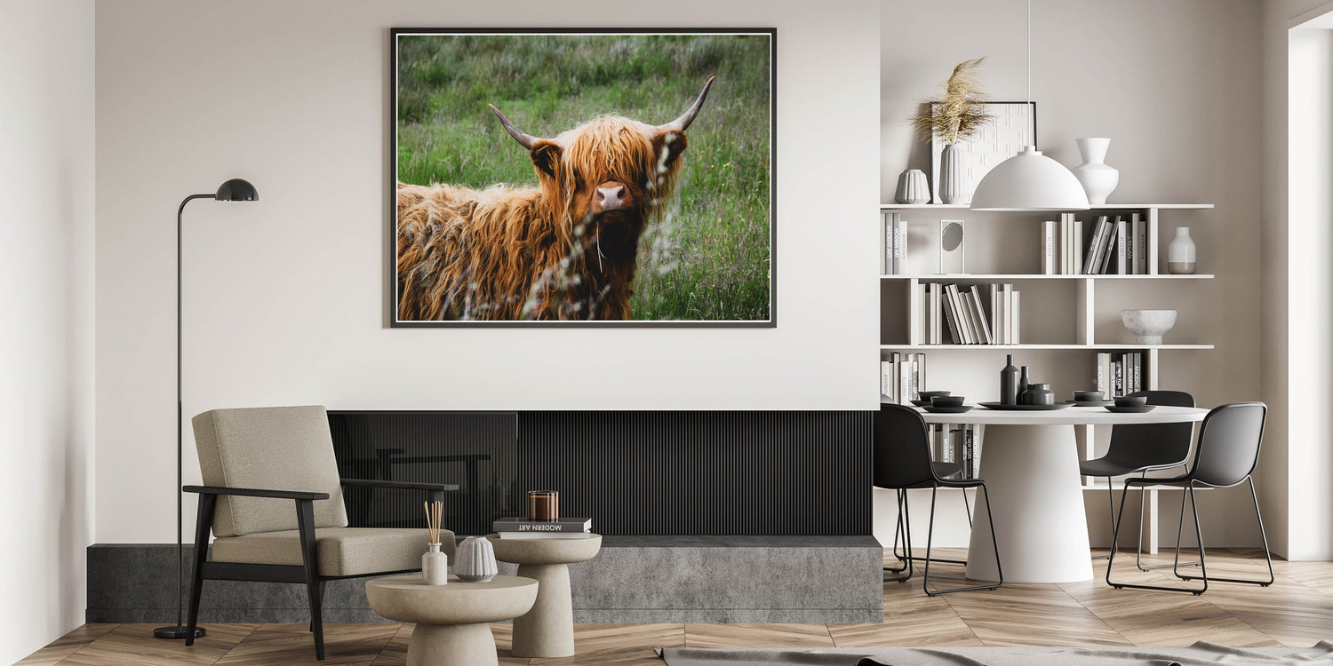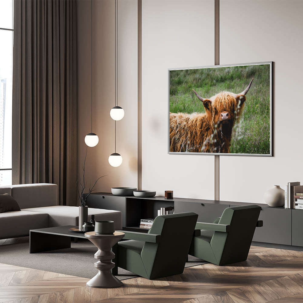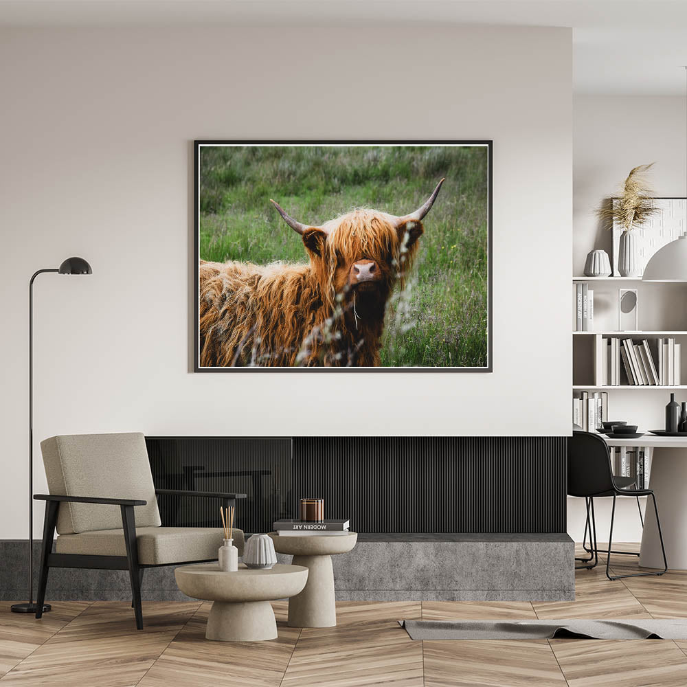 Bring the beauty of the countryside into your home with this charming highland cow wall art. The soft, earthy tones of the highland cow's fur against the vibrant green grass create a peaceful rural scene, perfect for adding a touch of rustic charm to any space. This artwork is ideal for farmhouse-style interiors, adding warmth and character to living rooms, kitchens, or hallways. The natural simplicity of the cow grazing in the field makes it a timeless piece for anyone who loves rustic home decor.