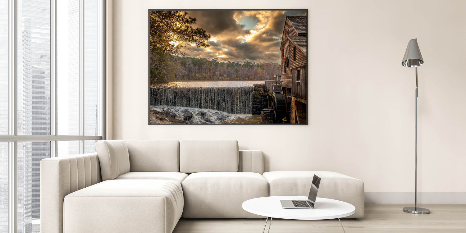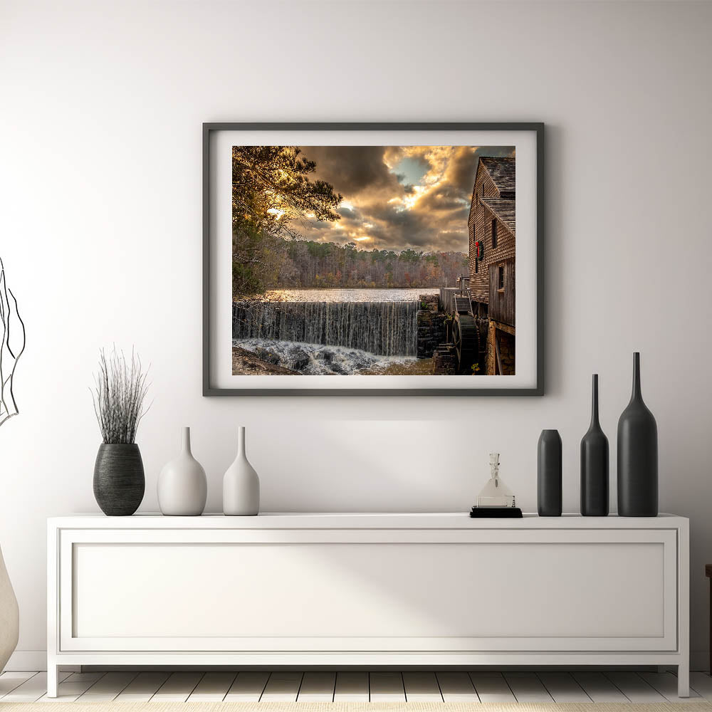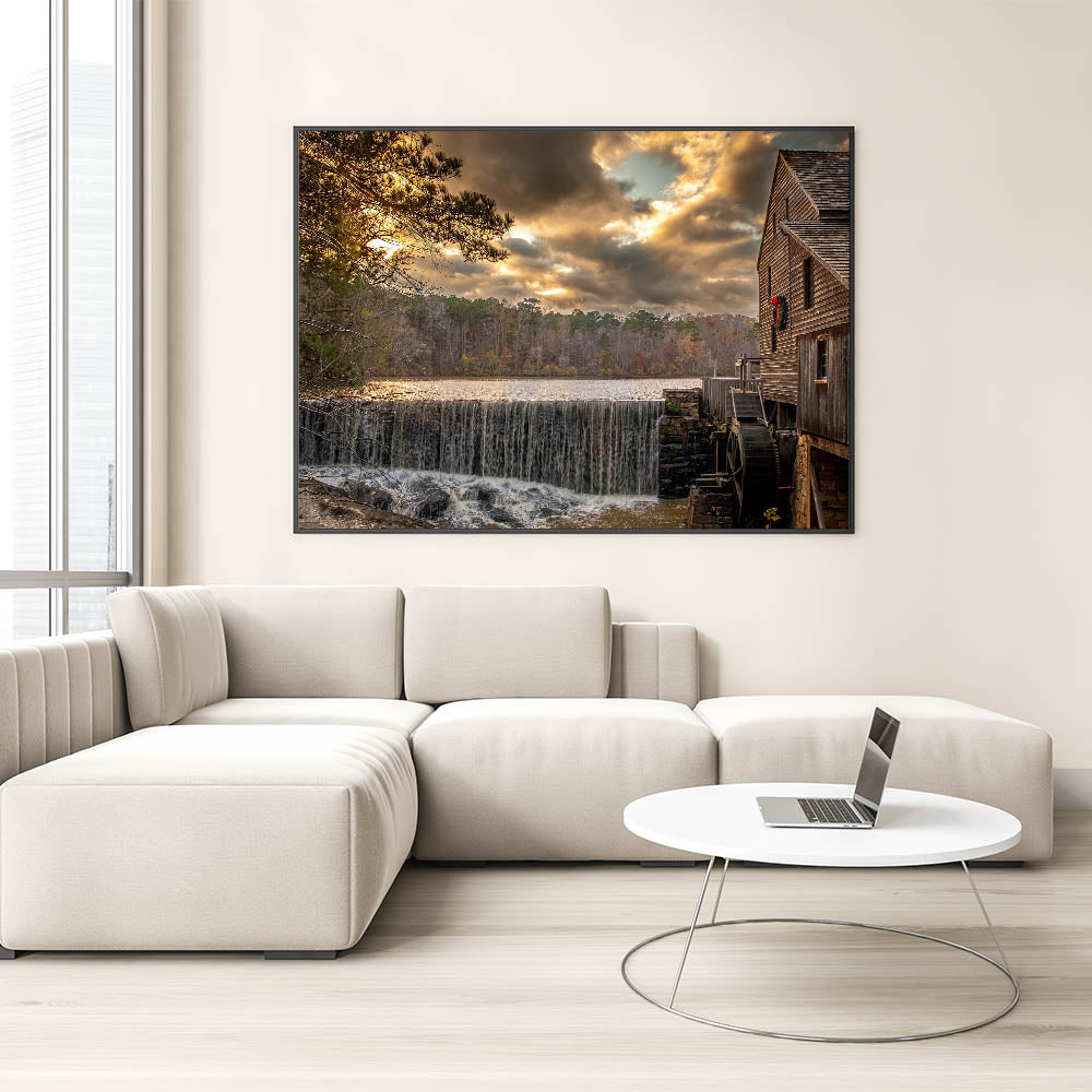 Capture the timeless beauty of Raleigh with this stunning wall art showcasing a historic mill and peaceful waterfall. The dramatic sky and rich colors of the surrounding landscape create a serene and rustic atmosphere, making this piece a perfect addition to your home or office decor. Part of our Raleigh City Art Collection, this artwork highlights the charm and history of North Carolina’s countryside.