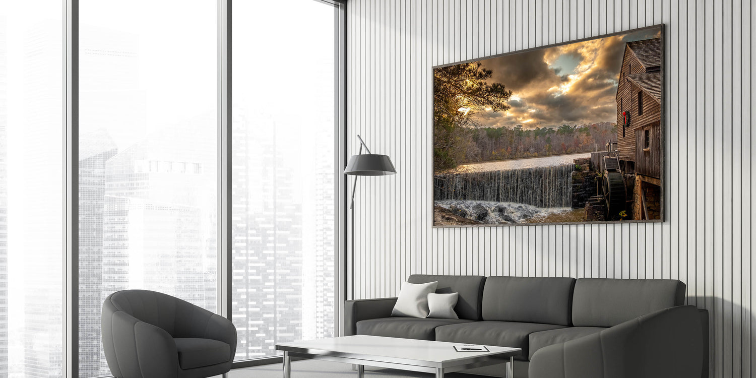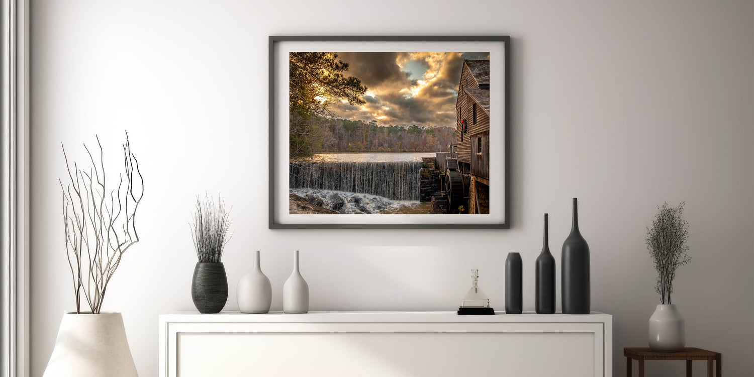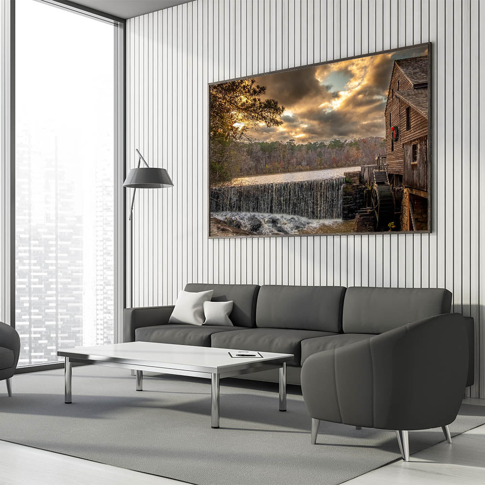 Capture the timeless beauty of Raleigh with this stunning wall art showcasing a historic mill and peaceful waterfall. The dramatic sky and rich colors of the surrounding landscape create a serene and rustic atmosphere, making this piece a perfect addition to your home or office decor. Part of our Raleigh City Art Collection, this artwork highlights the charm and history of North Carolina’s countryside.