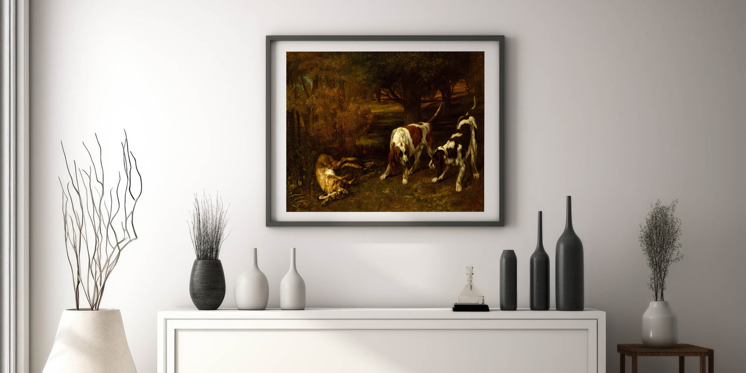 Capture the intensity and beauty of the natural world with "Hunting Dogs with Dead Hare" by Gustave Courbet. This detailed Realism art print presents a captivating scene of two hunting dogs encountering a hare, set against a richly forested background. Ideal for those who appreciate classic hunting scenes and animal art, this piece adds depth and a touch of rustic charm to any room.