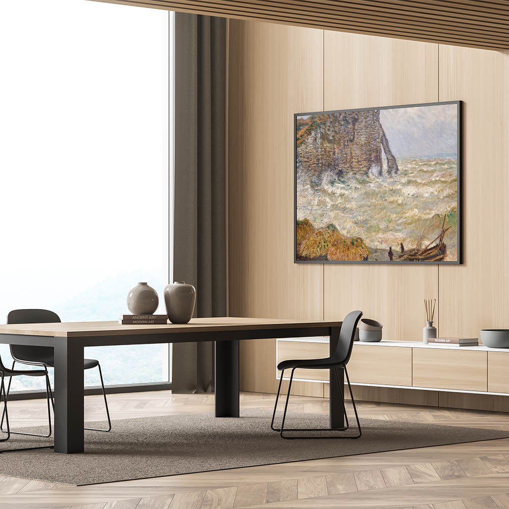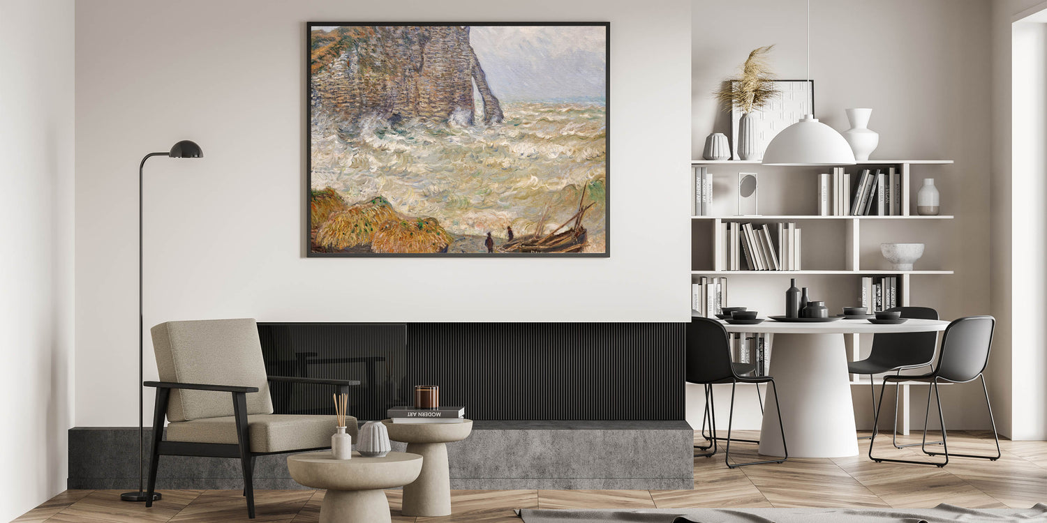Experience the raw power of nature with this Impressionist wall art inspired by Claude Monet's Stormy Sea in Étretat. This painting captures the dramatic cliffs of Étretat on a windy day, with crashing waves and turbulent skies reflecting the untamed energy of the sea. Monet’s dynamic brushstrokes and earthy tones create a striking sense of movement, making this artwork a bold statement piece.