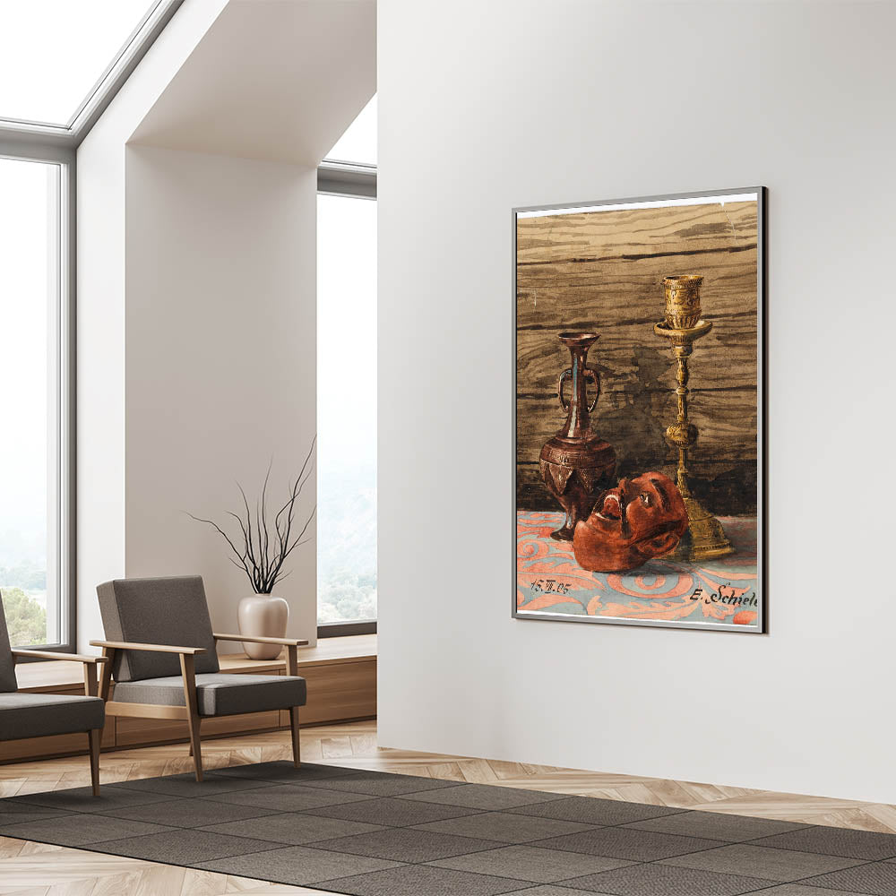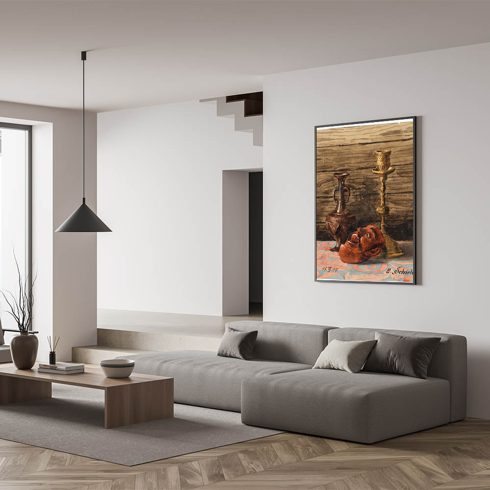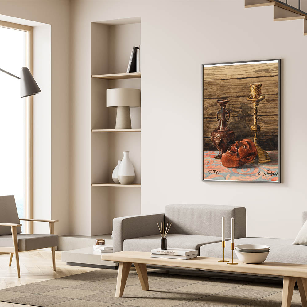 Add a touch of vintage sophistication to your space with this Art Deco-inspired still life featuring a detailed composition of a vase, a theatrical mask, and a candlestick. The artwork’s warm, earthy tones of brown and gold evoke a sense of timeless elegance, while the textured background and patterned surface add depth and character. Ideal for those who appreciate classic still-life compositions, this piece brings a refined, antique aesthetic to any room.