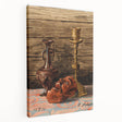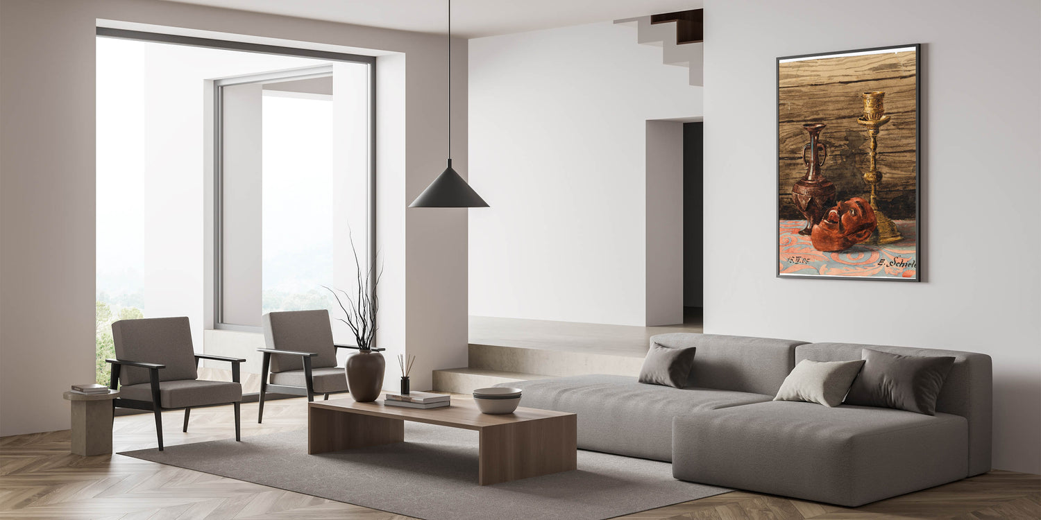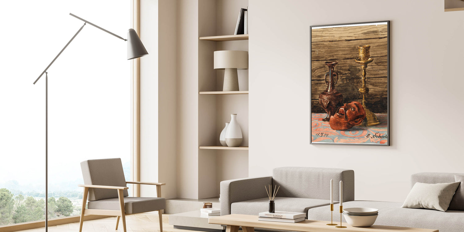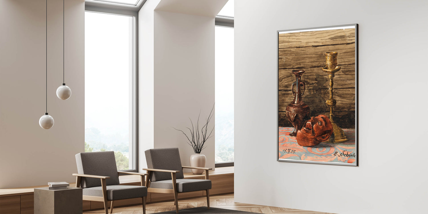 Add a touch of vintage sophistication to your space with this Art Deco-inspired still life featuring a detailed composition of a vase, a theatrical mask, and a candlestick. The artwork’s warm, earthy tones of brown and gold evoke a sense of timeless elegance, while the textured background and patterned surface add depth and character. Ideal for those who appreciate classic still-life compositions, this piece brings a refined, antique aesthetic to any room.