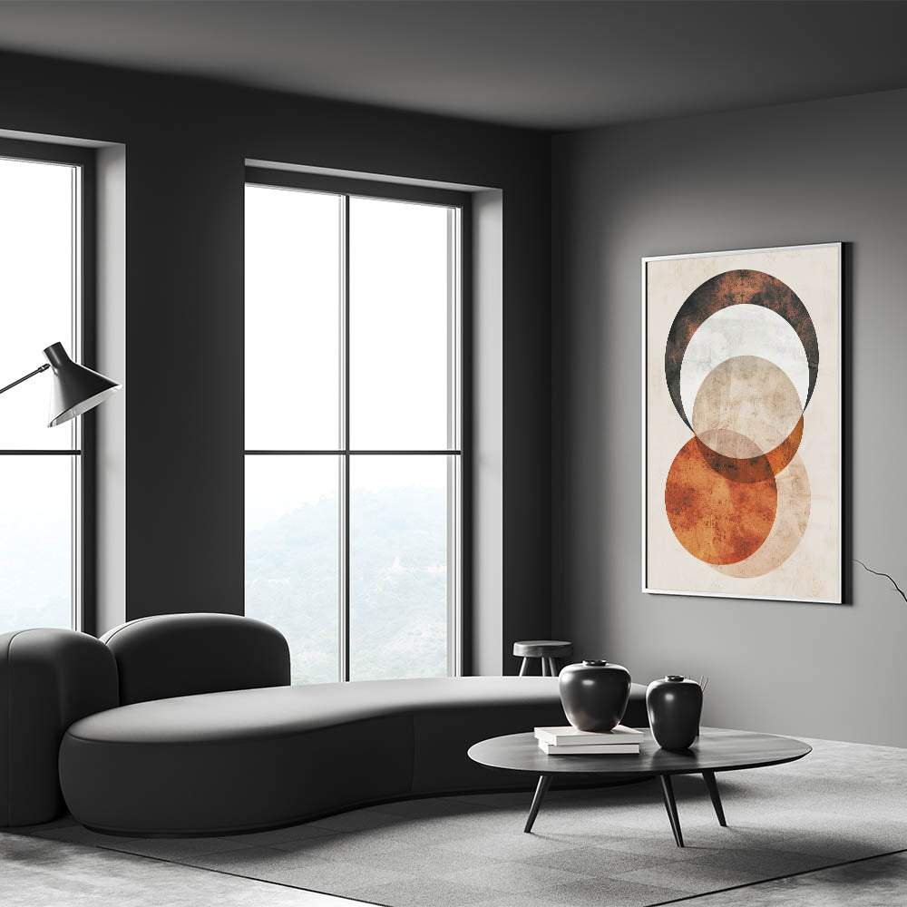Bring warmth and sophistication to your decor with this minimalist abstract circles artwork in earthy tones. The overlapping circles in shades of orange, brown, and black create a layered, textured look that adds depth and interest to any room. Perfect for modern and minimalist interiors, this piece combines simplicity with a striking color palette to make a bold statement.