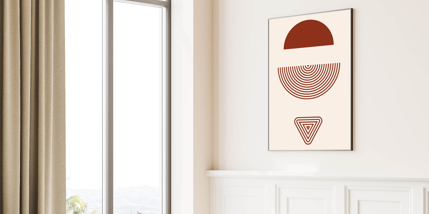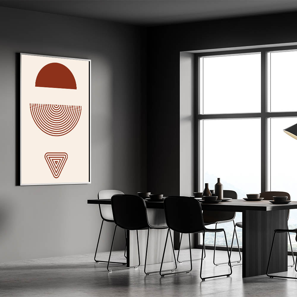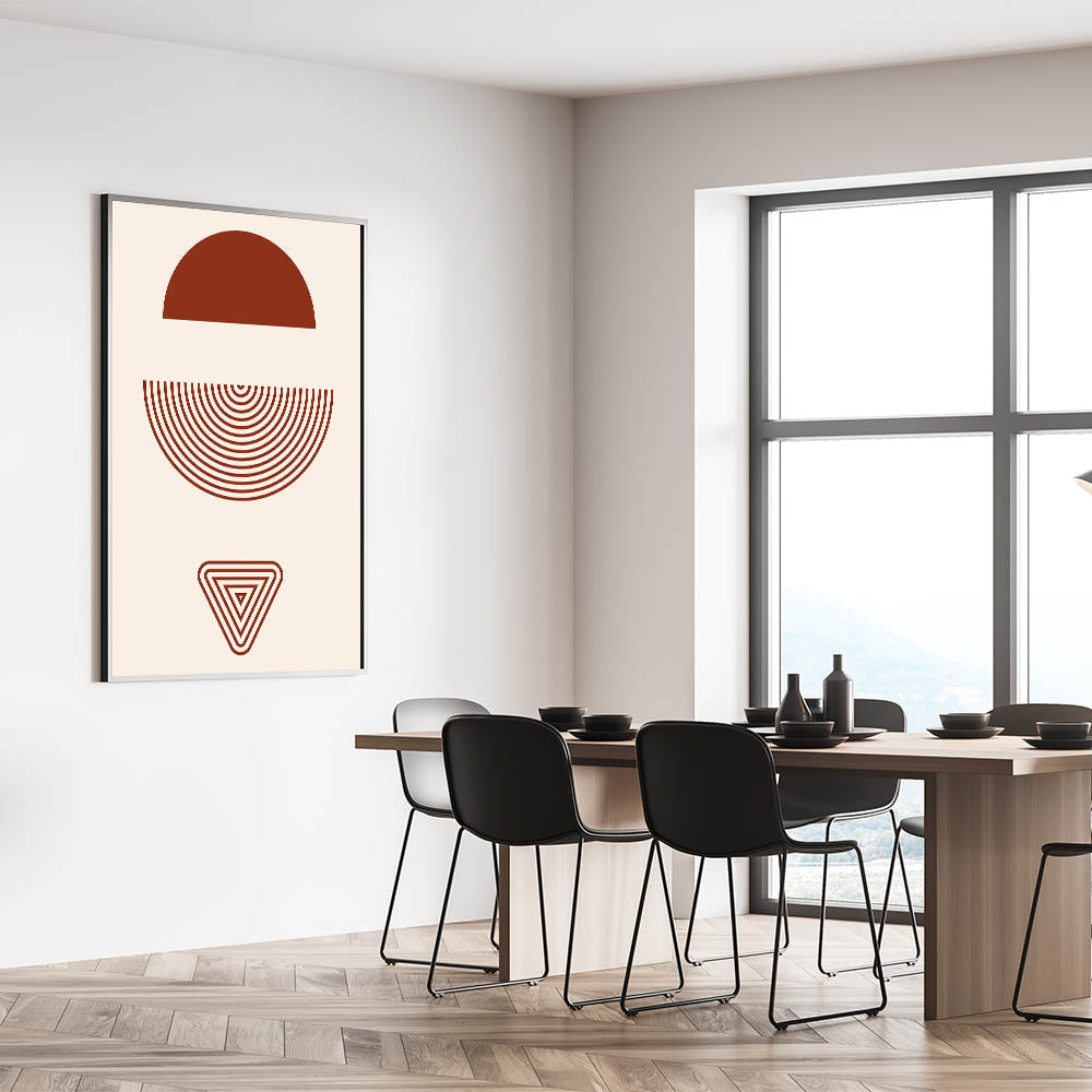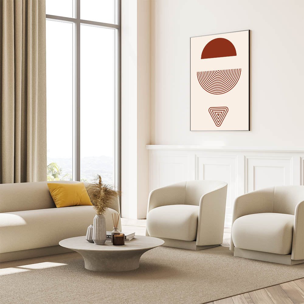 Elevate your space with this minimalist Bohemian wall art, featuring geometric shapes in a warm terracotta hue. The abstract, clean design brings a modern boho vibe, making it a perfect piece for anyone who appreciates simplicity and elegance. With its earthy tones and sleek patterns, this boho decor canvas will effortlessly complement a variety of interior styles, from contemporary to eclectic.