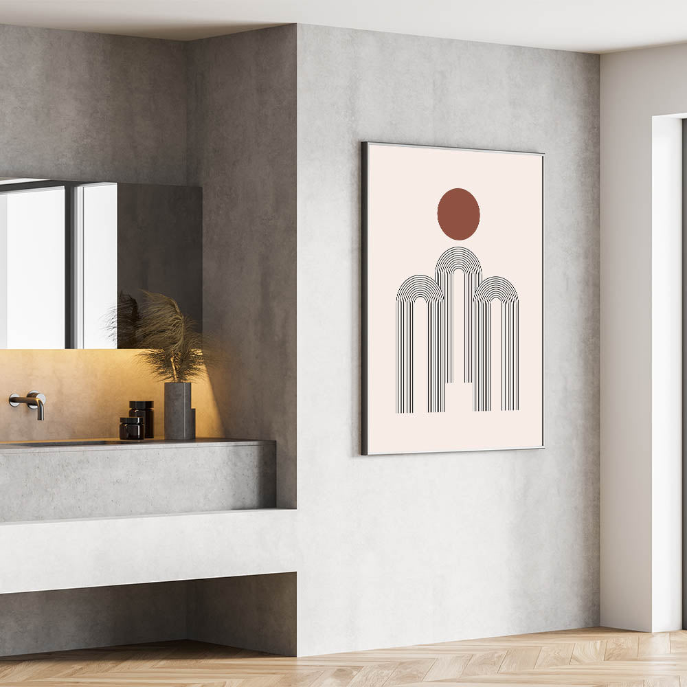Introduce a sense of calm and balance to your home with this bohemian wall art featuring a minimalist geometric arch design. The elegant black lines flow into an arch formation, complemented by a bold brown circle, creating a harmonious blend of modern simplicity and boho-chic style. This boho decor canvas is perfect for those looking to add a sleek and contemporary touch to their interior while keeping a warm, natural vibe.
